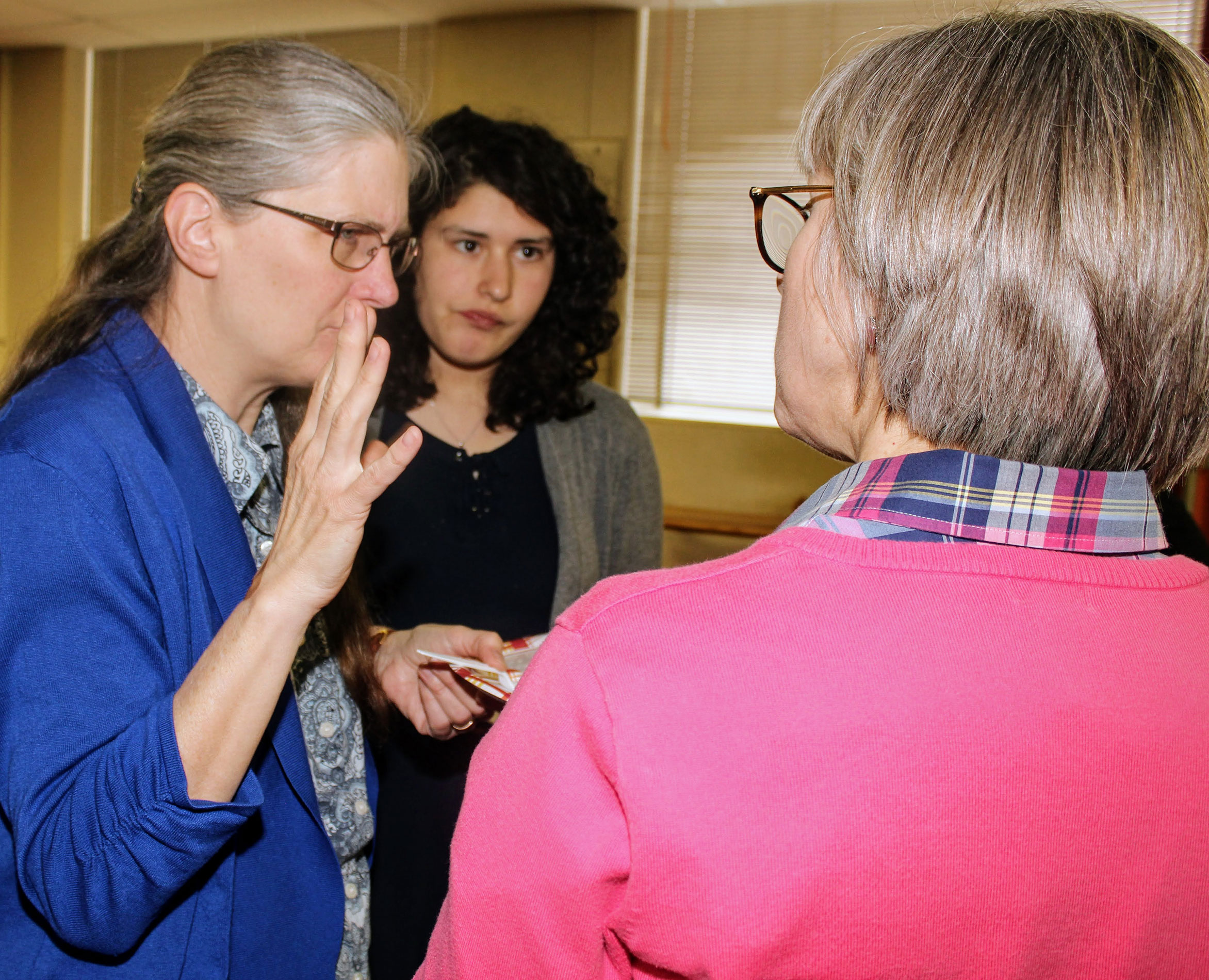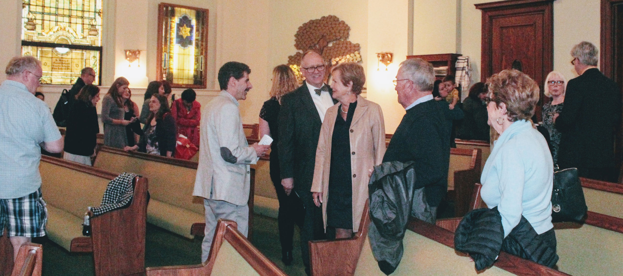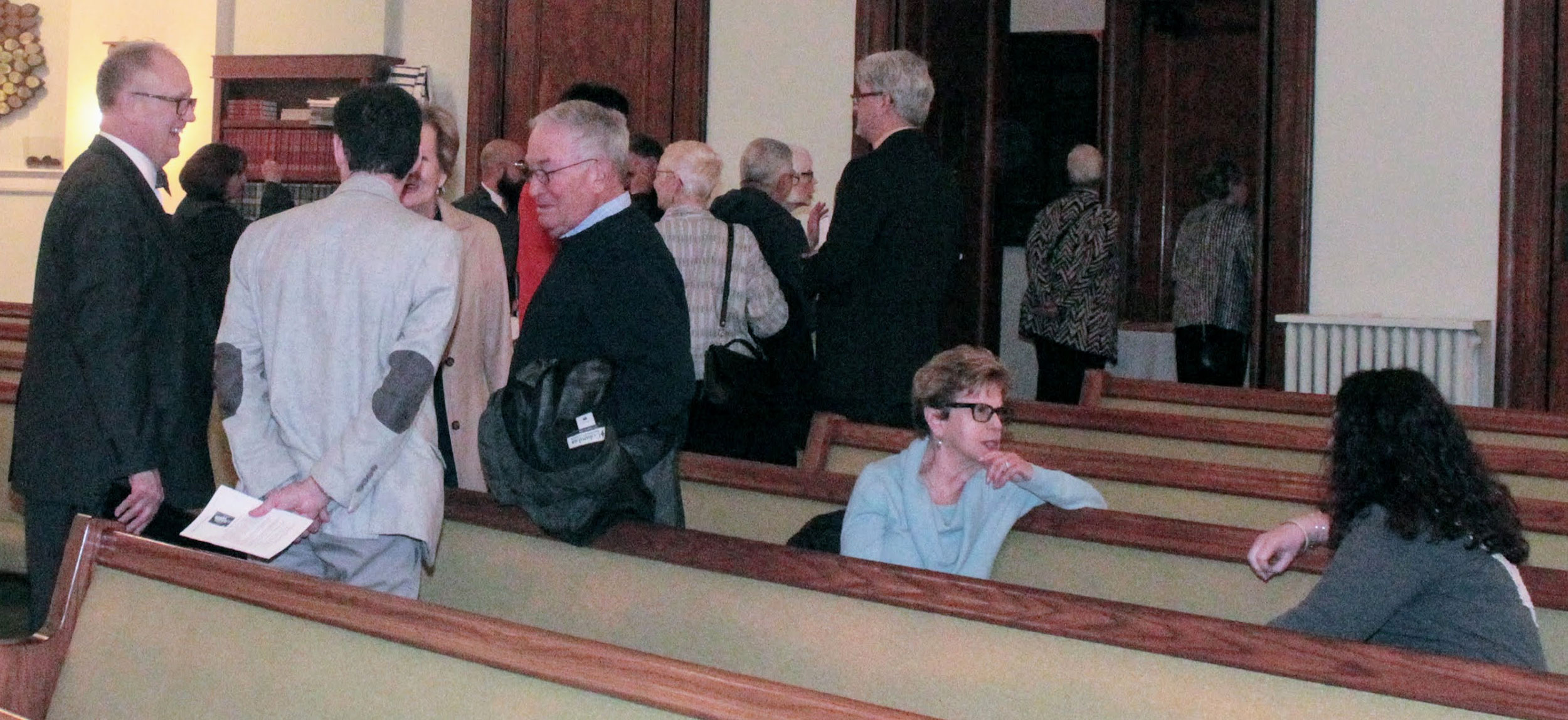 Audience members pause for conversation in the Temple sanctuary after Agnes Schwartz completes her lecture.