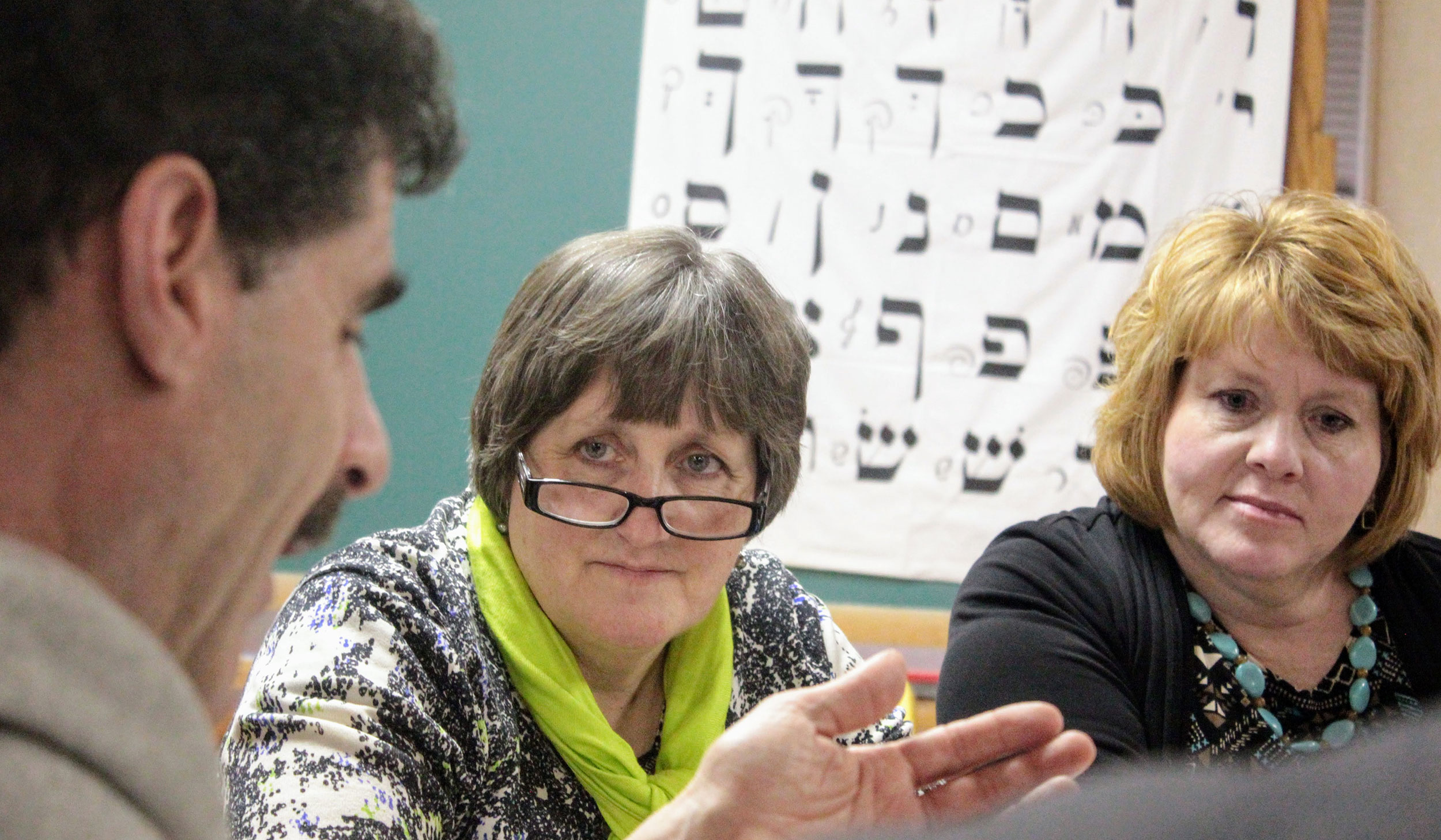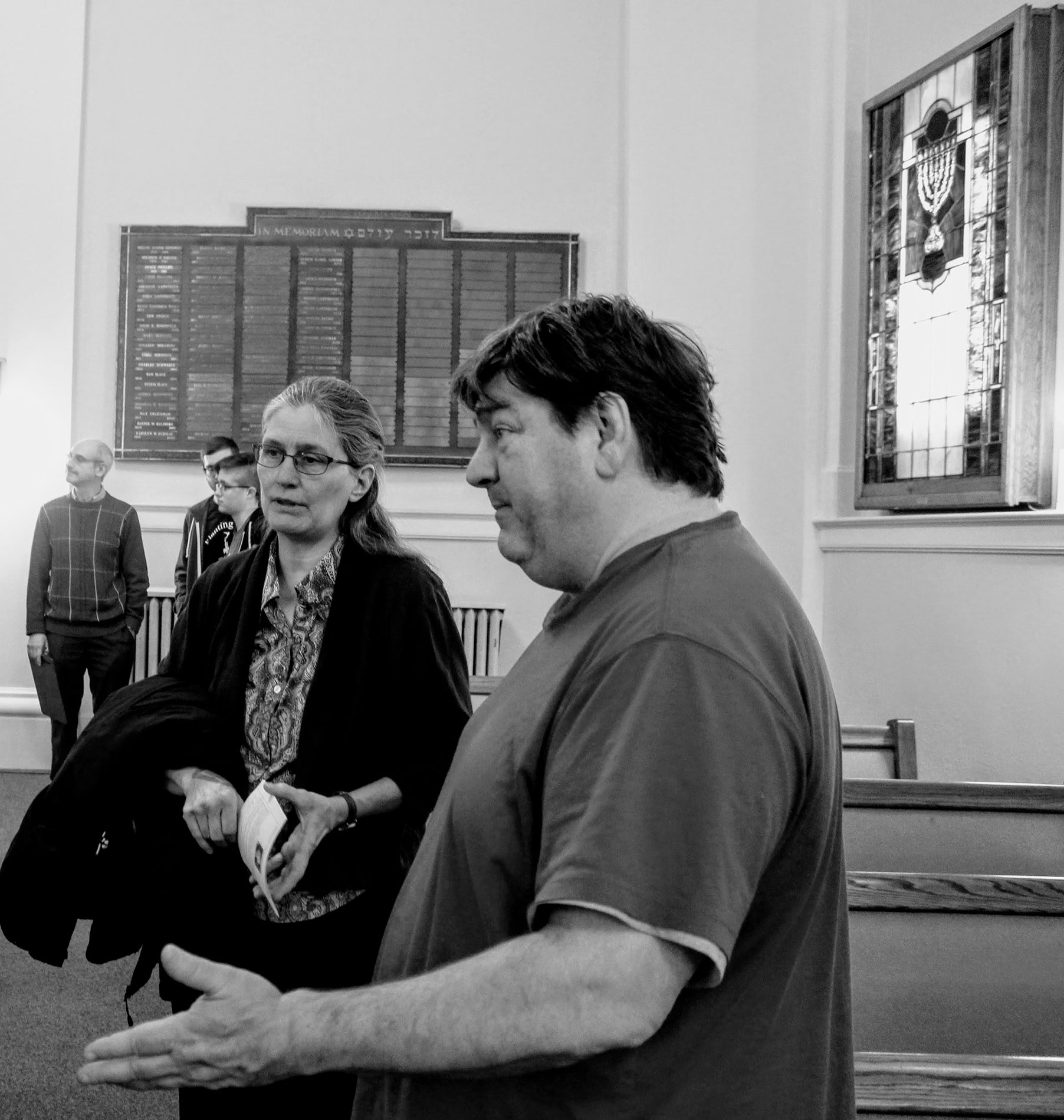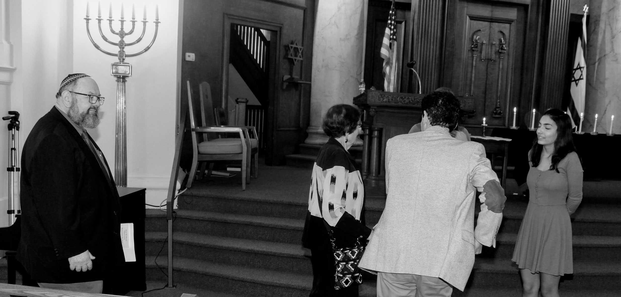 Audience members pause for conversation in the Temple sanctuary after Agnes Schwartz completes her lecture.