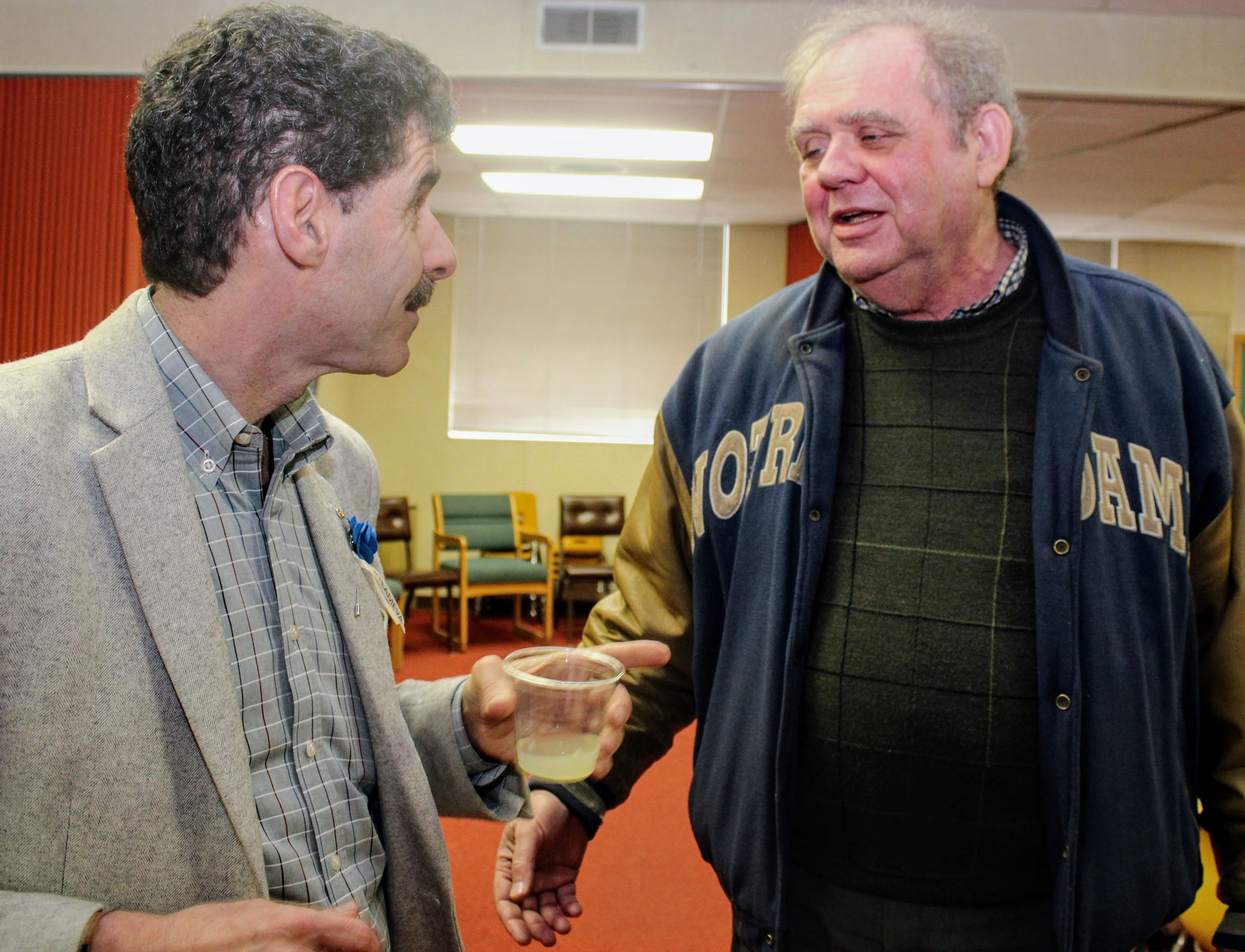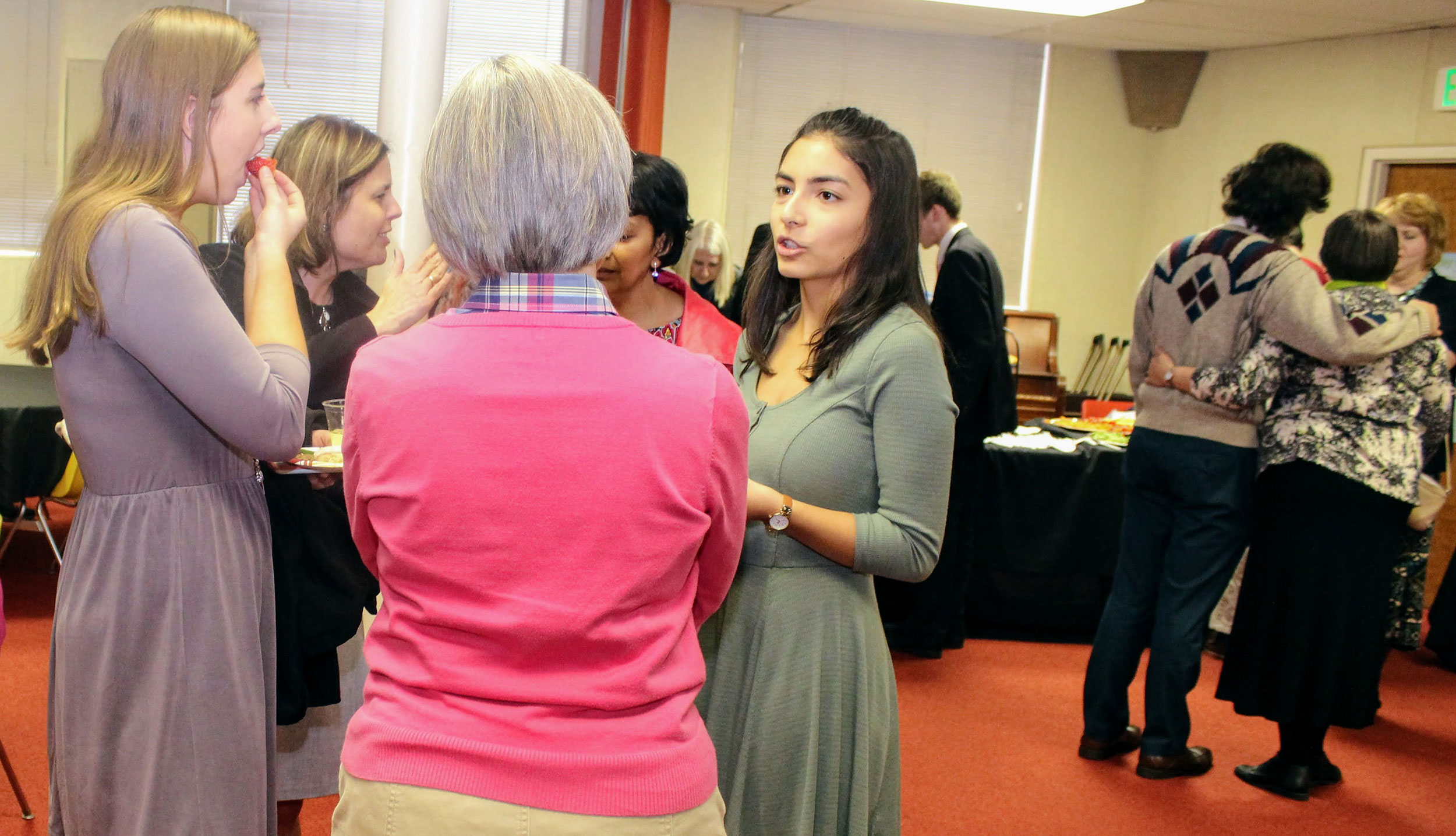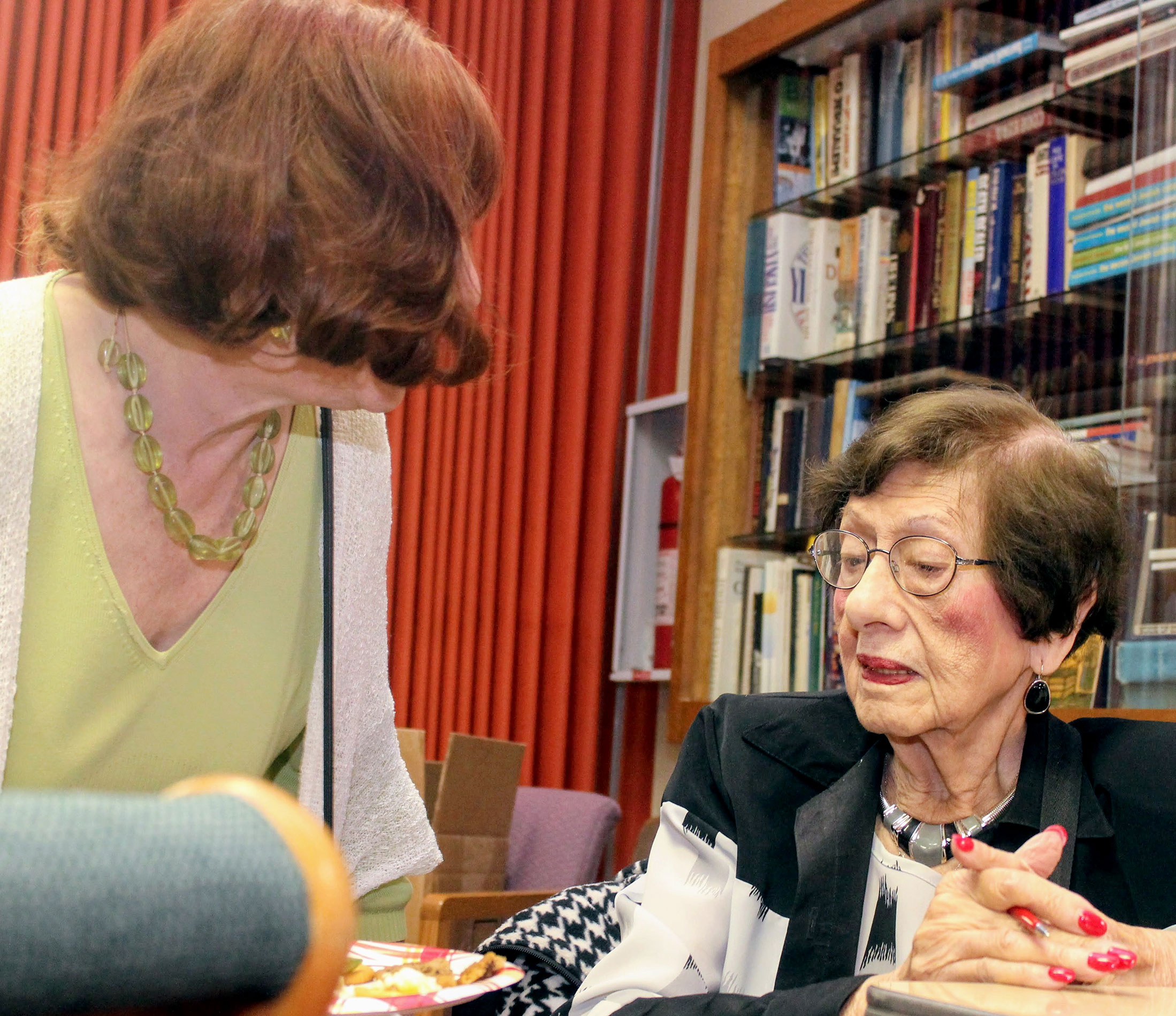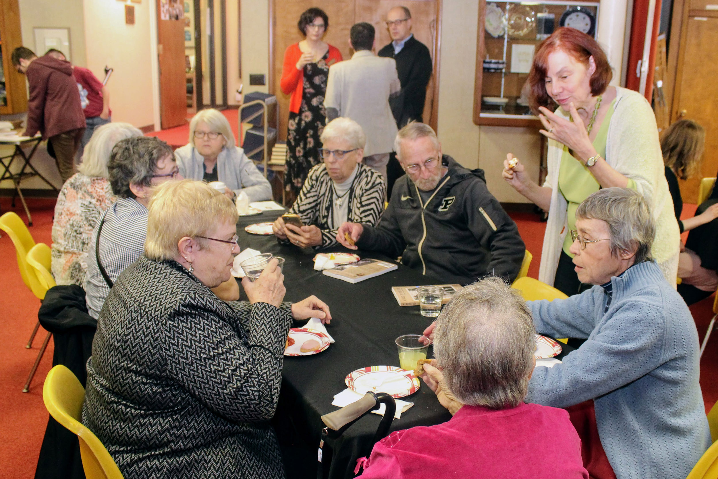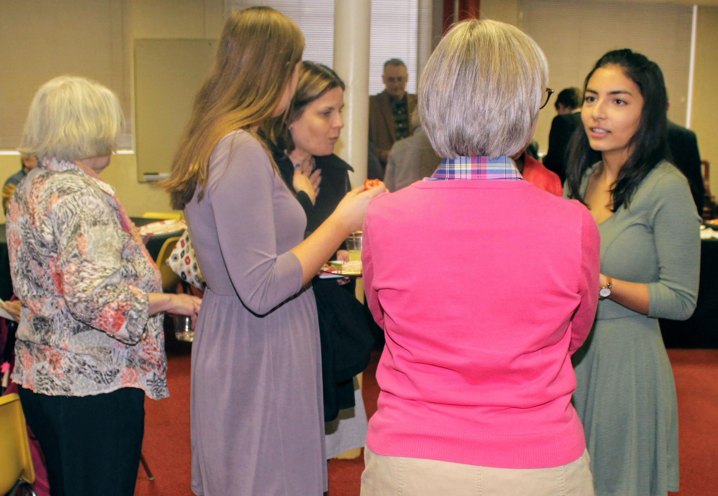 Guests visit during a reception to honor Agnes Schwartz and mark the Yom HaShoah event.