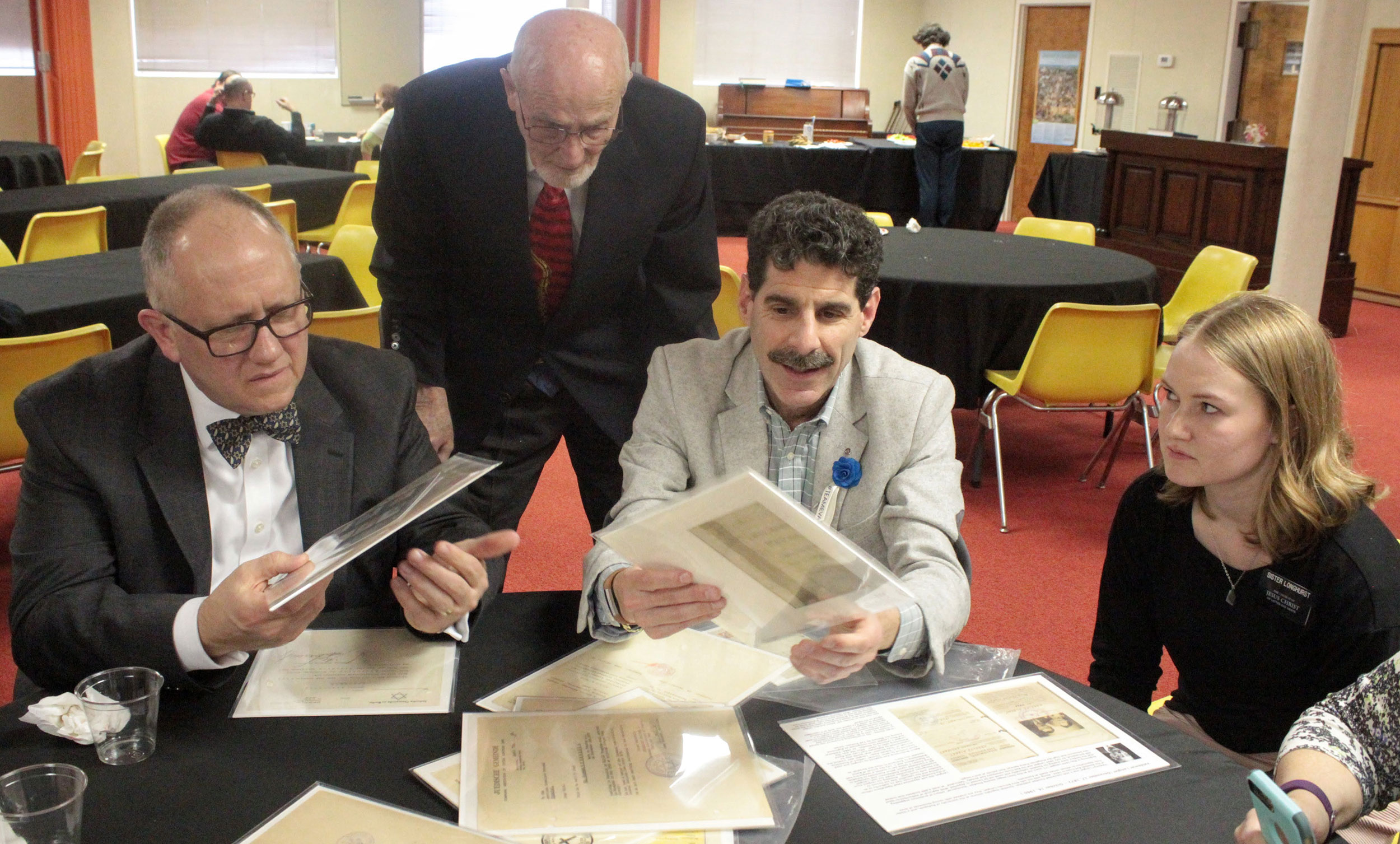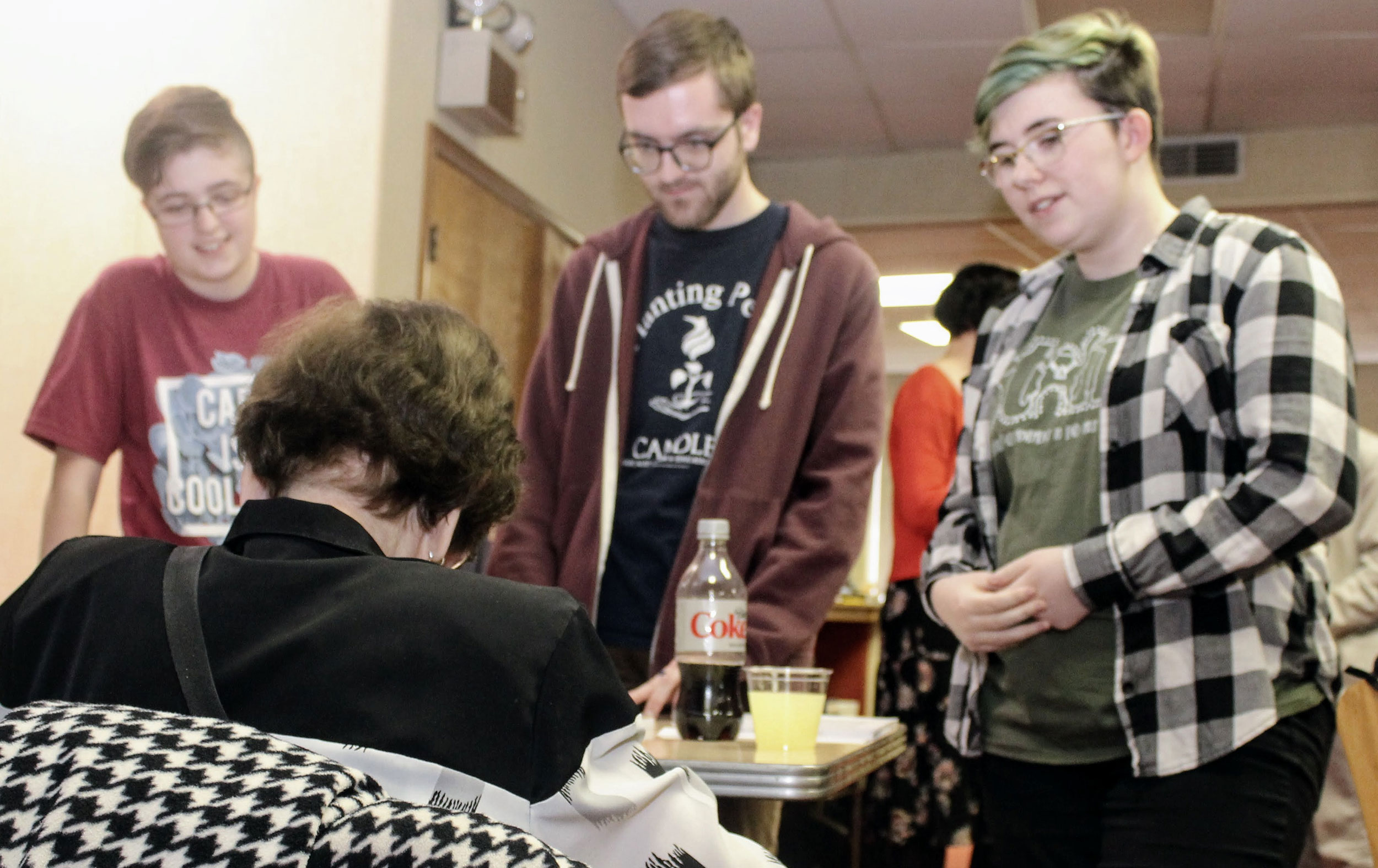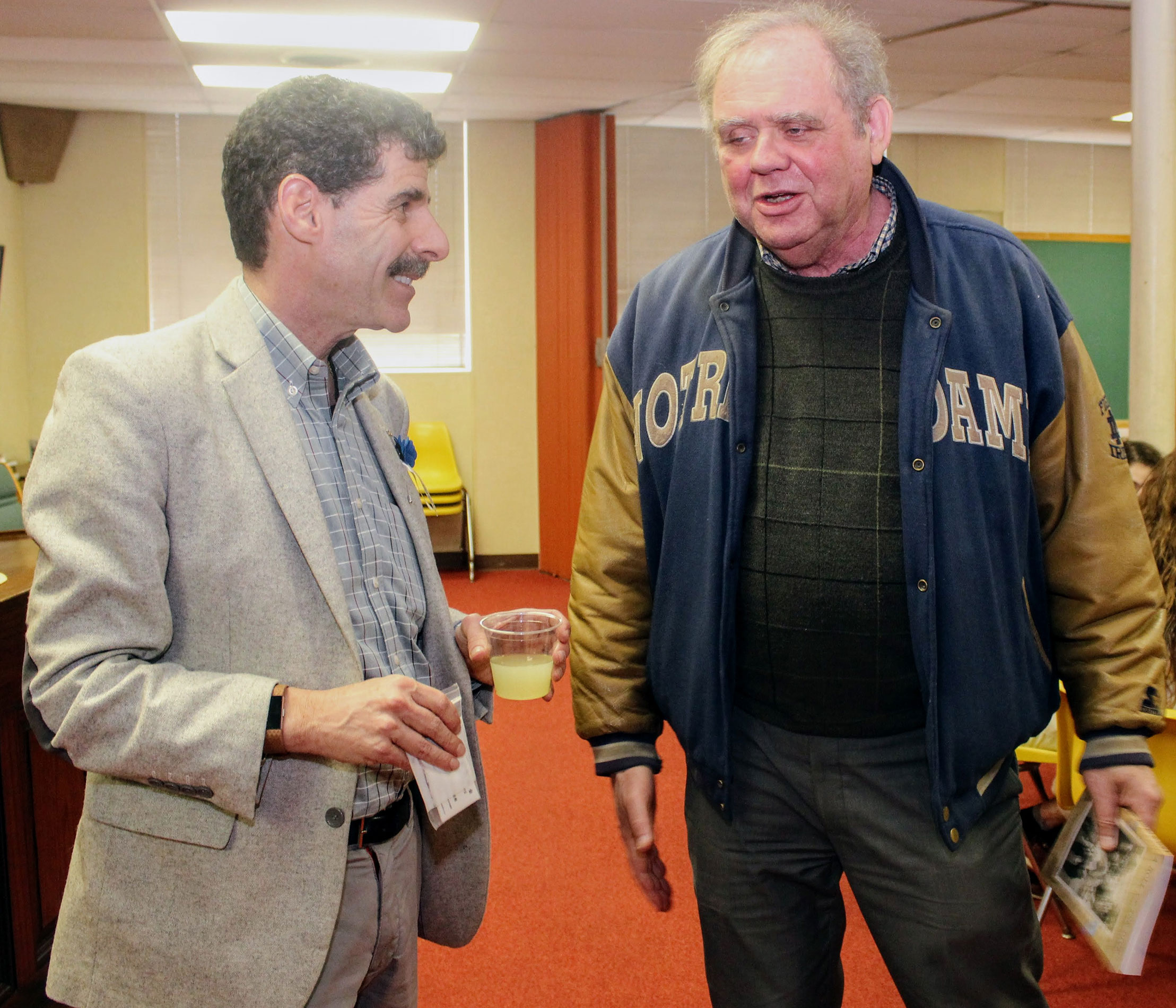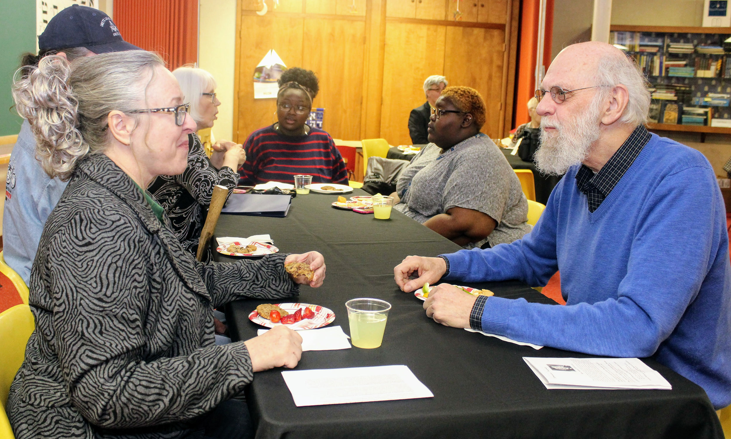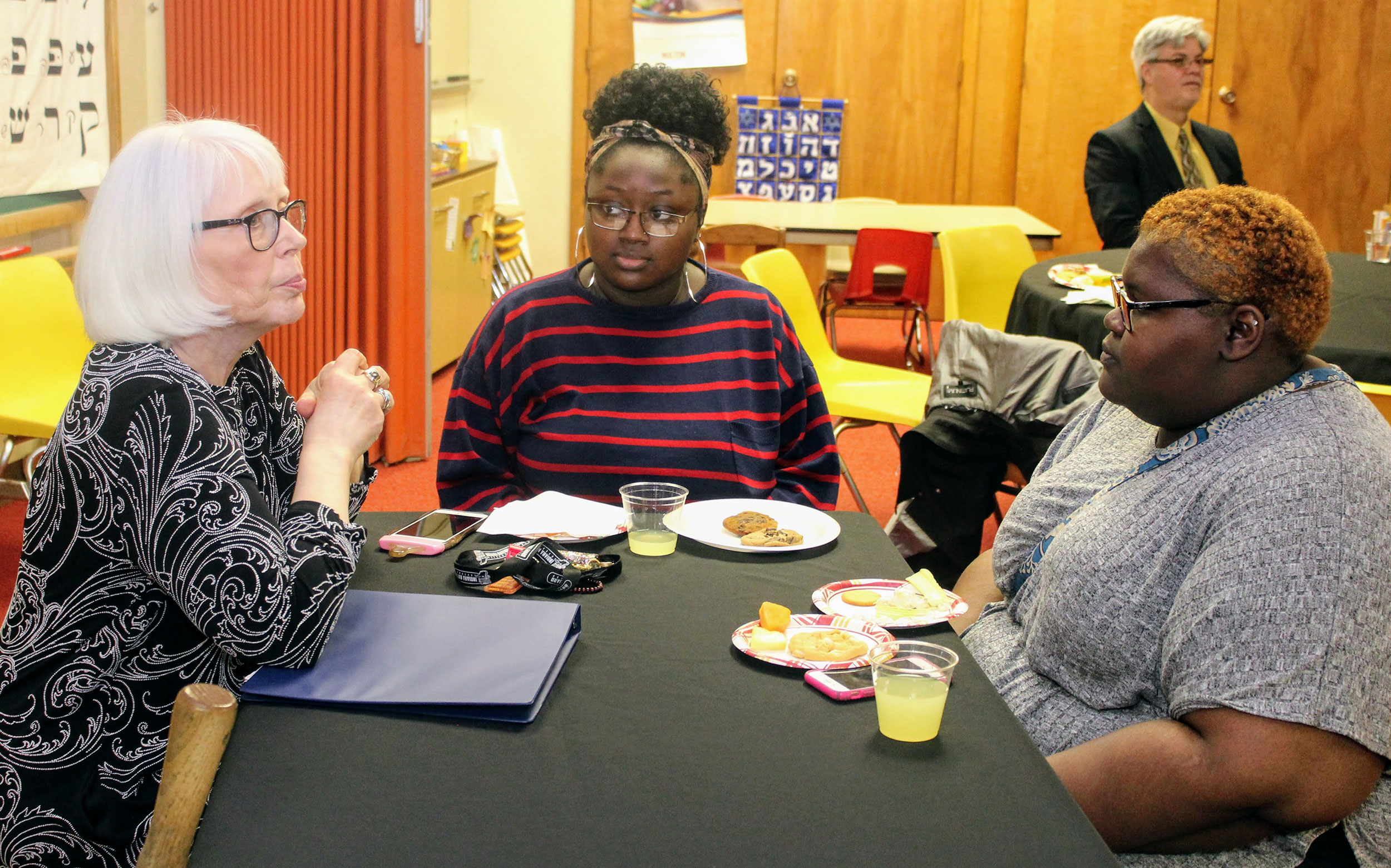 Guests visit during a reception to honor Agnes Schwartz and mark the Yom HaShoah event.