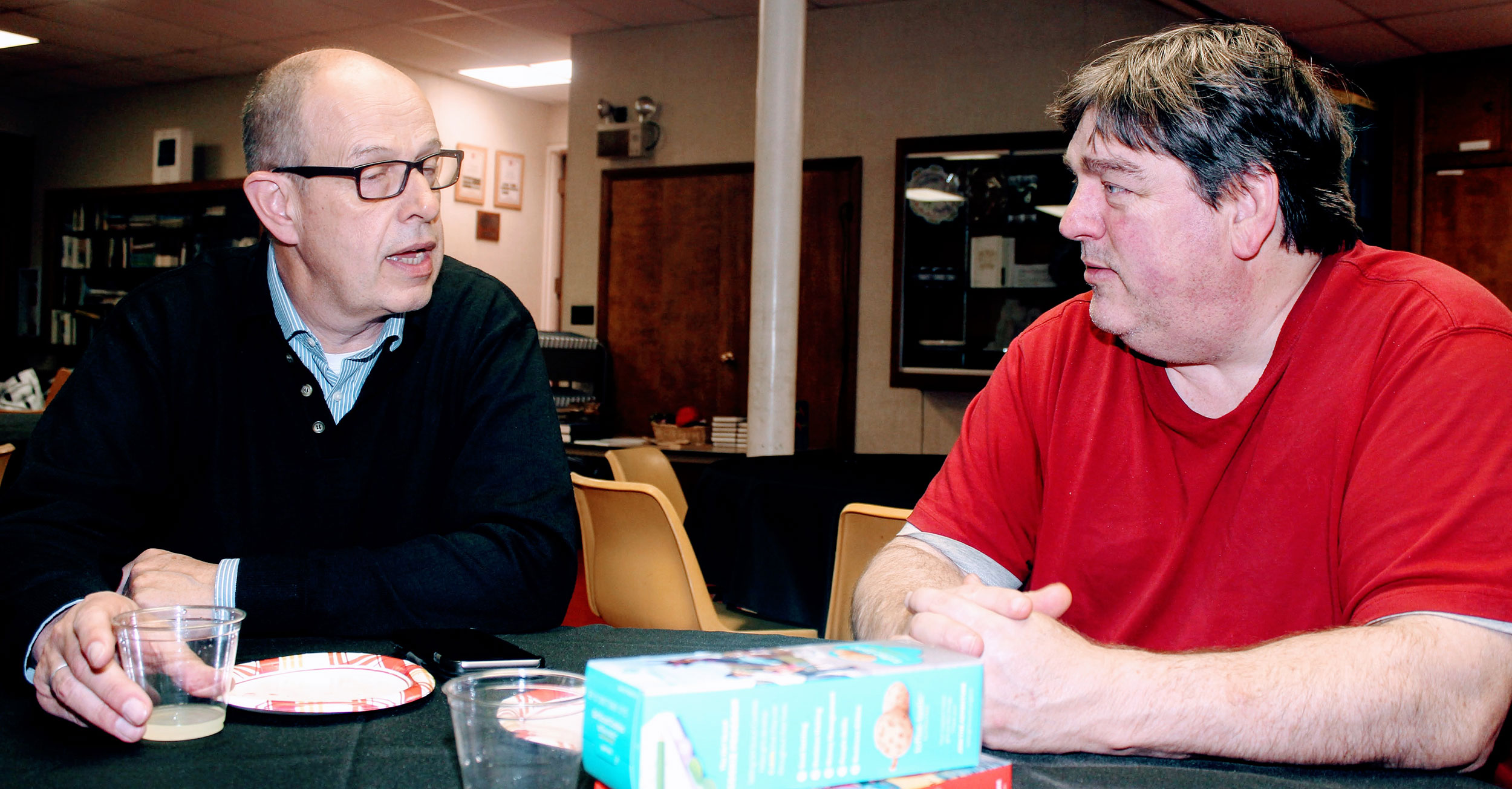 Scott visits with Michael Woerle, who visited from Hamburg, Germany.