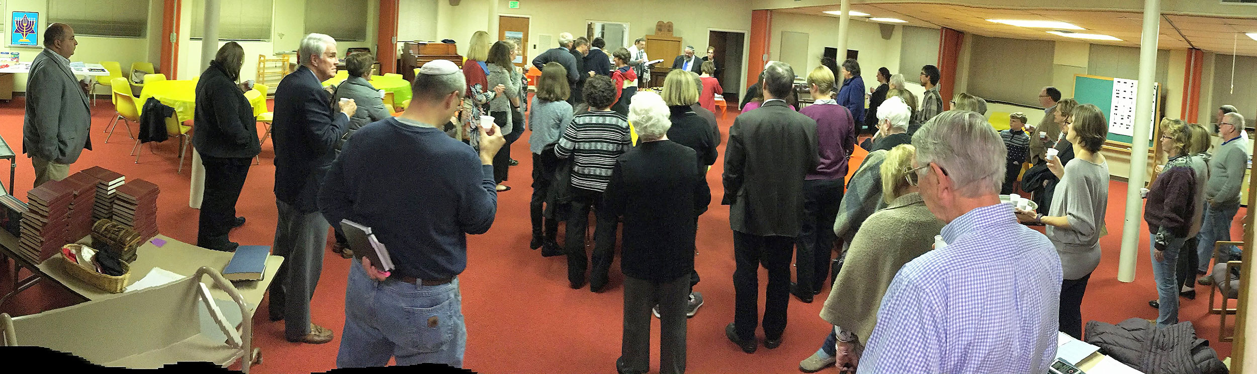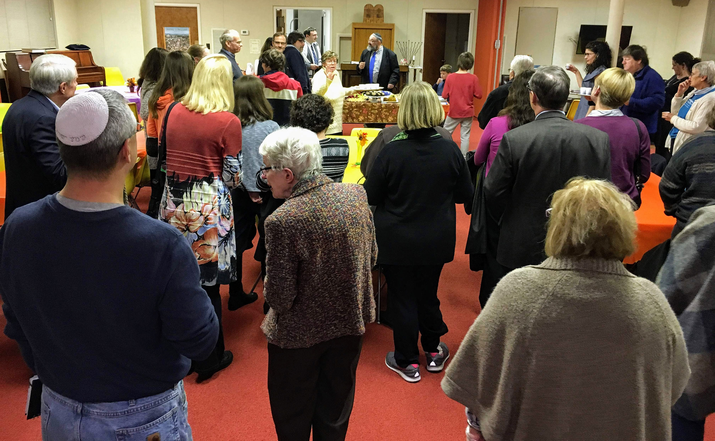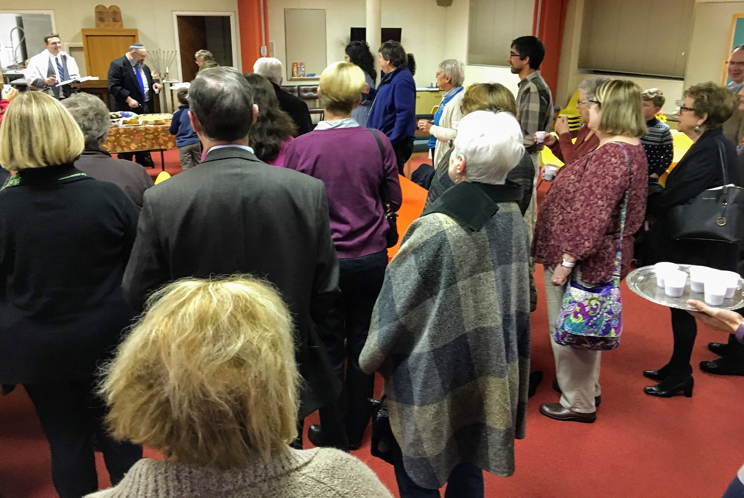 Congregants and guests filled the Vestry Room to hear Student Rabbi Jonathan Falco conduct the kiddush and hamotzi.