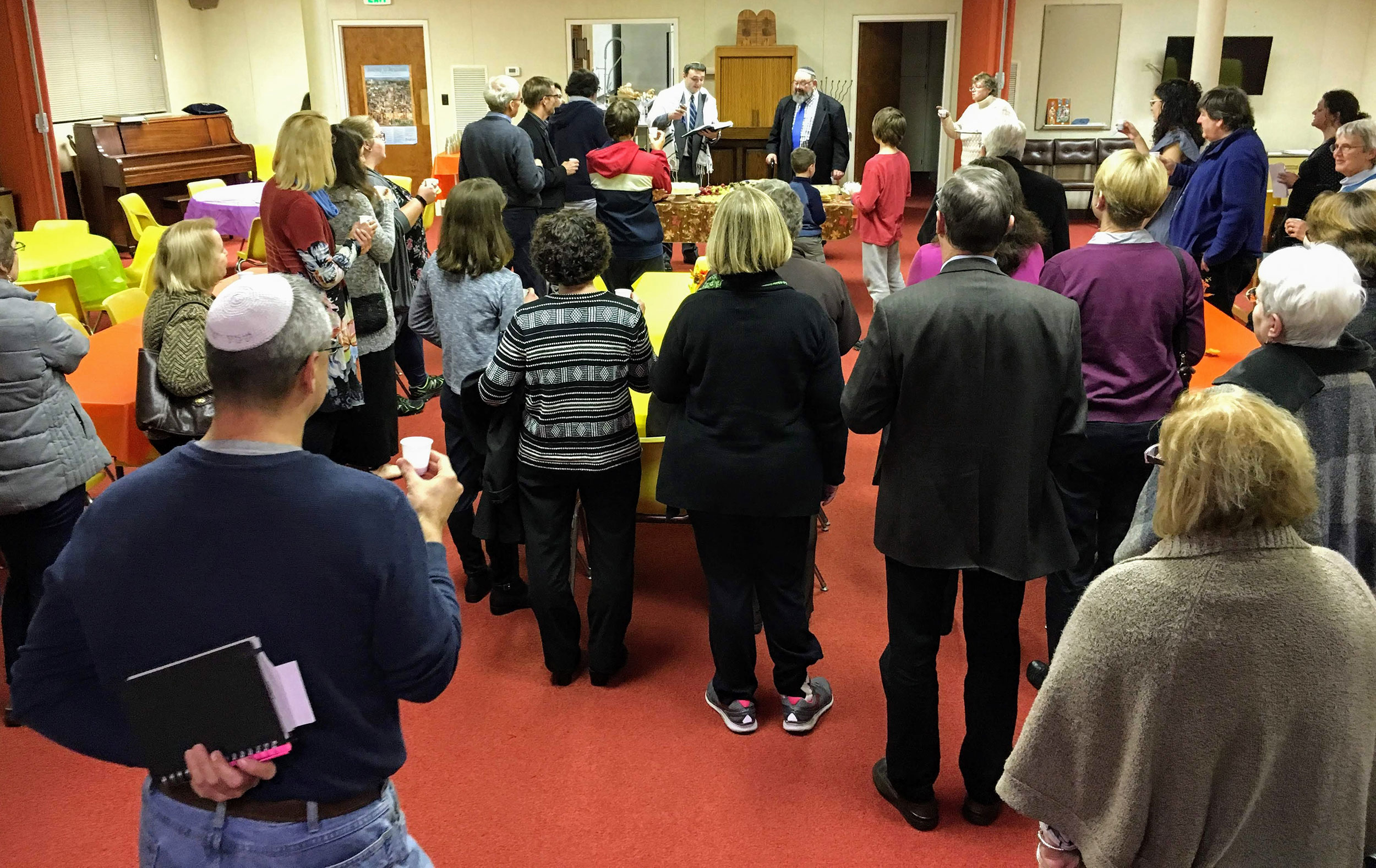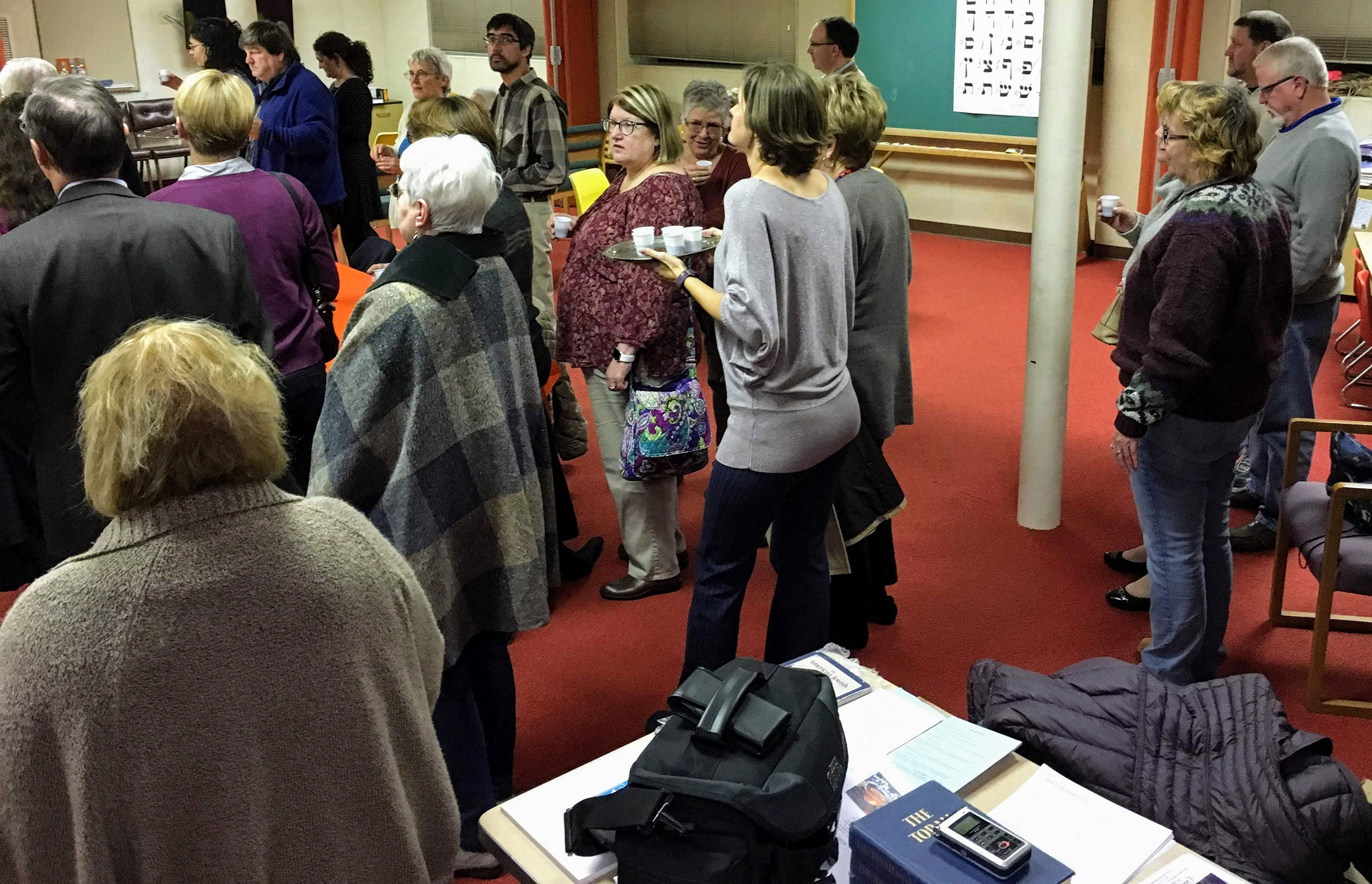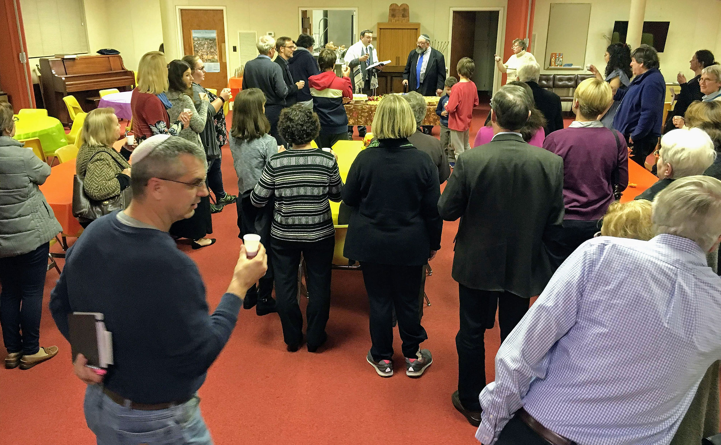 Congregants and guests filled the Vestry Room to hear Student Rabbi Jonathan Falco conduct the kiddush and hamotzi.