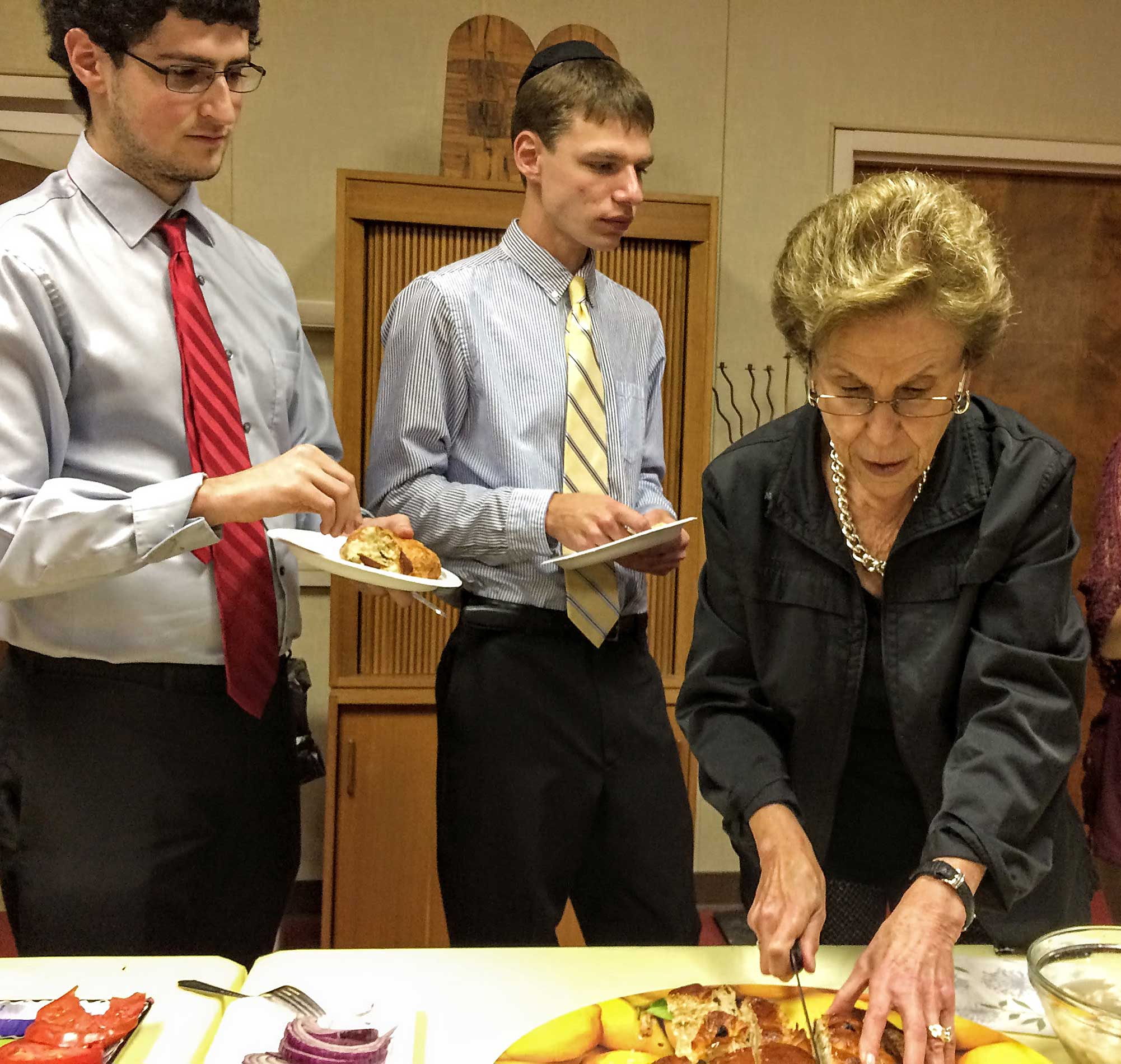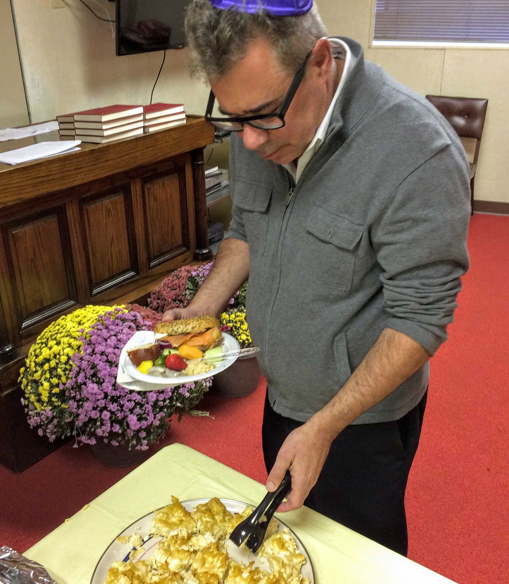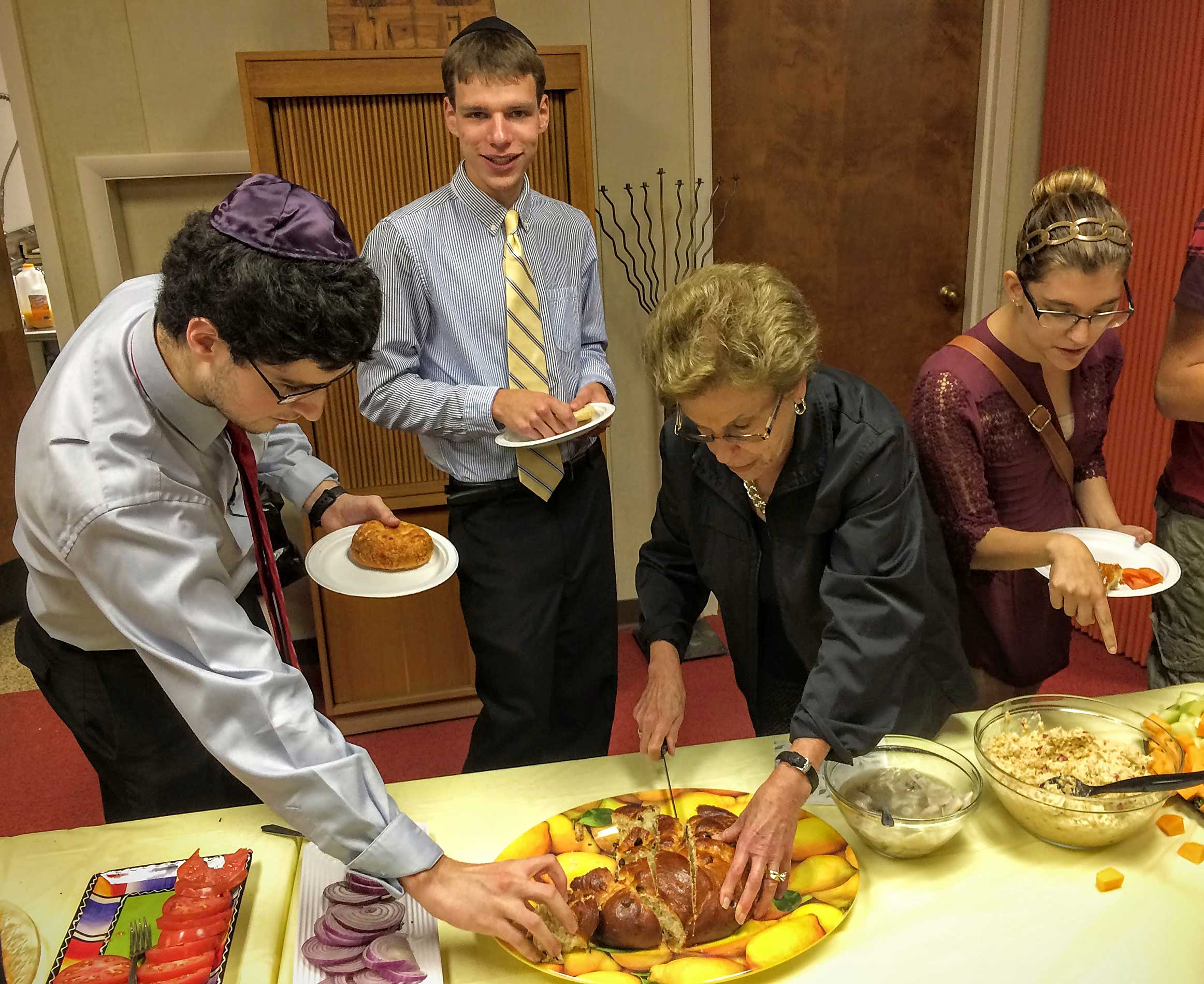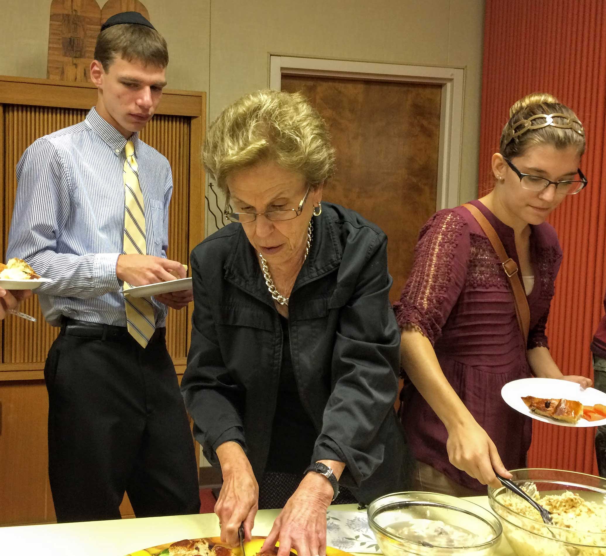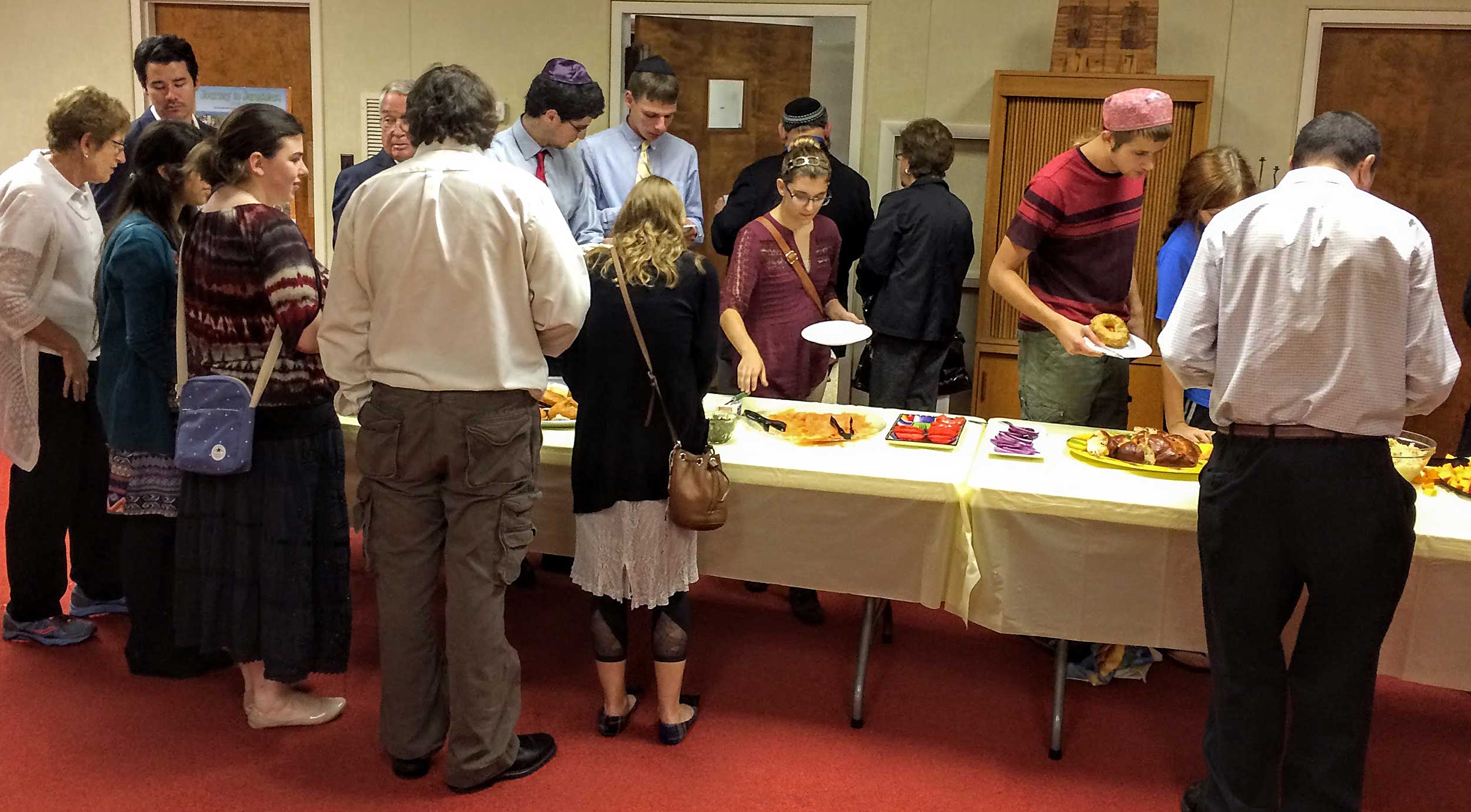 This year, repentant and ravenous worshipers joined Student Rabbi Aaron Rozovsky in the Vestry Room, where Sisterhood had filled the serving tables with bagels, lox, cream cheese, pickled herring, noodle kugel, tuna fish, capers, fruit, challah and coffee.