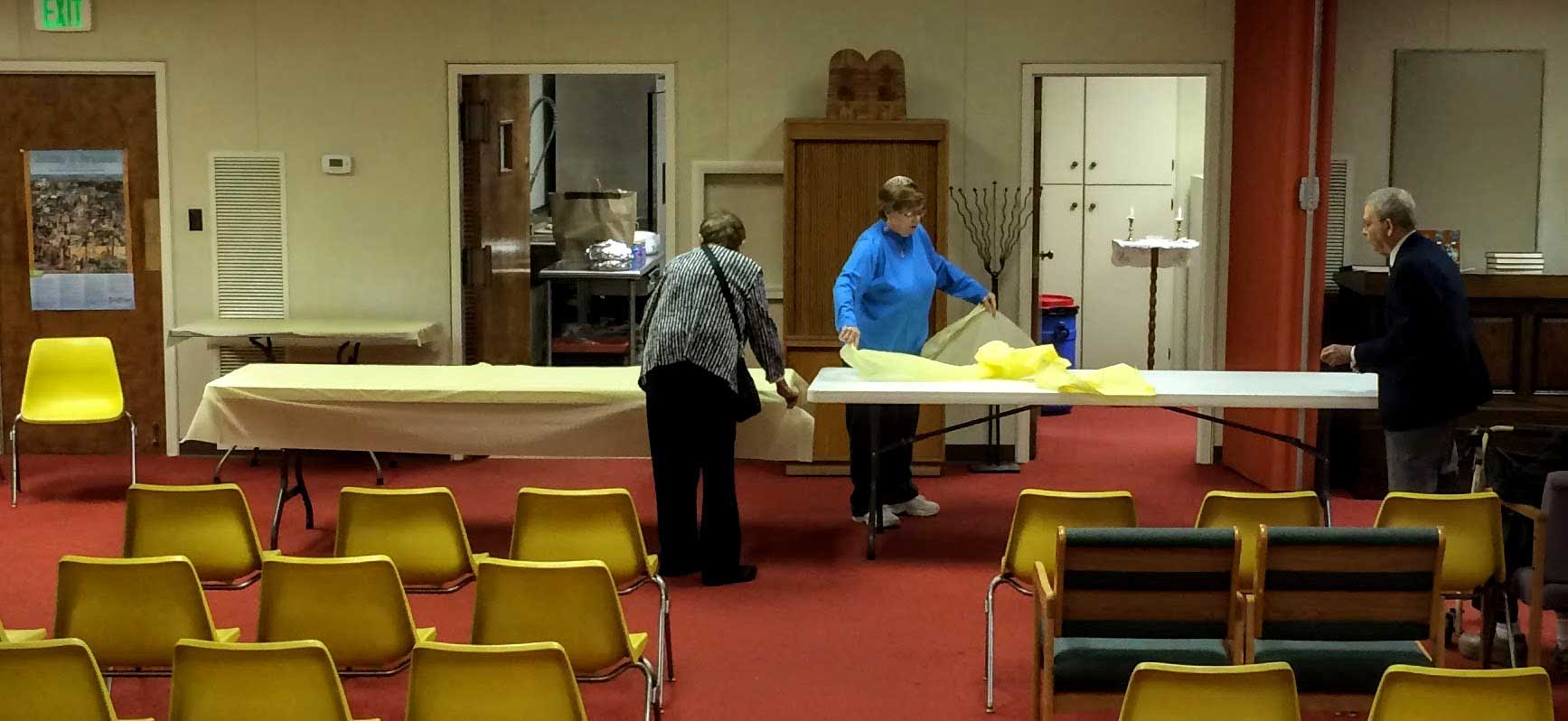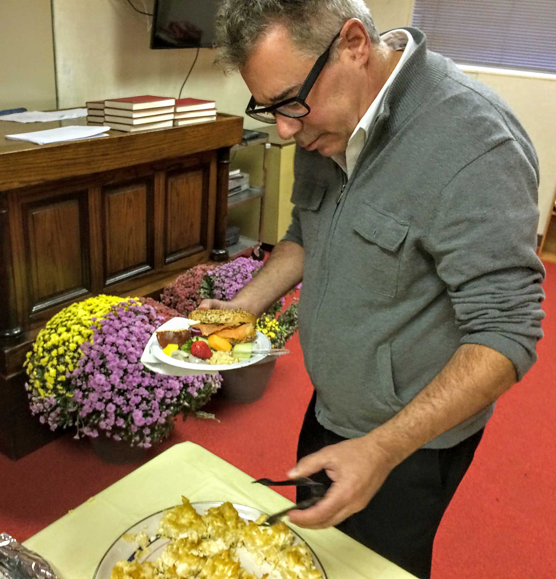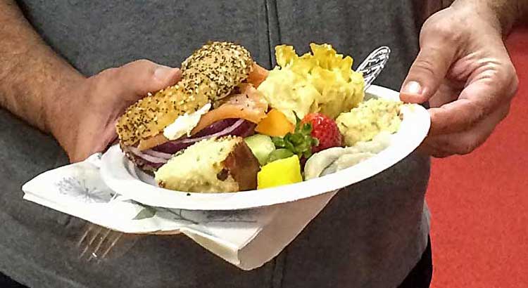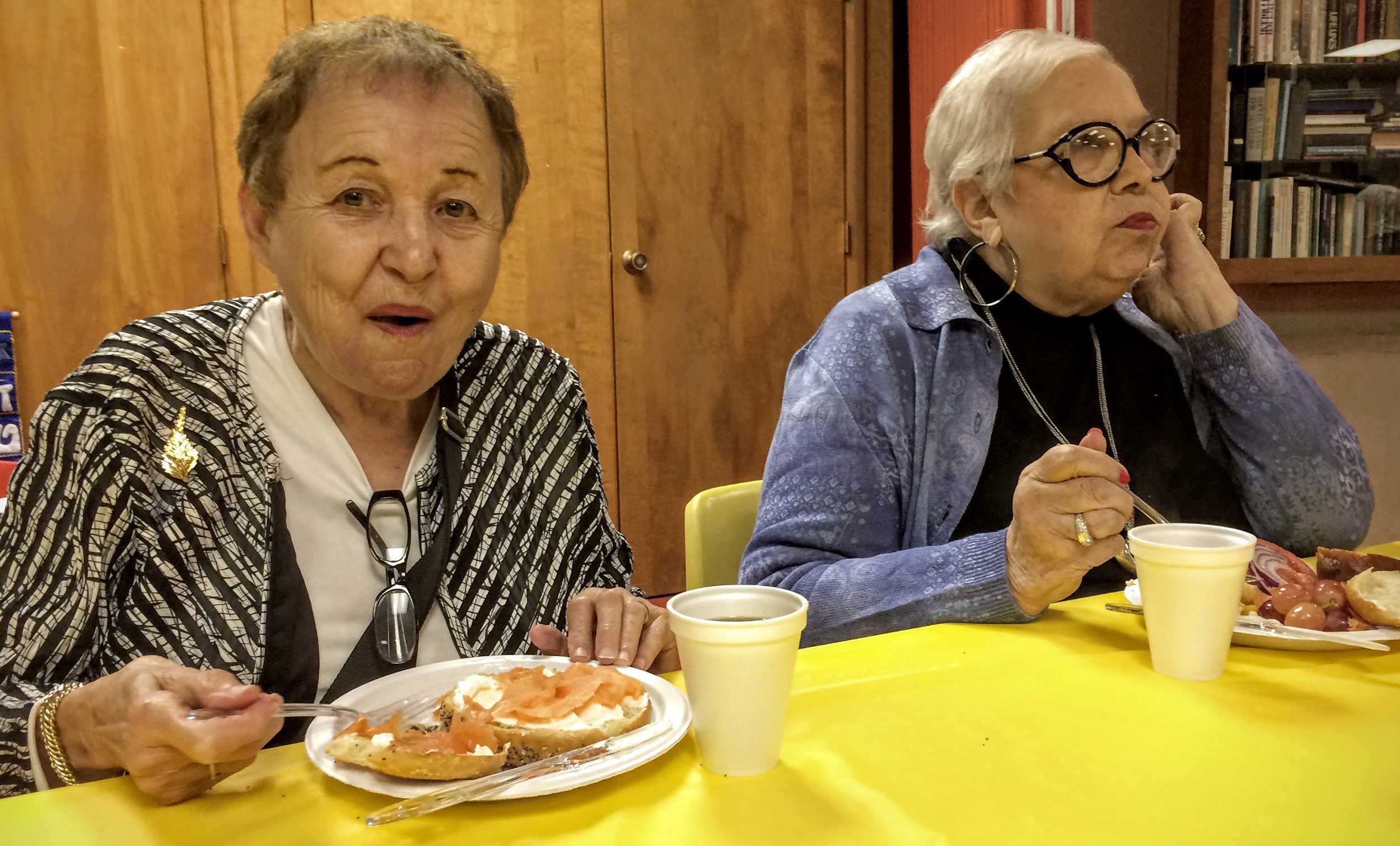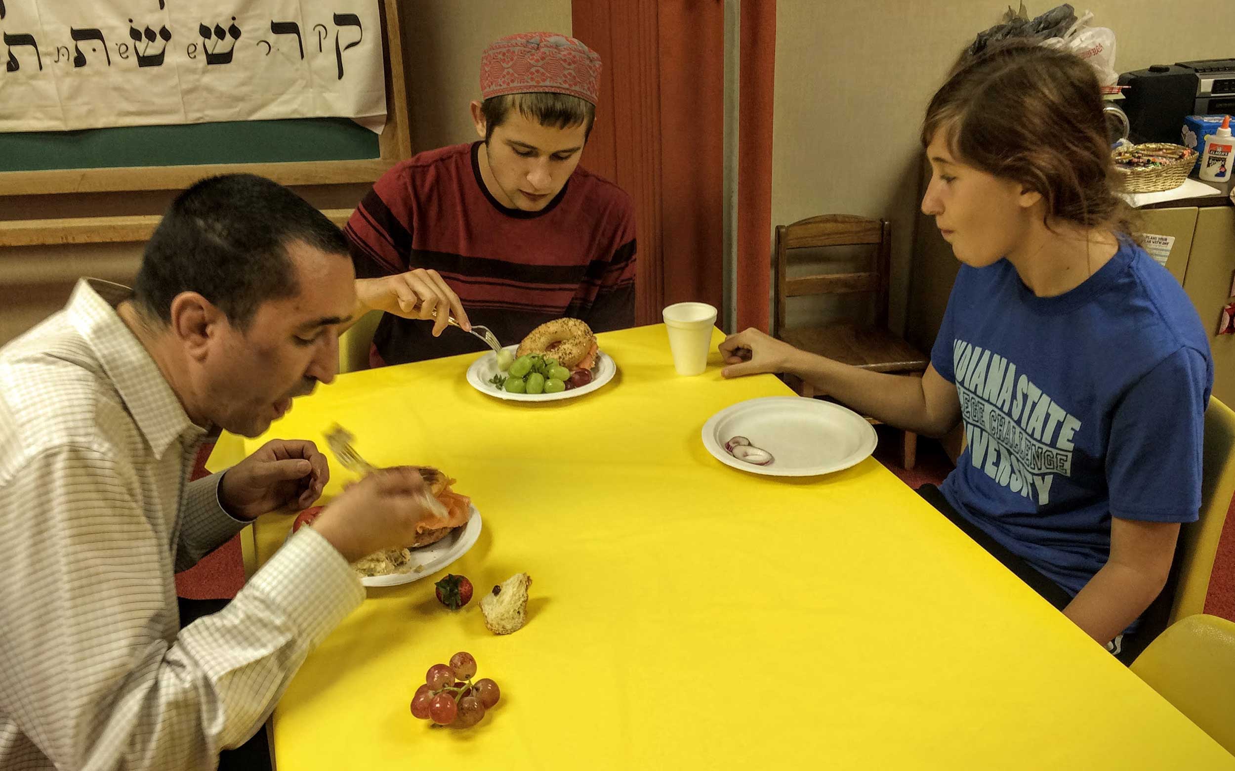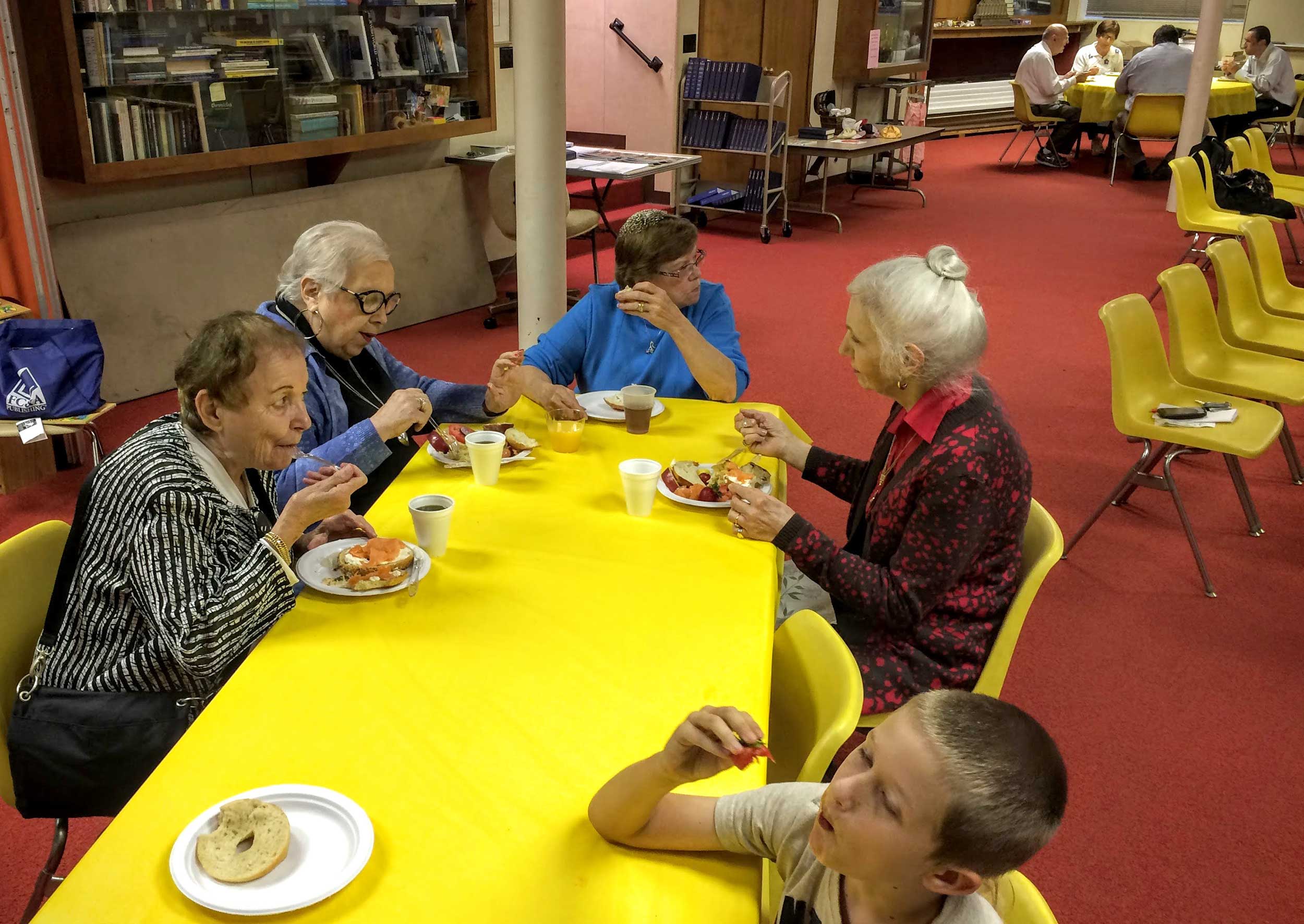 This year, repentant and ravenous worshipers joined Student Rabbi Aaron Rozovsky in the Vestry Room, where Sisterhood had filled the serving tables with bagels, lox, cream cheese, pickled herring, noodle kugel, tuna fish, capers, fruit, challah and coffee.