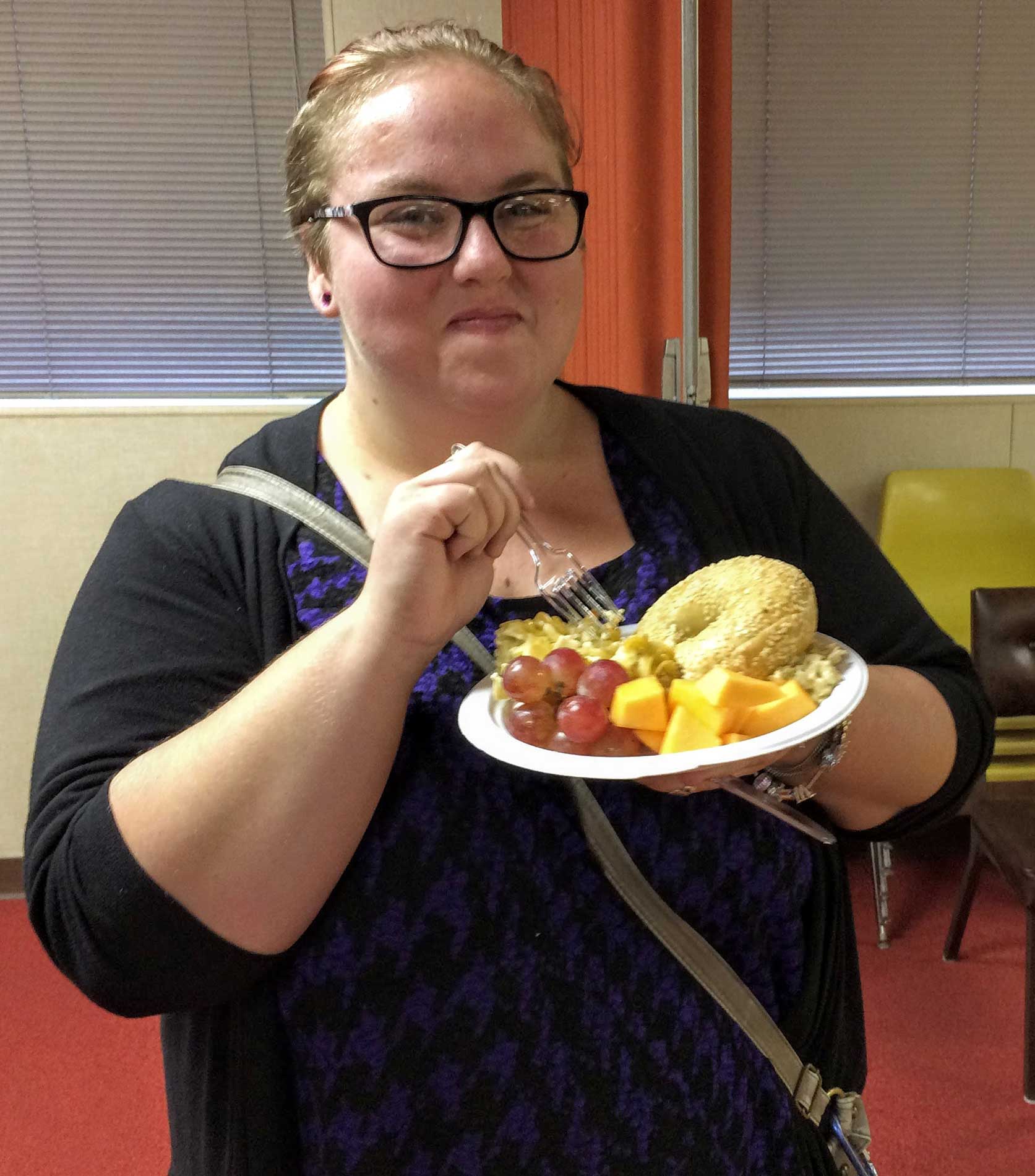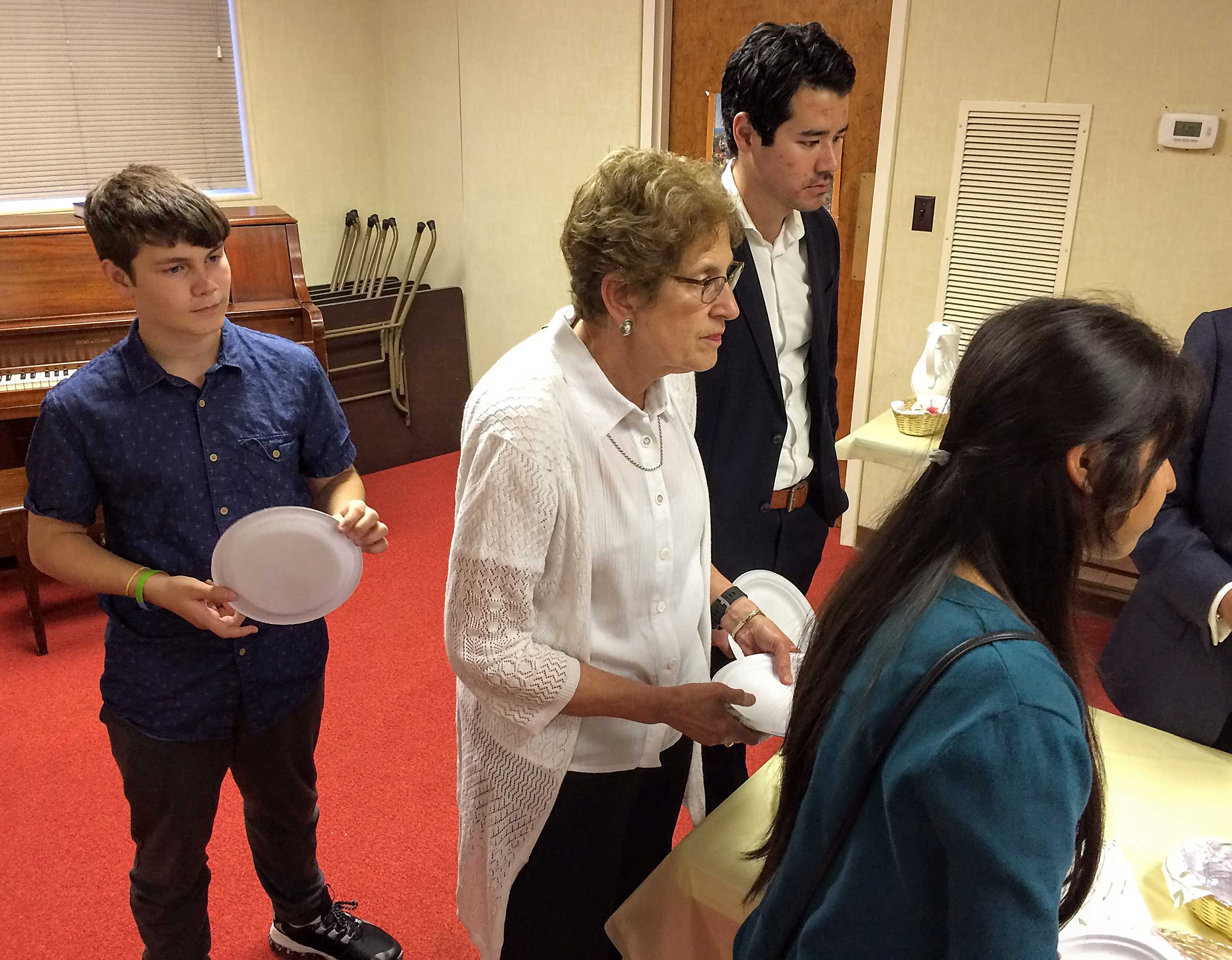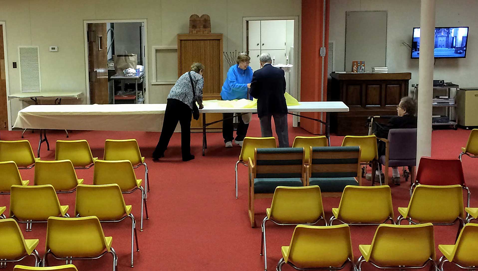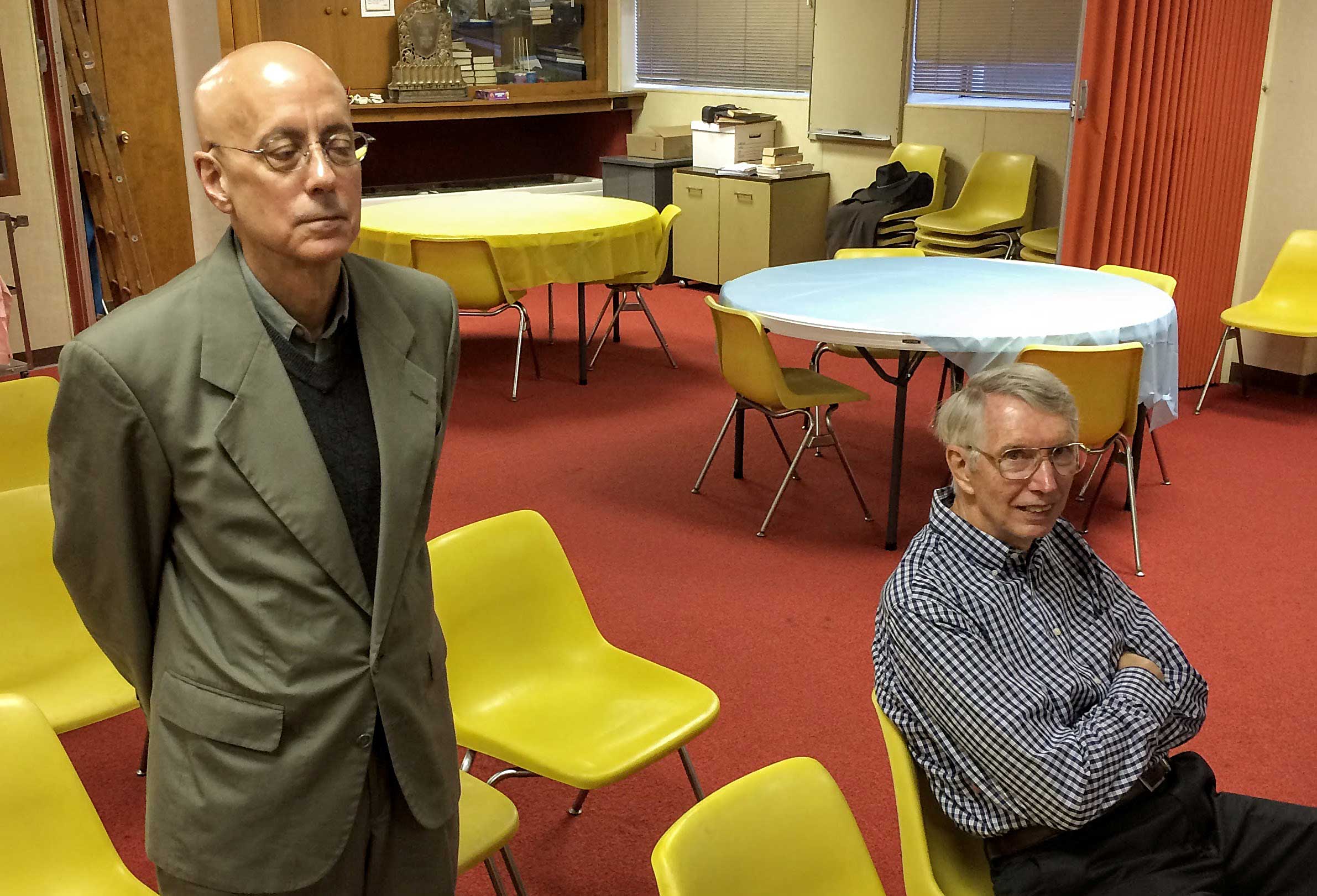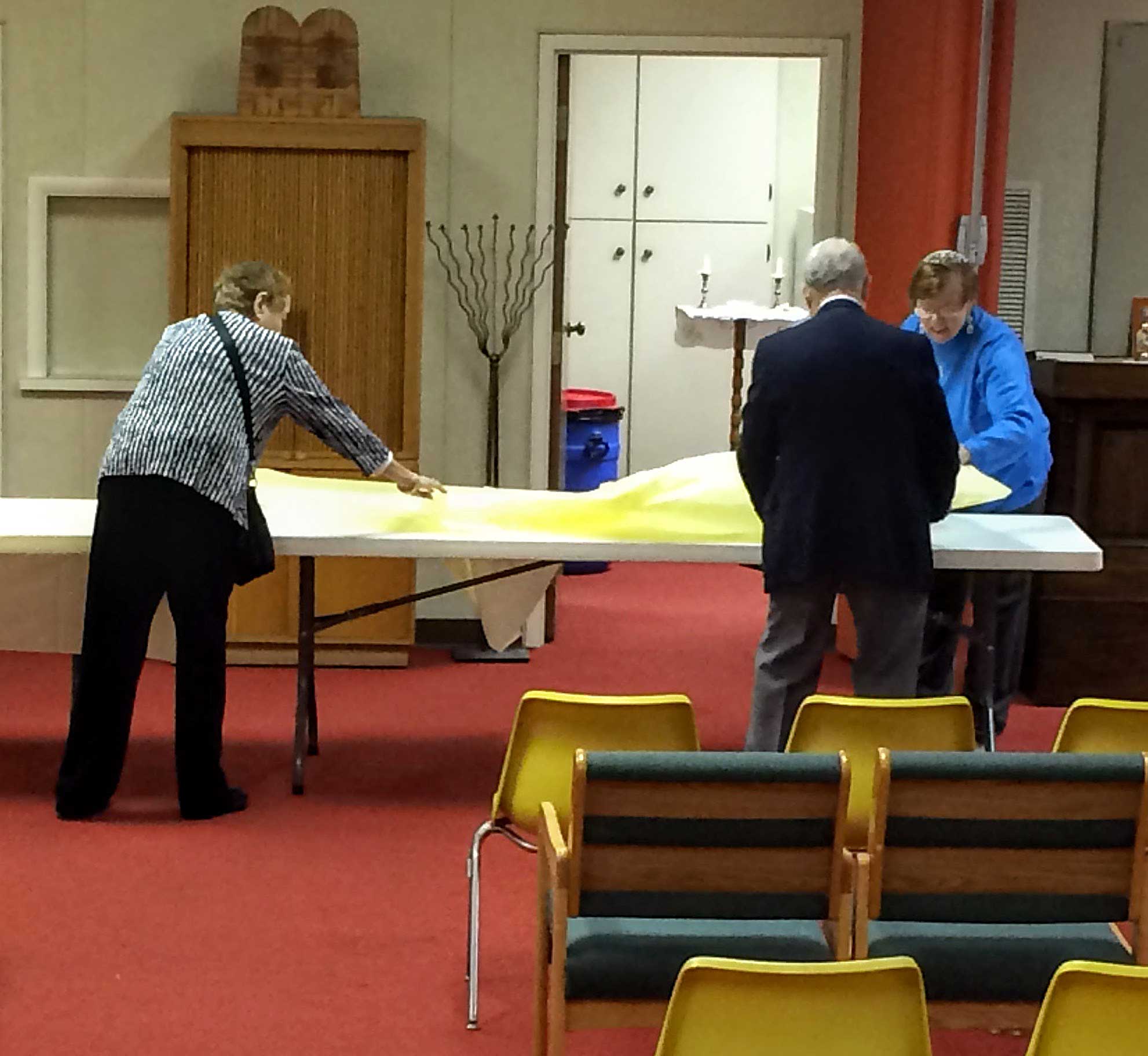 This year, repentant and ravenous worshipers joined Student Rabbi Aaron Rozovsky in the Vestry Room, where Sisterhood had filled the serving tables with bagels, lox, cream cheese, pickled herring, noodle kugel, tuna fish, capers, fruit, challah and coffee.