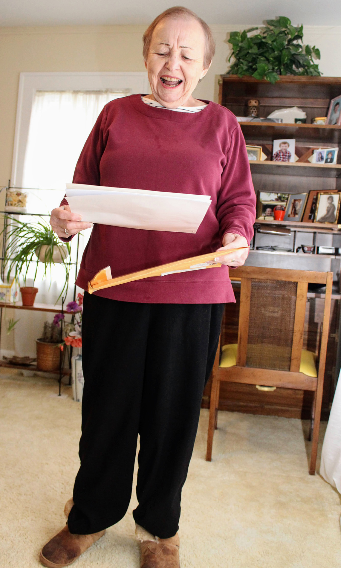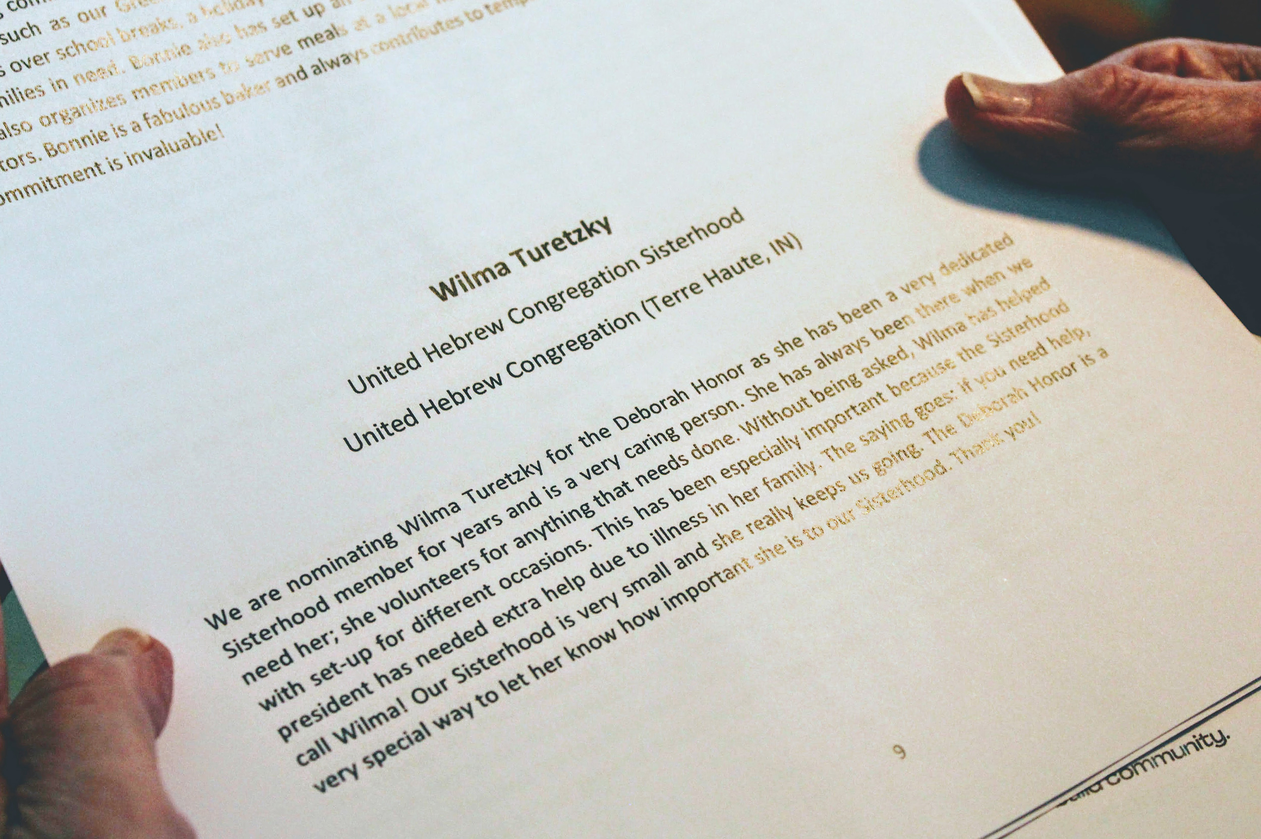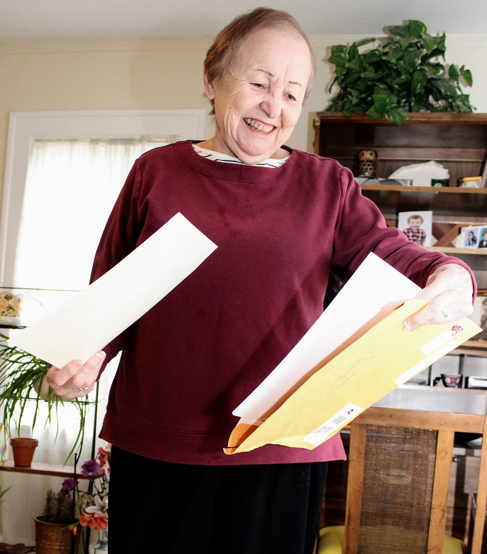Patty alerted the press to stand by while Wilma Turetzky retrieved the mail and opened an envelope from WRJ Central District. Inside, Wilma found her Deborah Honor certificate.