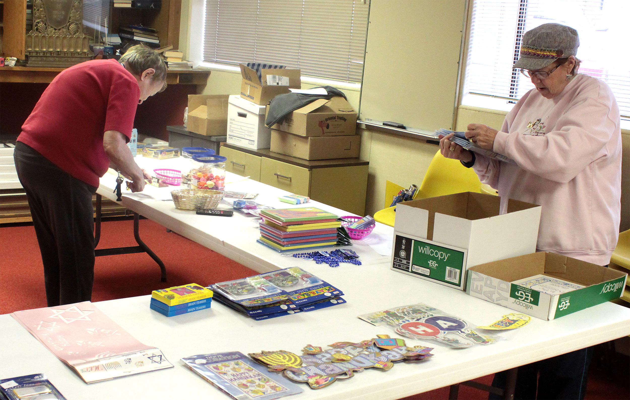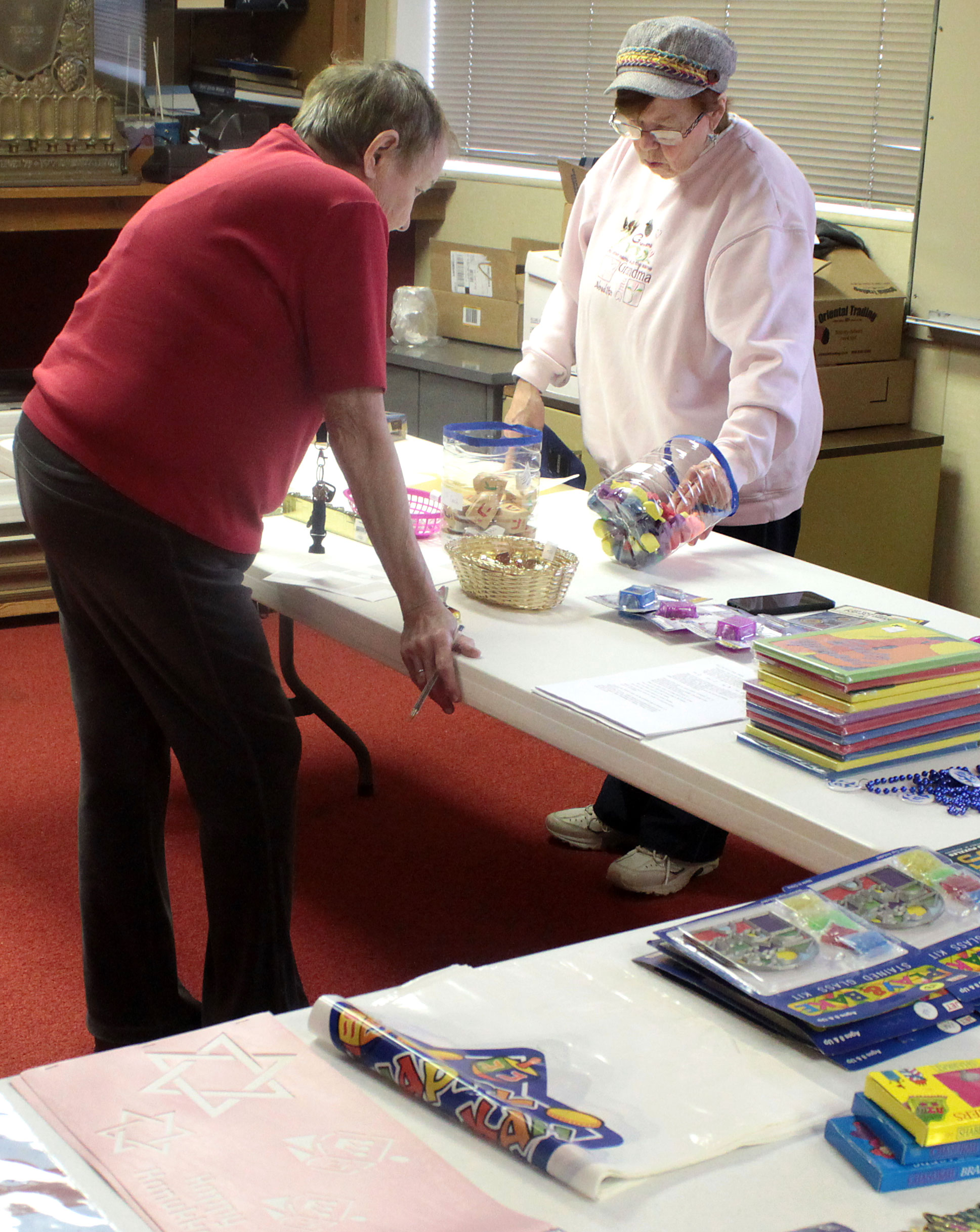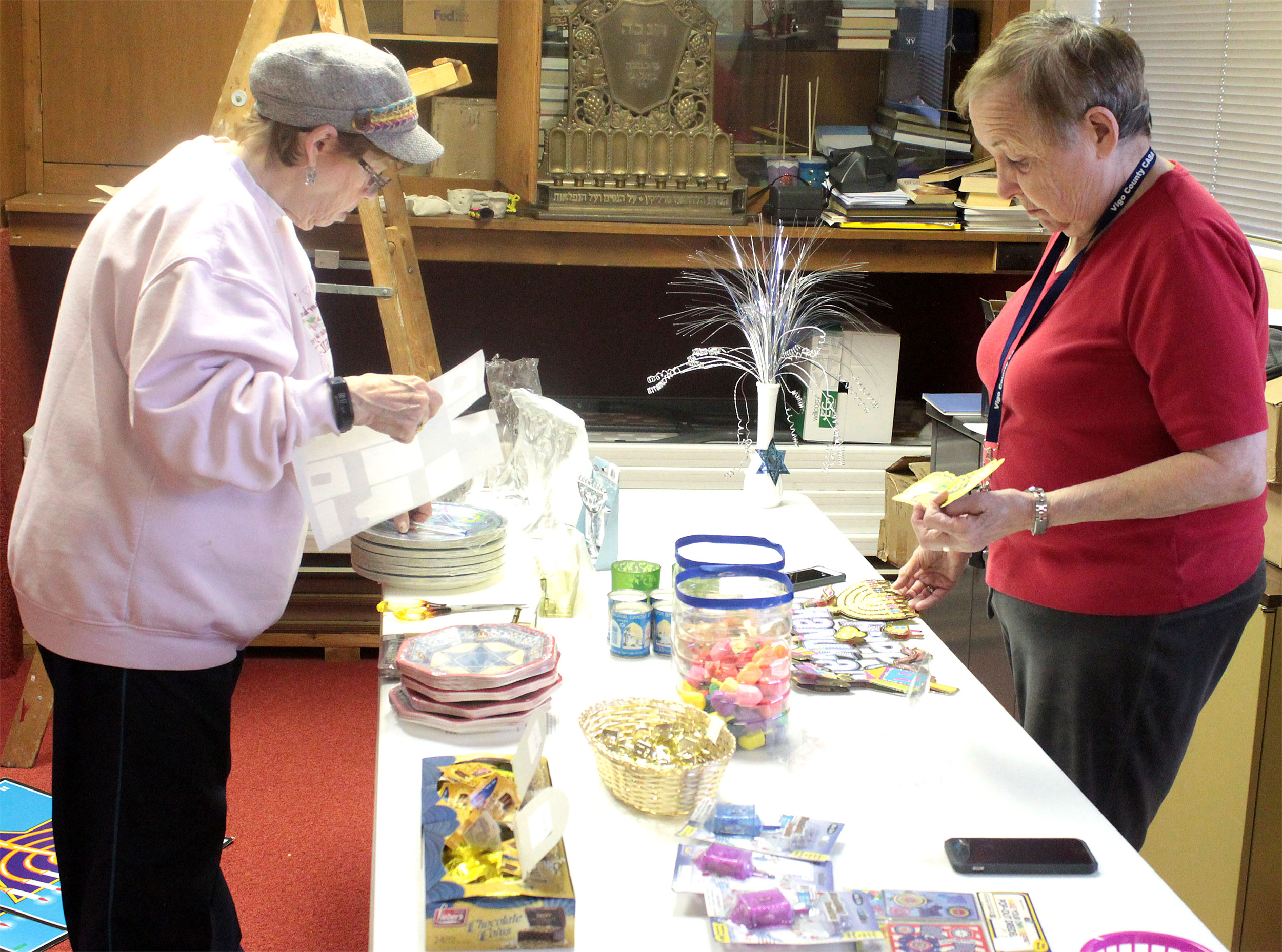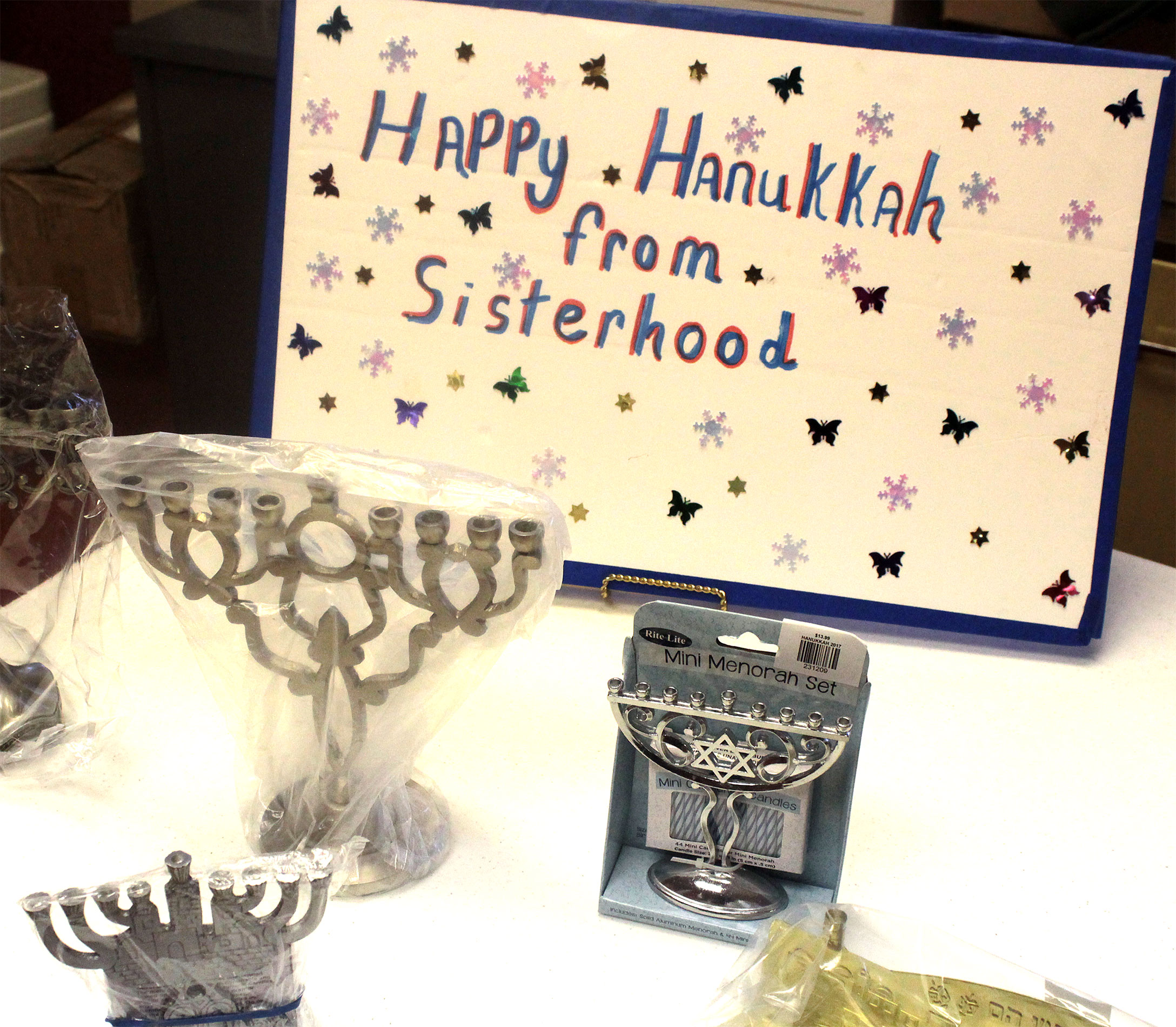 After Religious School students decorated the Vestry Room for Hanukkah, Patty and Wilma set up the Hanukkah Gift Shop, which features menorahs, candles, dreidels, gelt, wrapping paper and more! Call Norma at (812) 232-5988 before you shop.