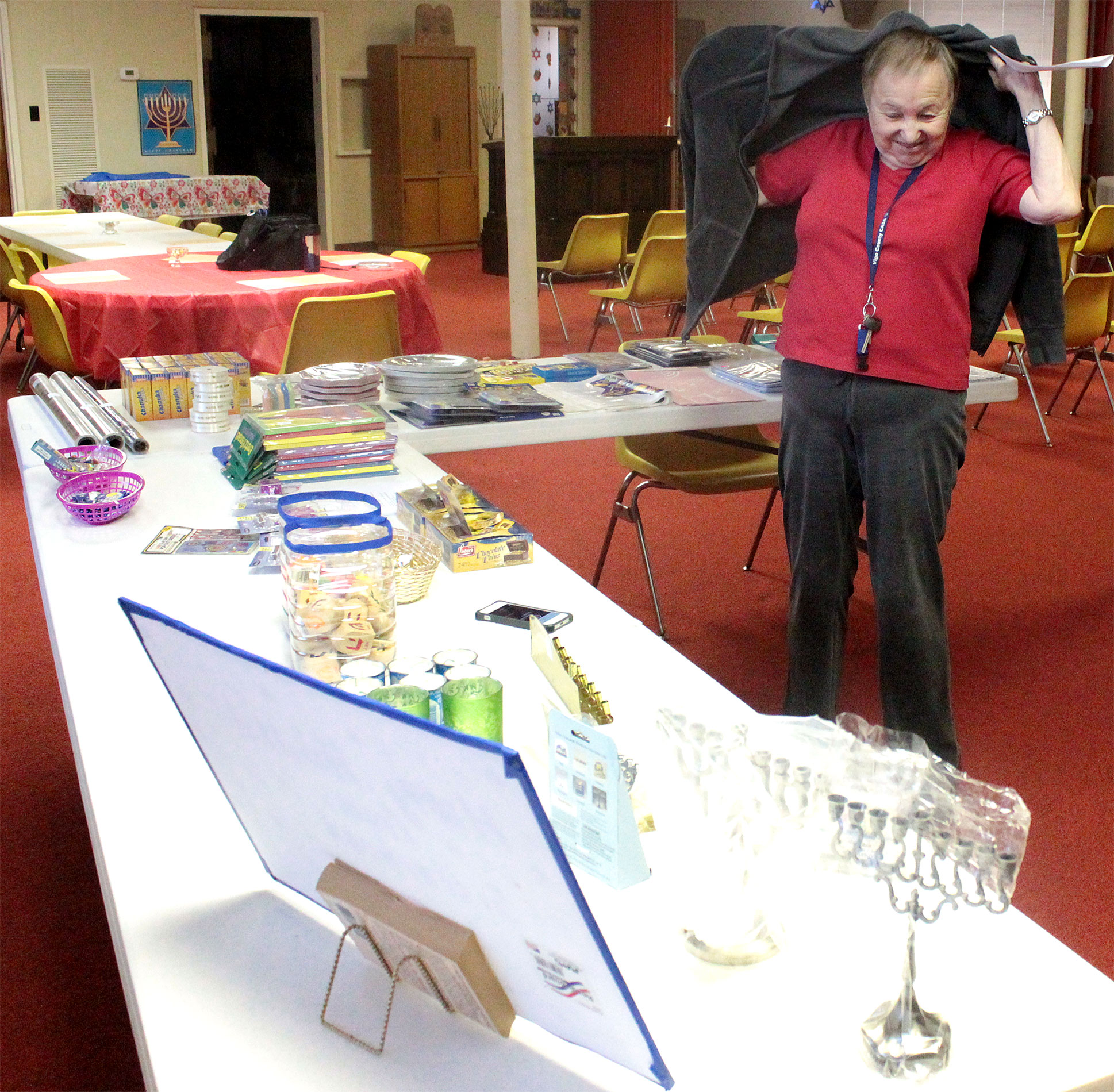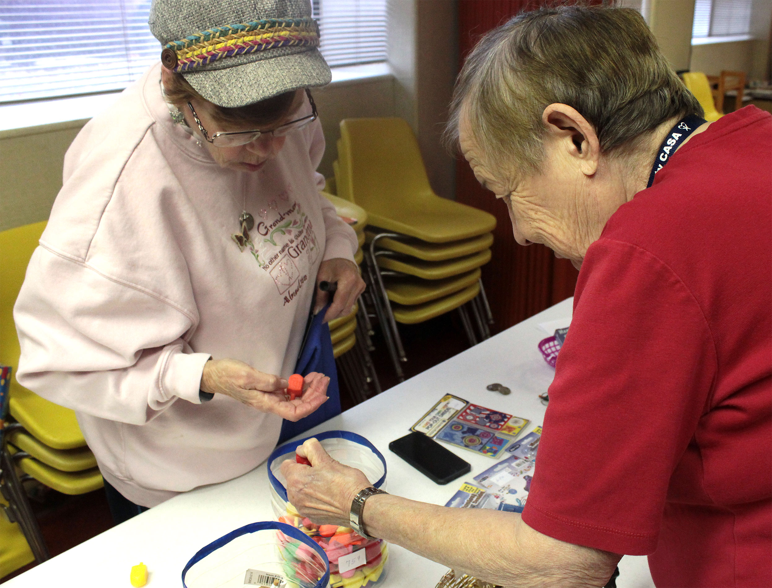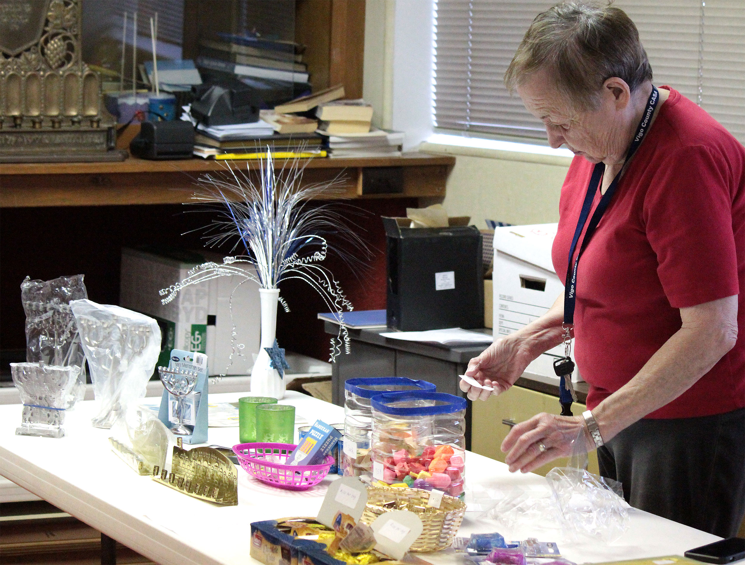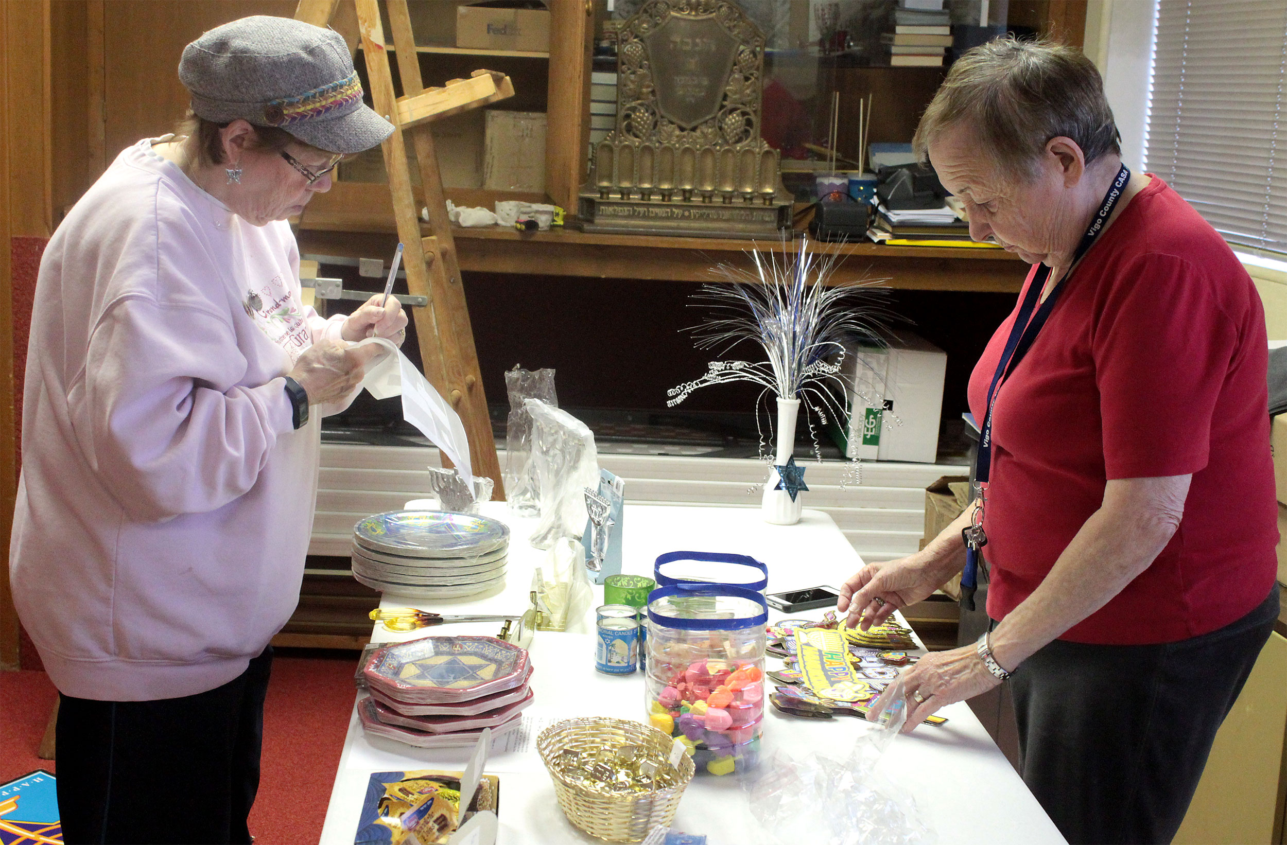 After Religious School students decorated the Vestry Room for Hanukkah, Patty and Wilma set up the Hanukkah Gift Shop, which features menorahs, candles, dreidels, gelt, wrapping paper and more! Call Norma at (812) 232-5988 before you shop.