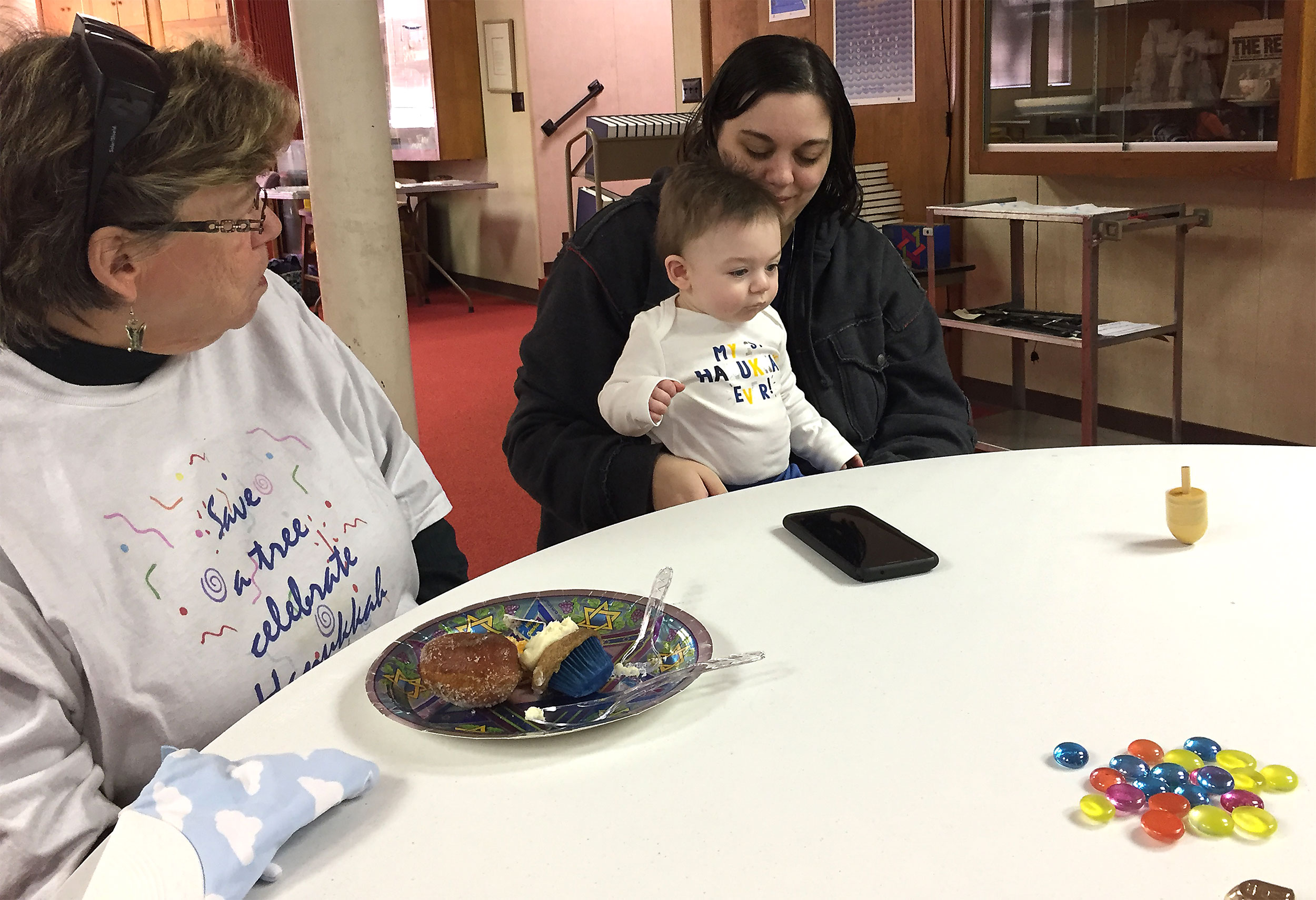 Robert is too young to understand the Hanukkah traditions, so each night after lighting our candles, we added money to Robert’s College Jug. We brought Robert to the religious school Hanukkah party this year, giving him a chance to enjoy time with other kids.