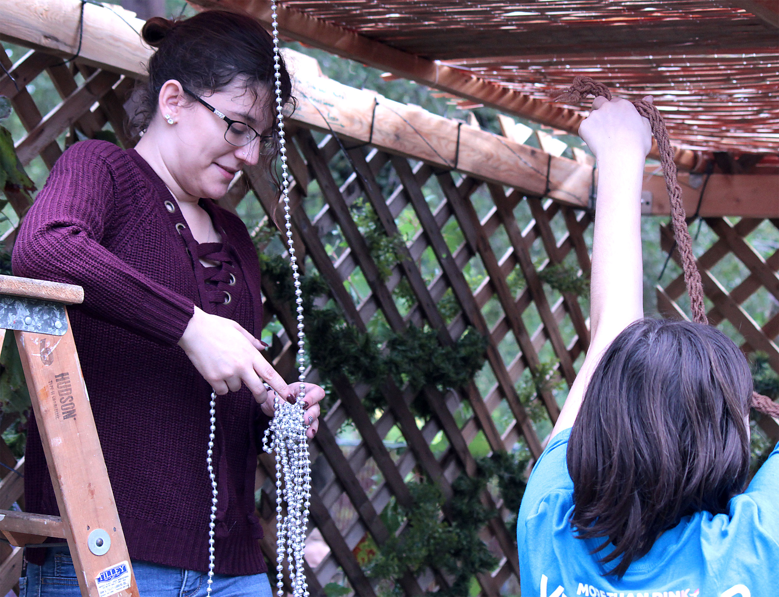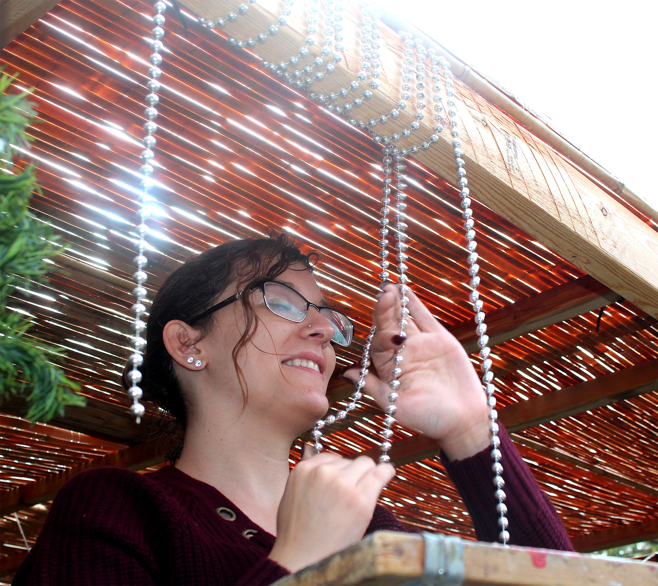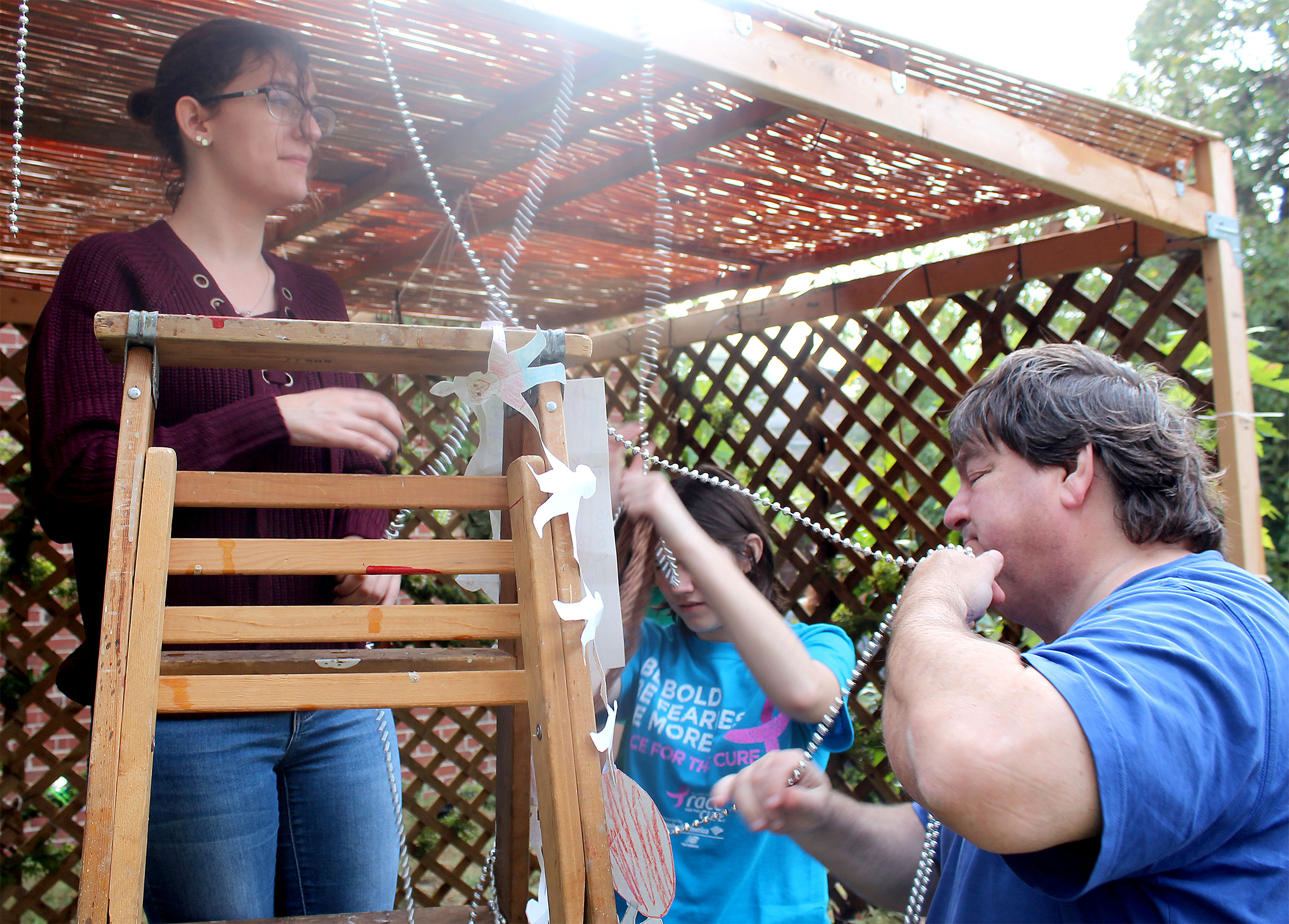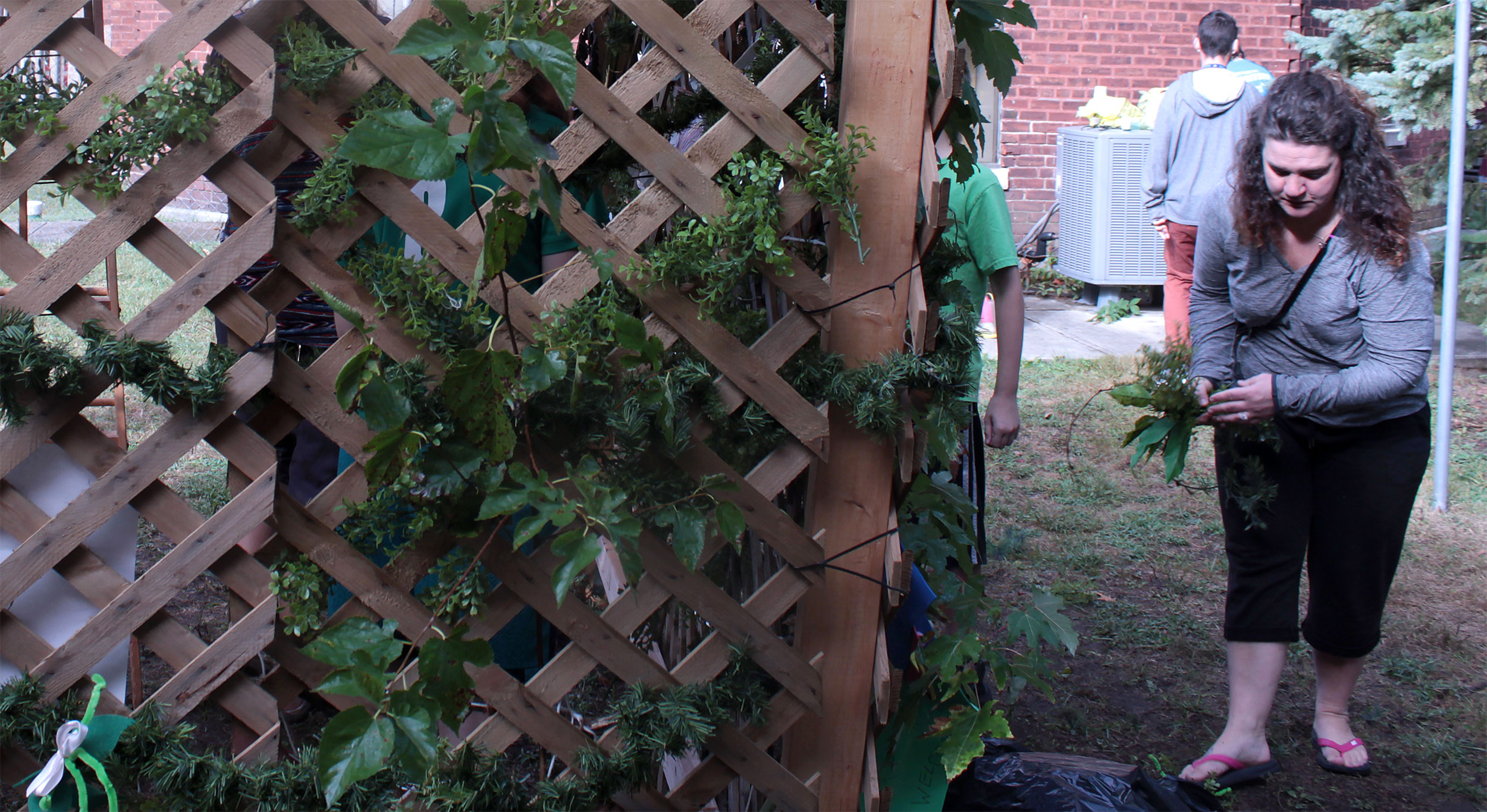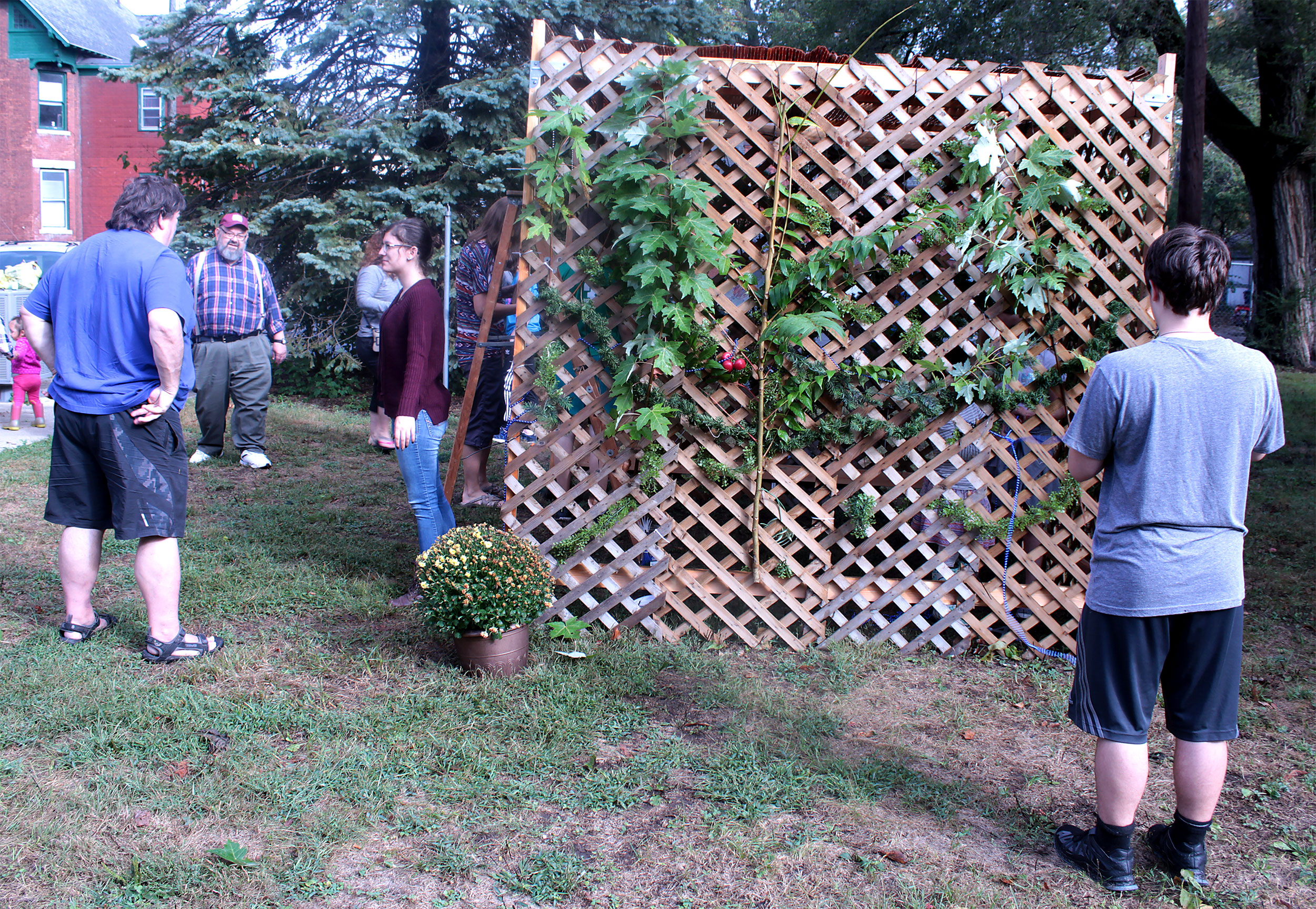 Students and guests decorate the exterior of the sukkah, located in the yard behind Temple Israel, with beads, vines and leafy branches collected from the area.