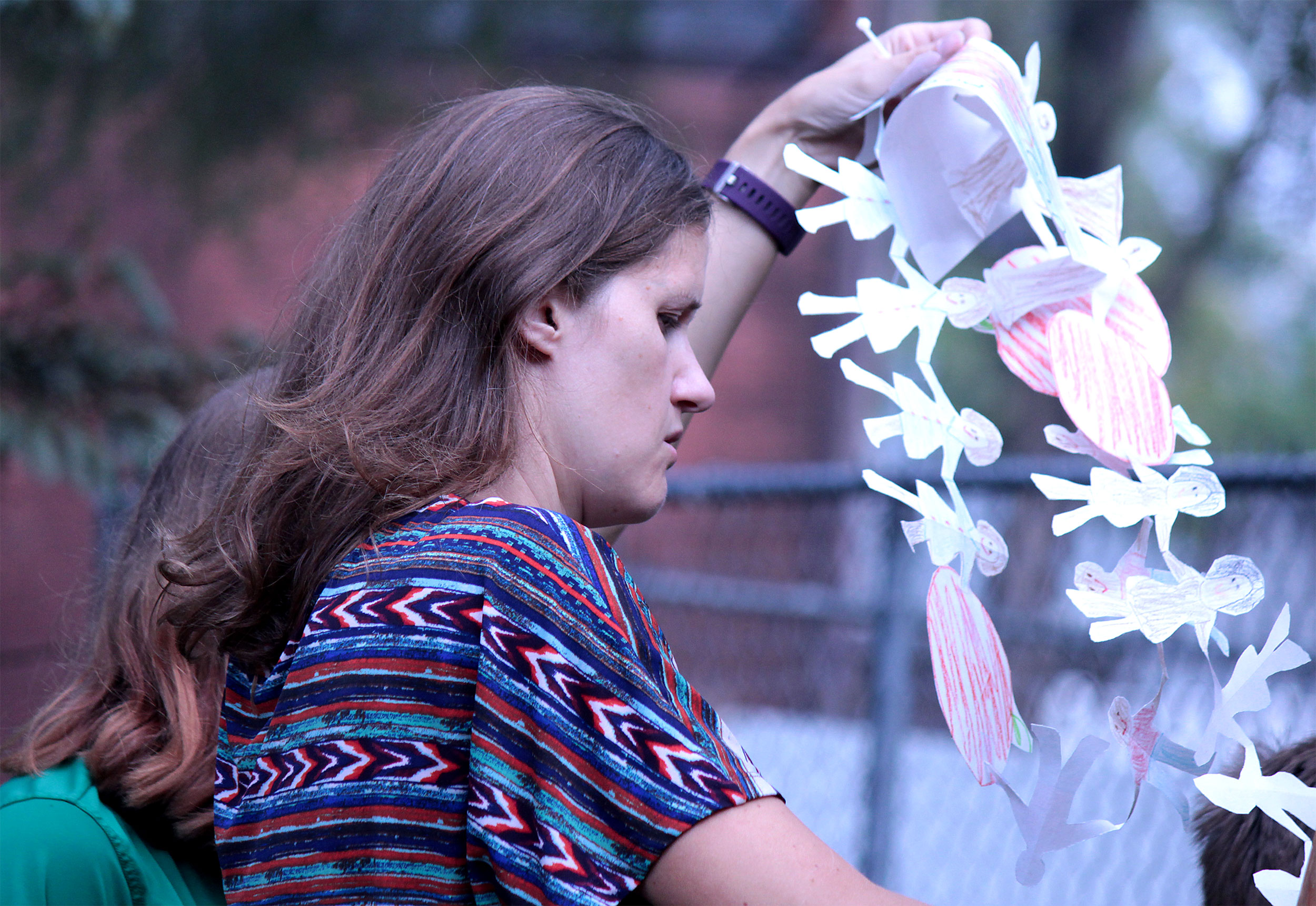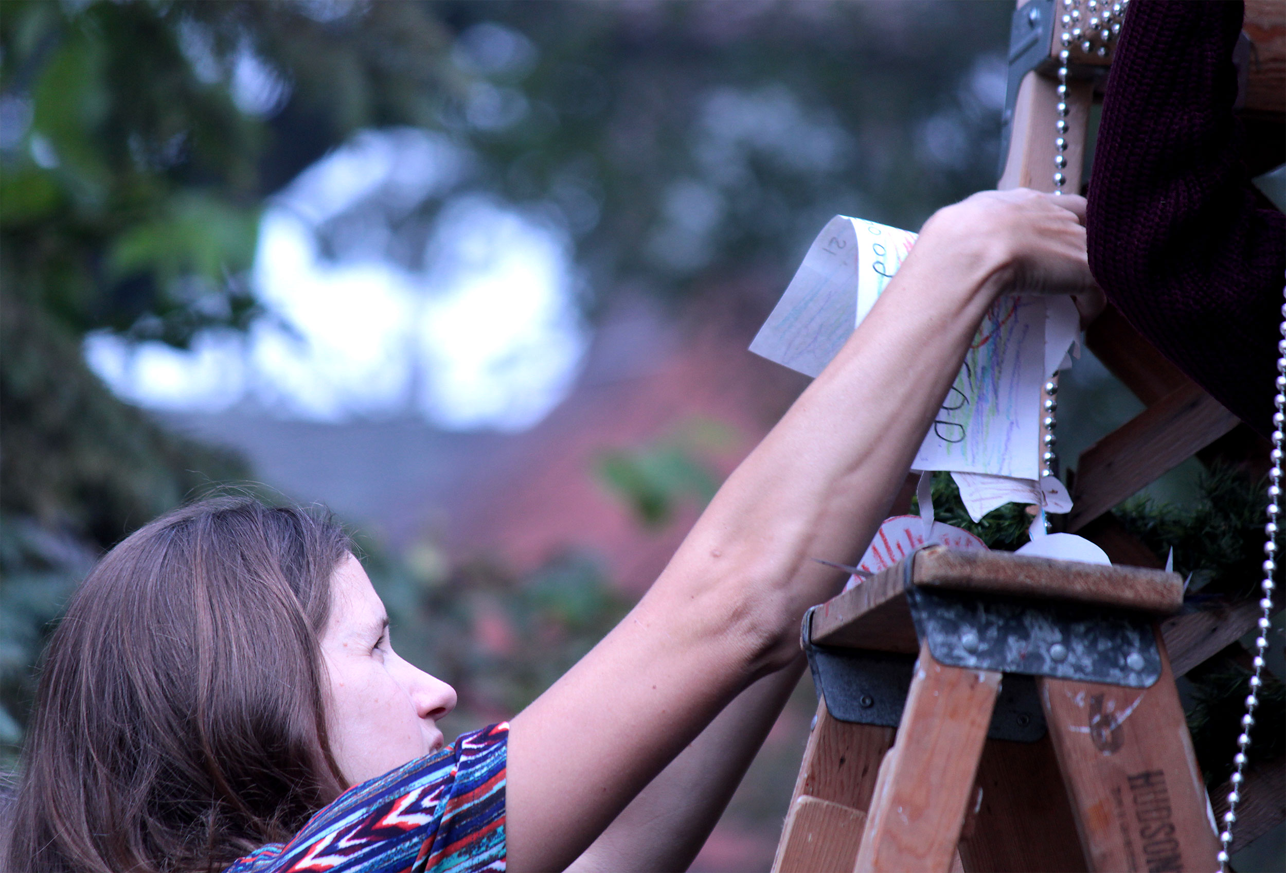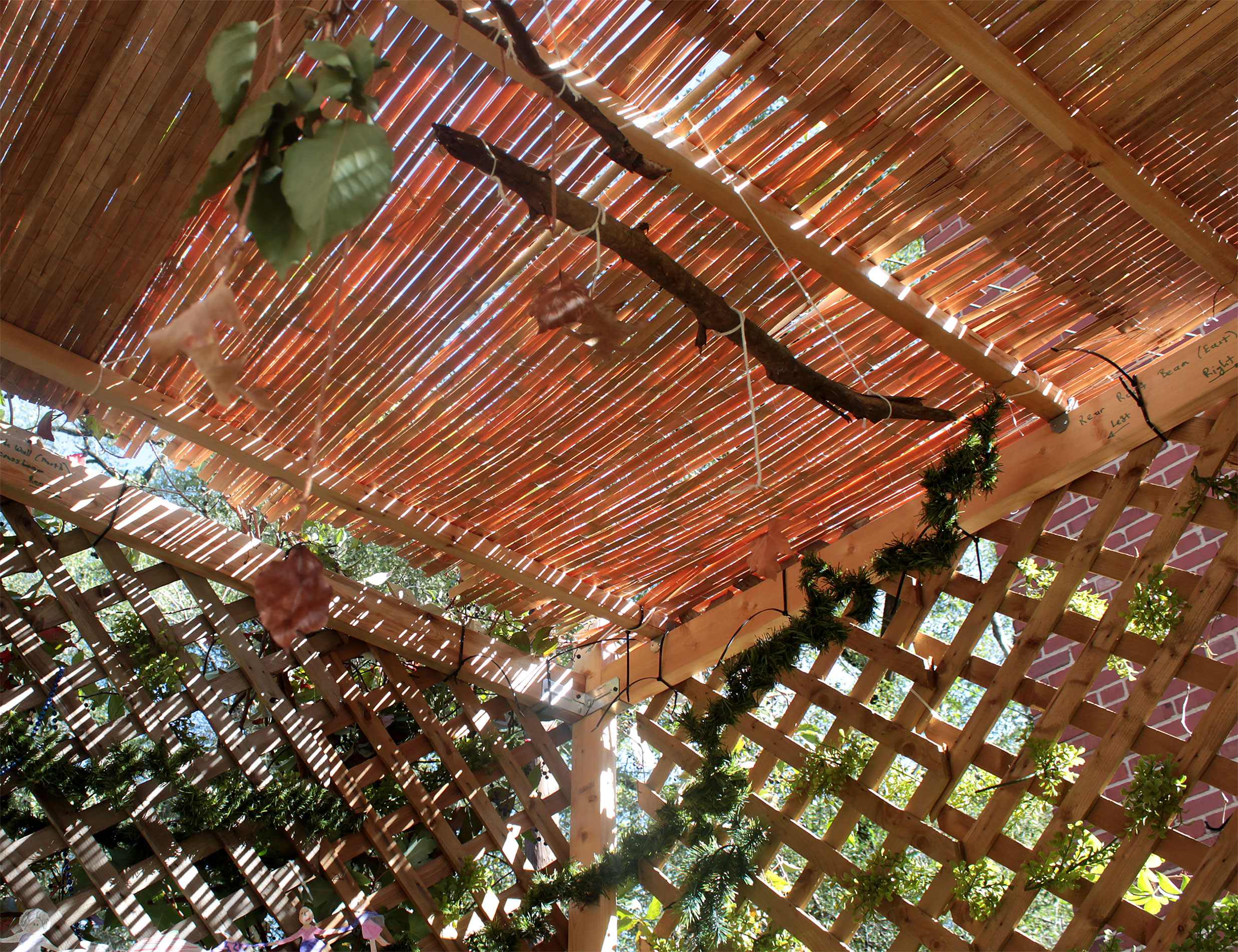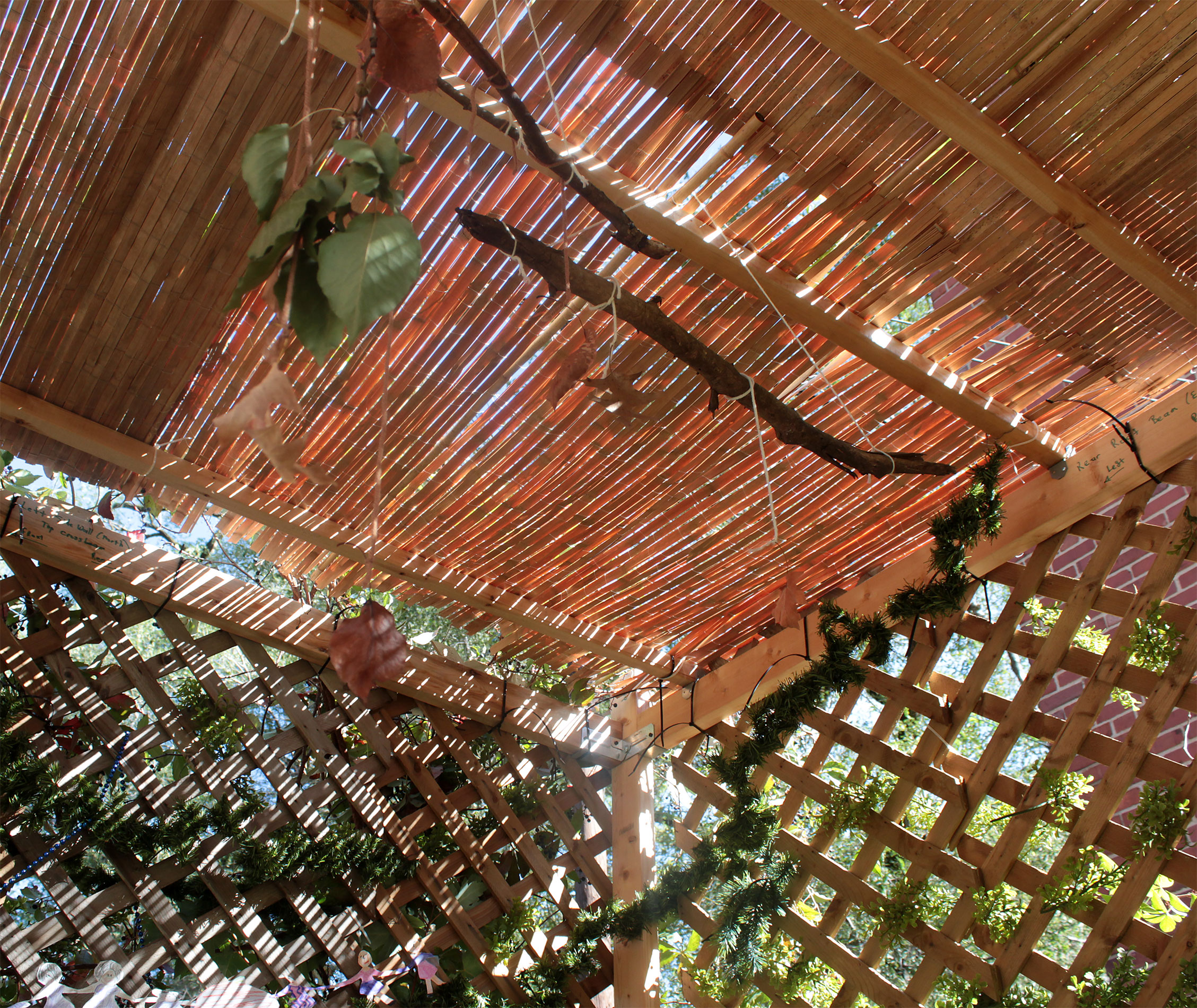 Students and guests decorate the exterior of the sukkah, located in the yard behind Temple Israel, with beads, vines and leafy branches collected from the area.