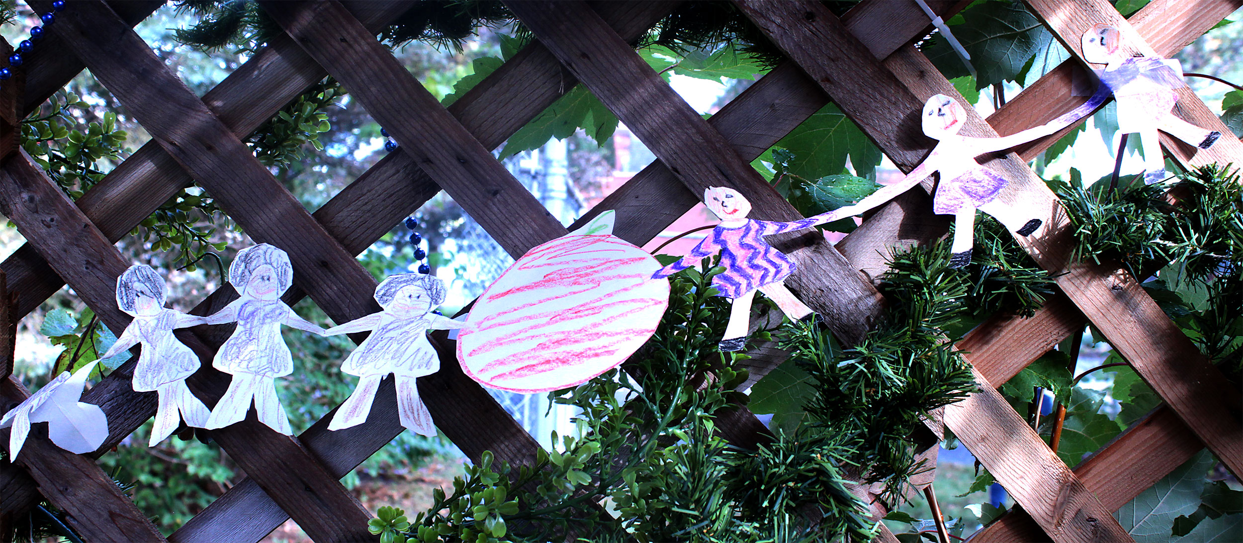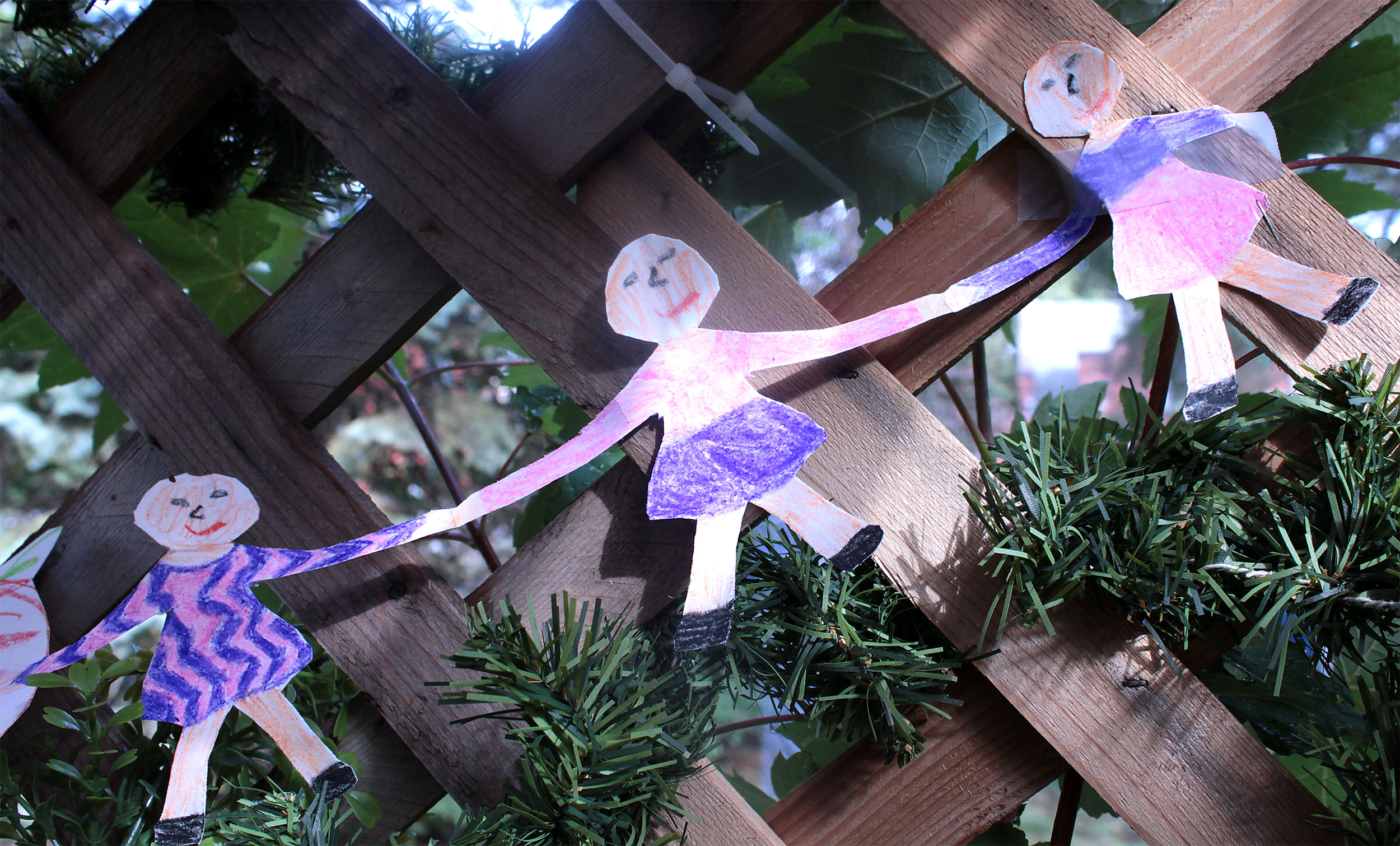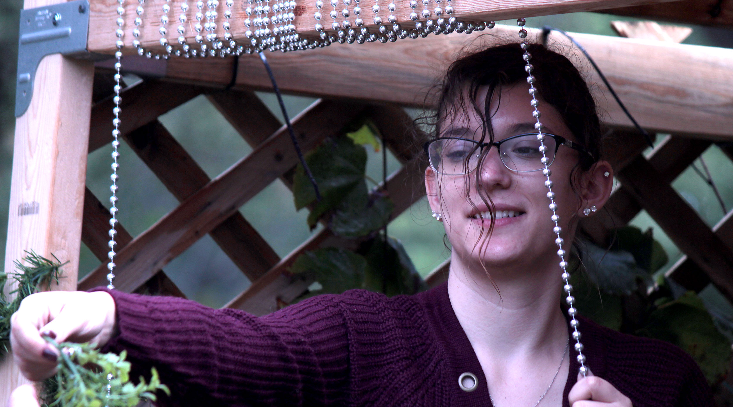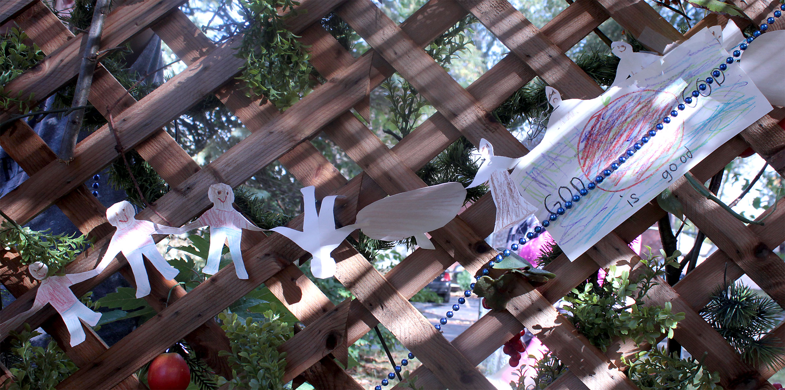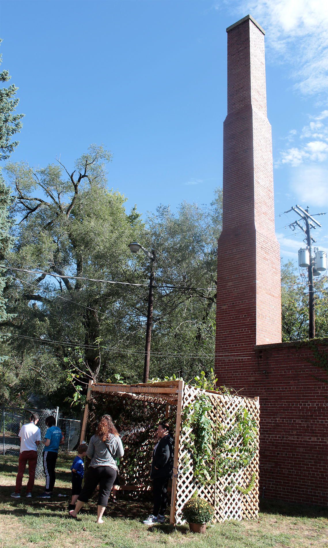 Students and guests decorate the exterior of the sukkah, located in the yard behind Temple Israel, with beads, vines and leafy branches collected from the area.