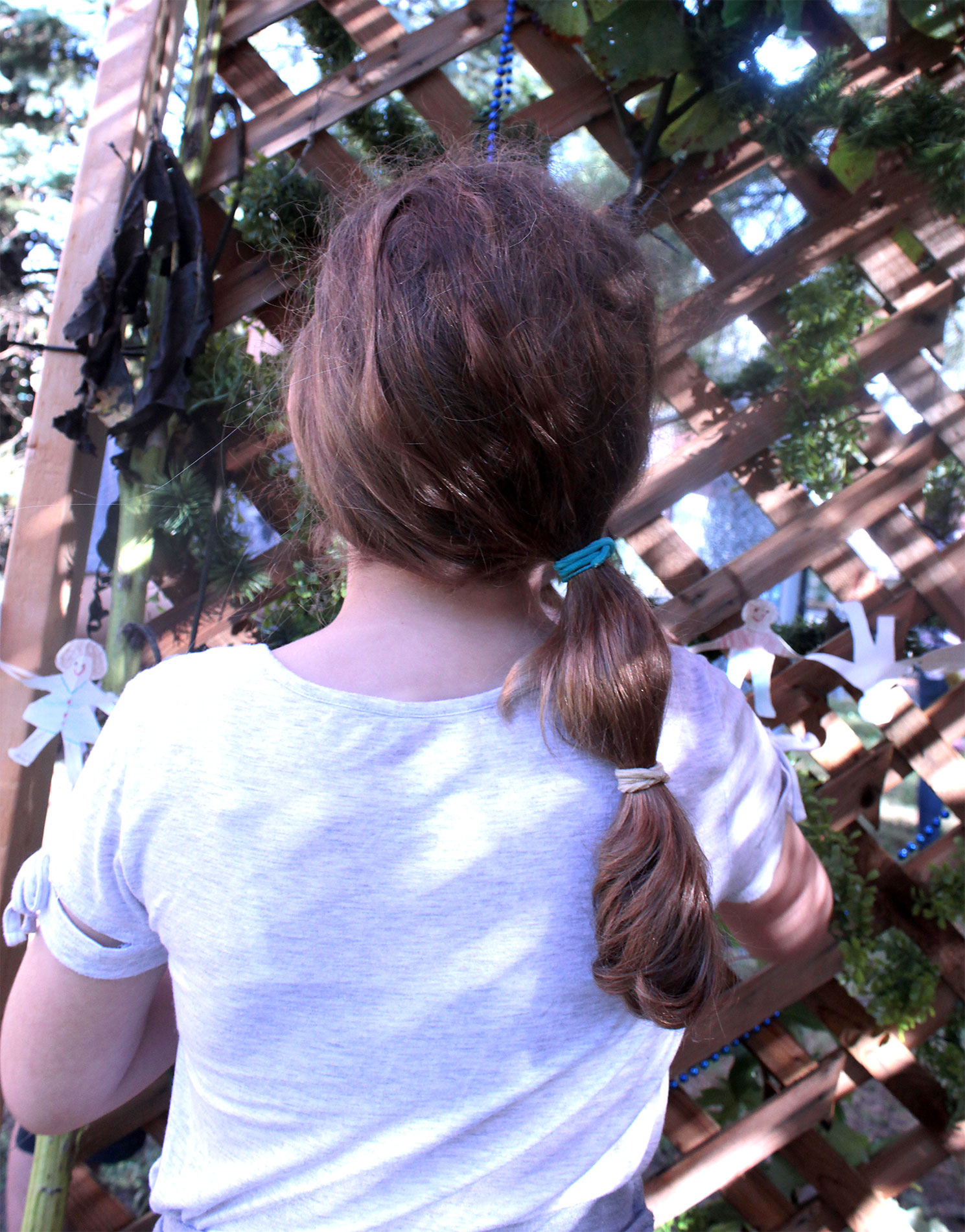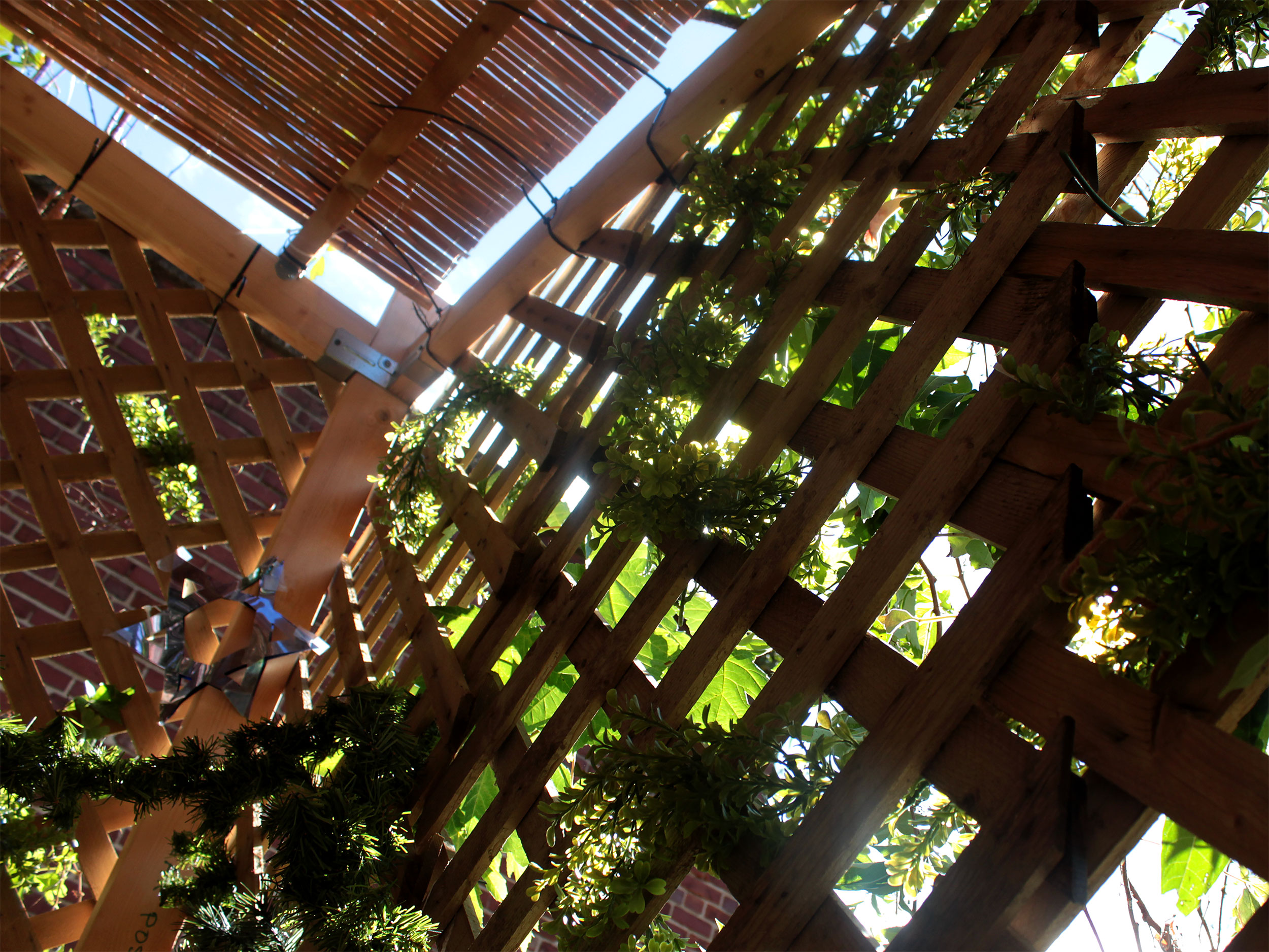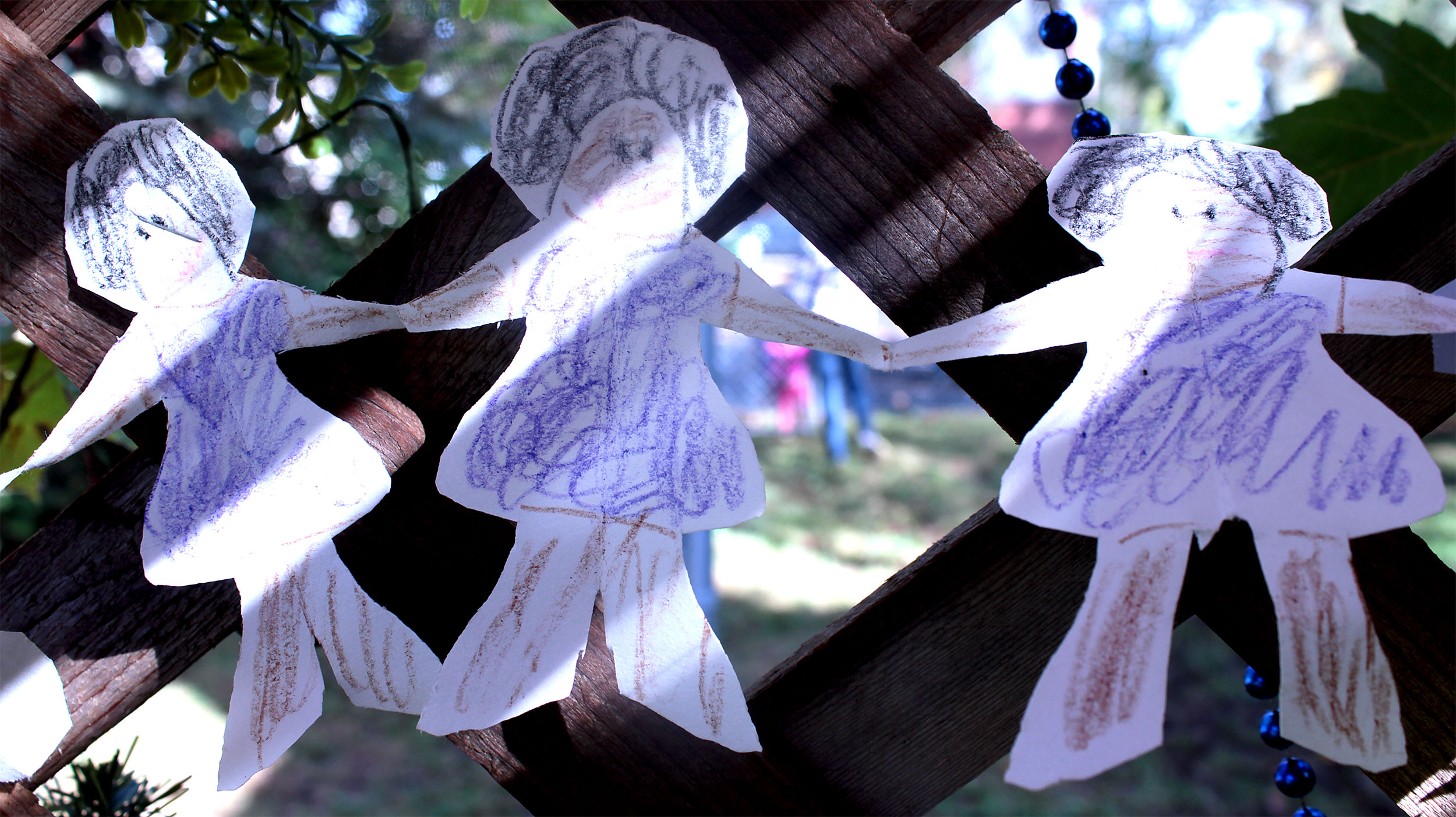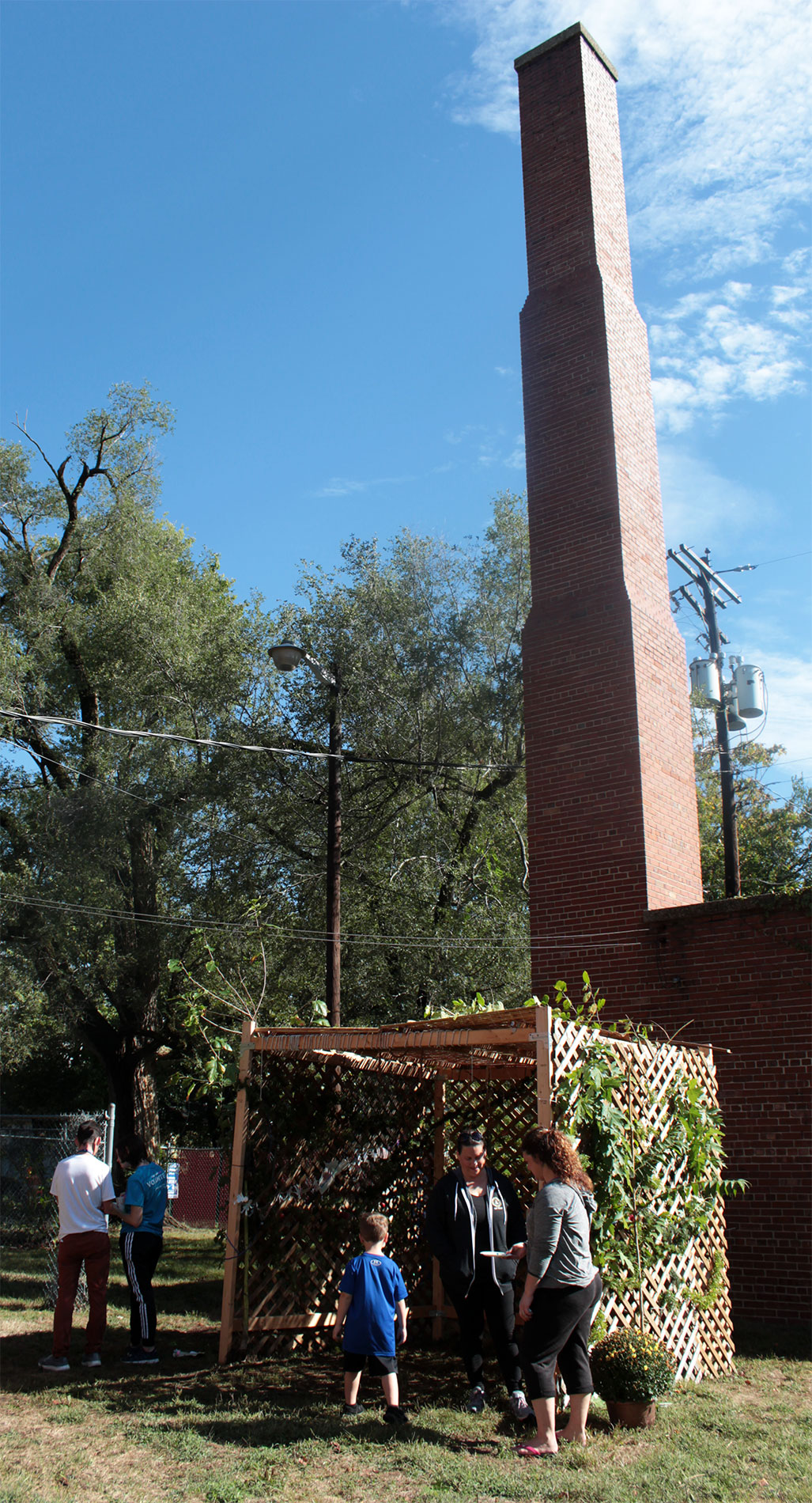 Students and guests decorate the exterior of the sukkah, located in the yard behind Temple Israel, with beads, vines and leafy branches collected from the area.