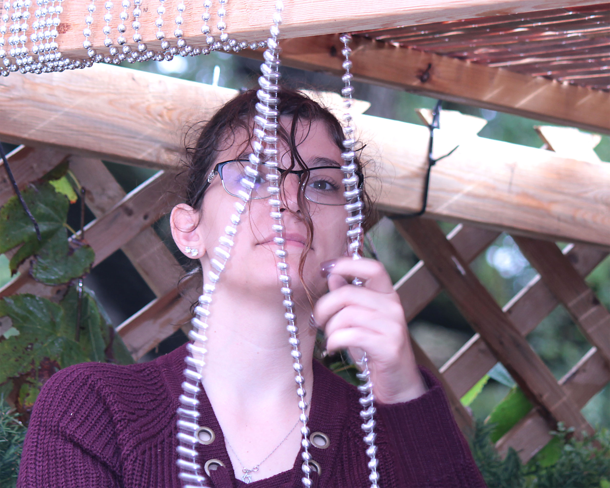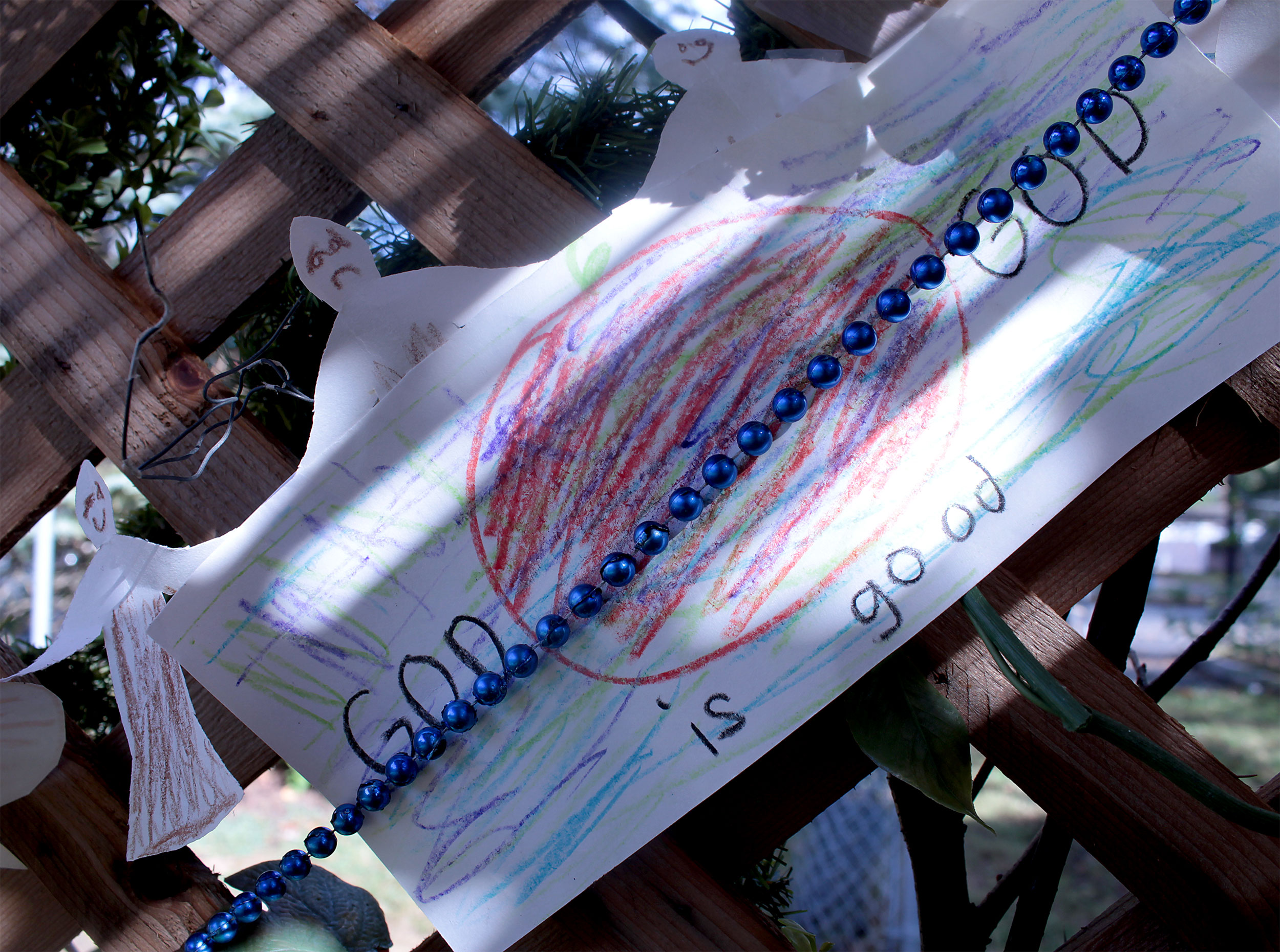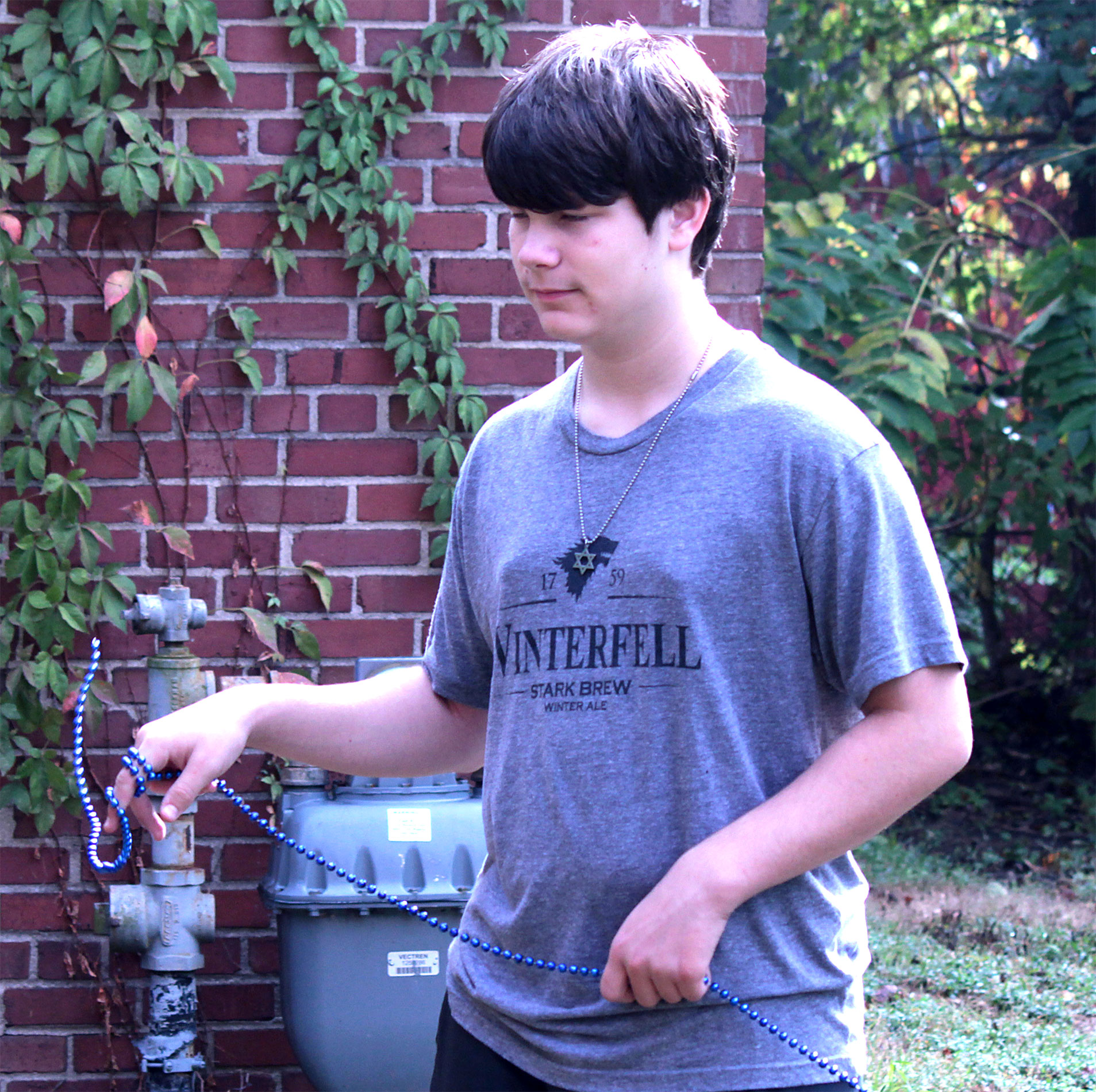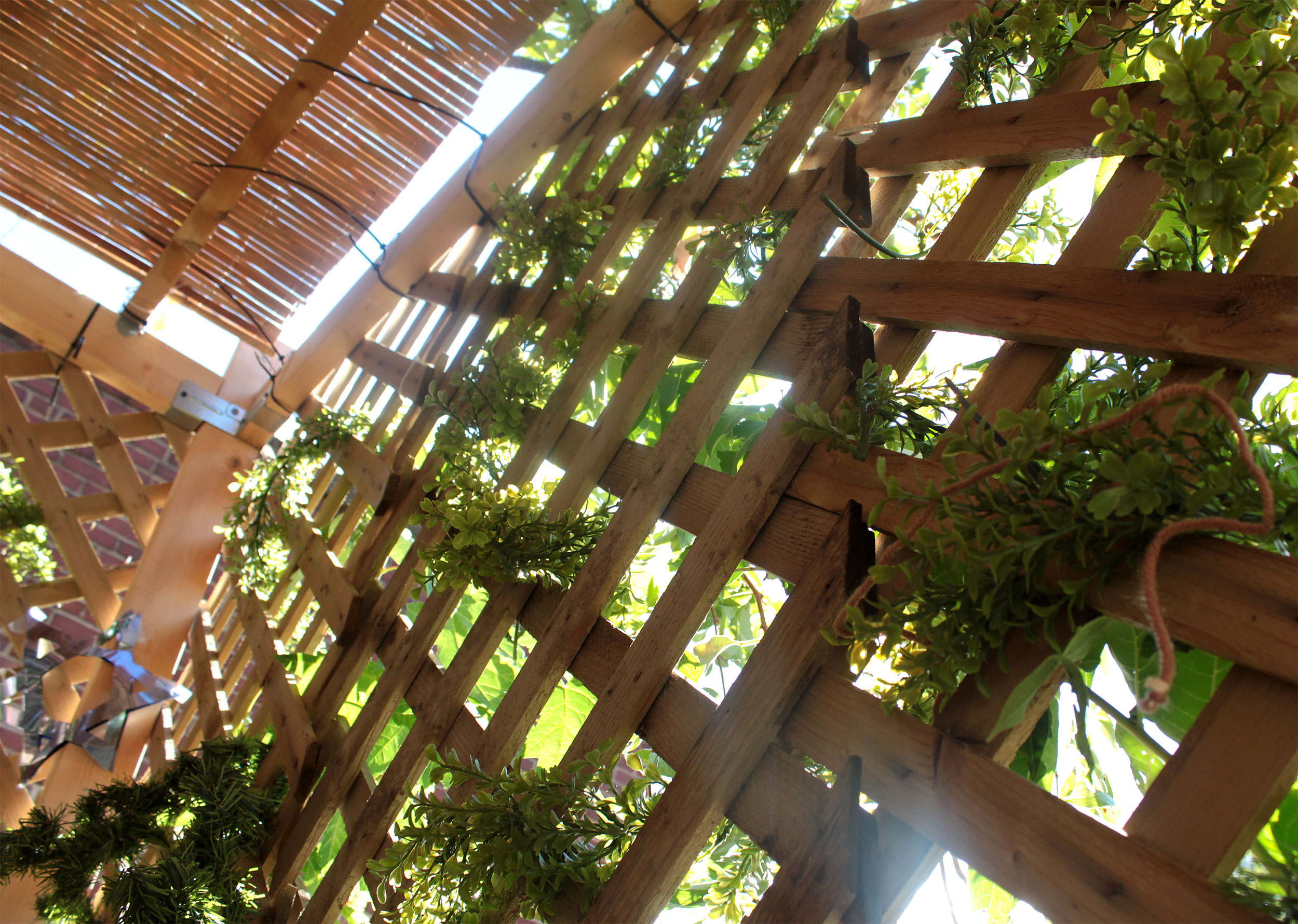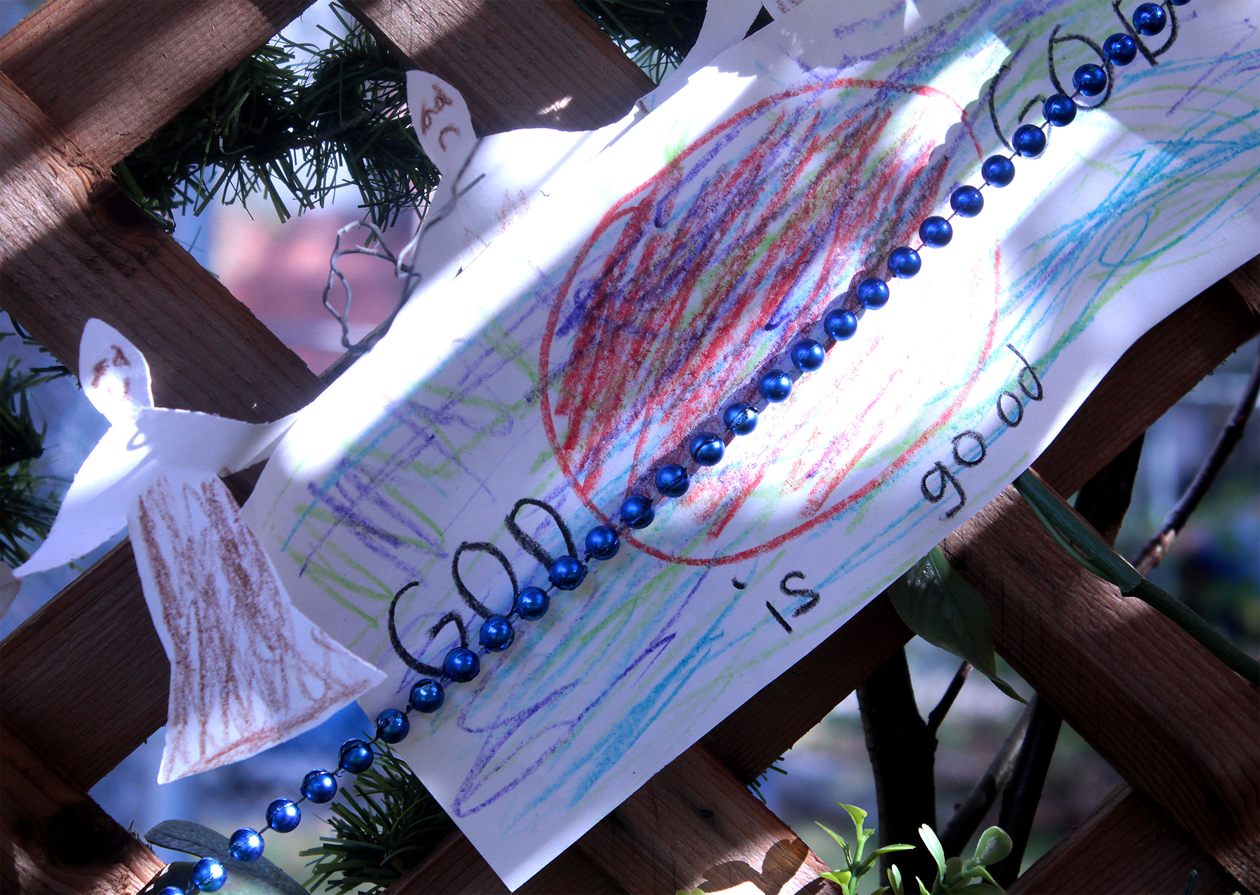 Students and guests decorate the exterior of the sukkah, located in the yard behind Temple Israel, with beads, vines and leafy branches collected from the area.