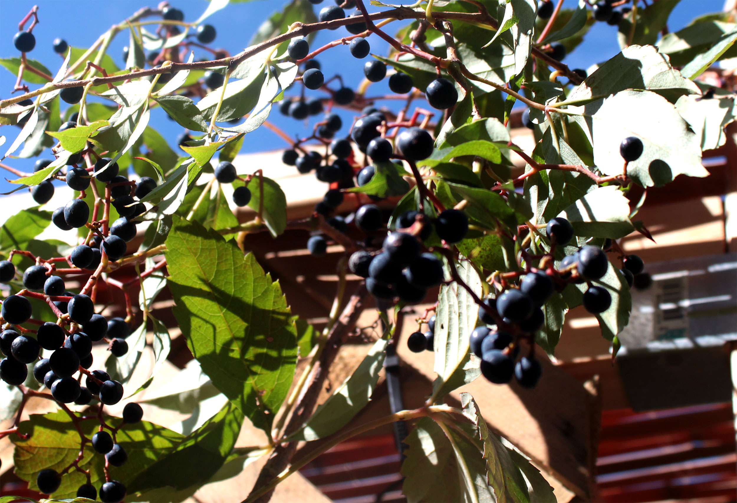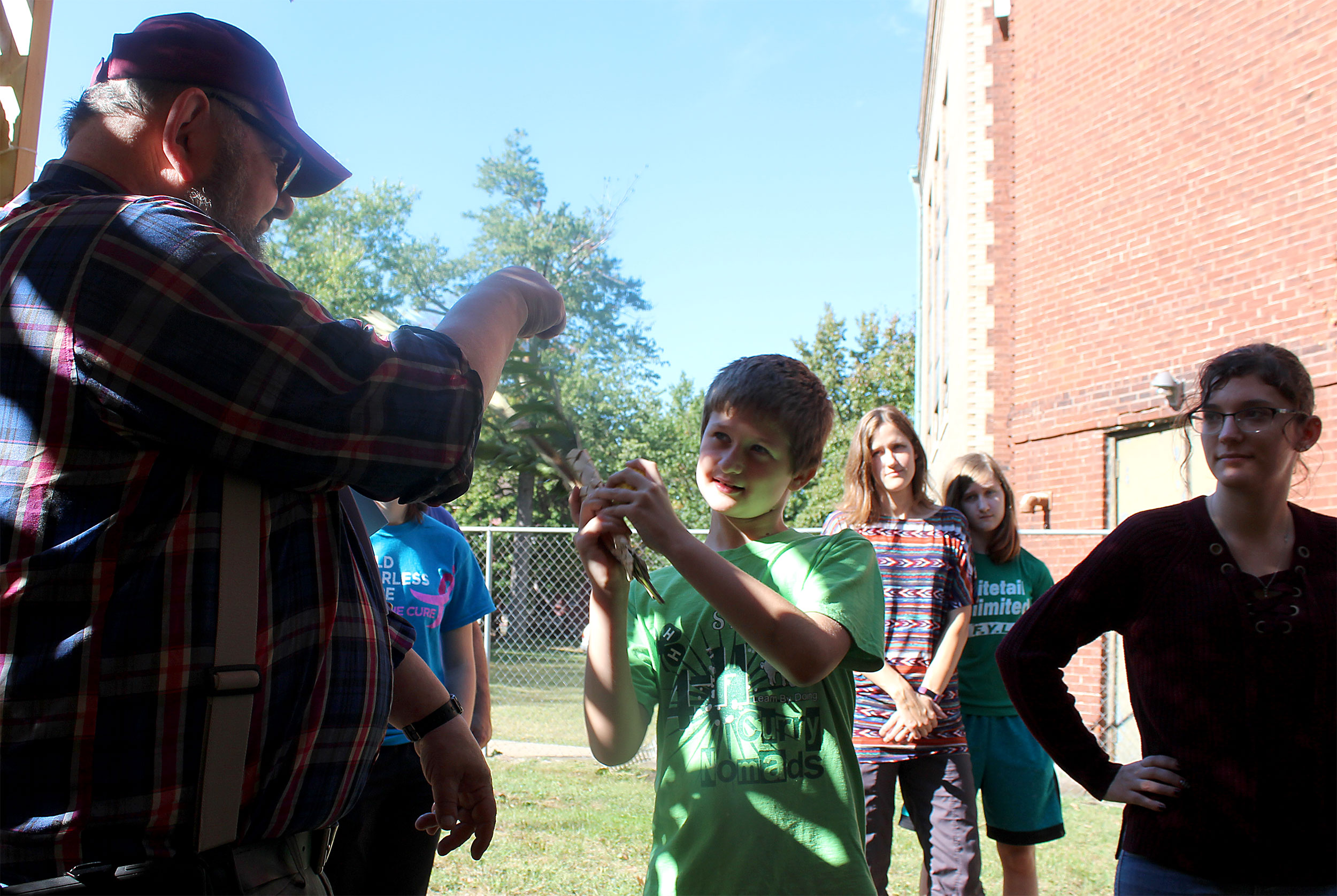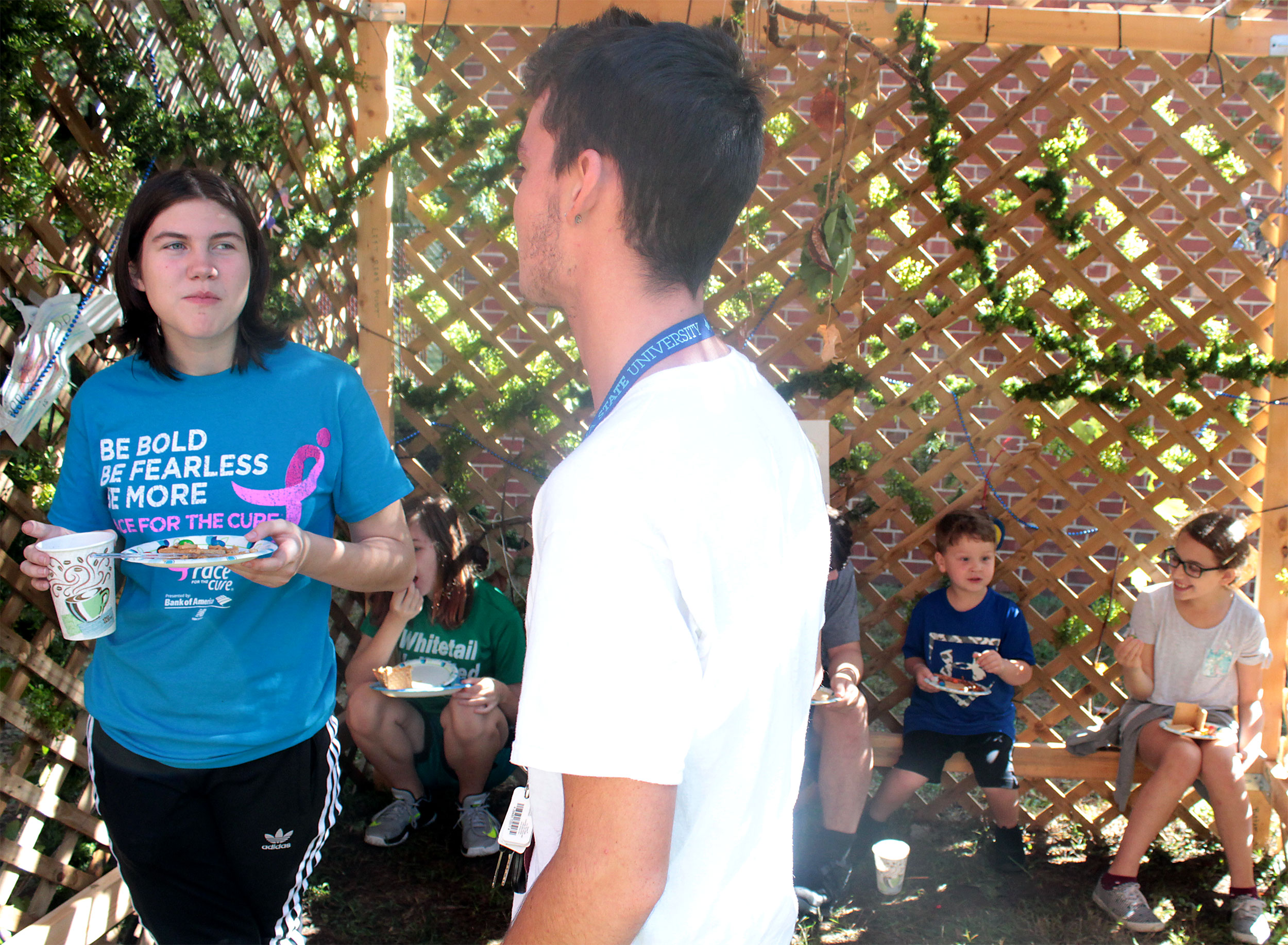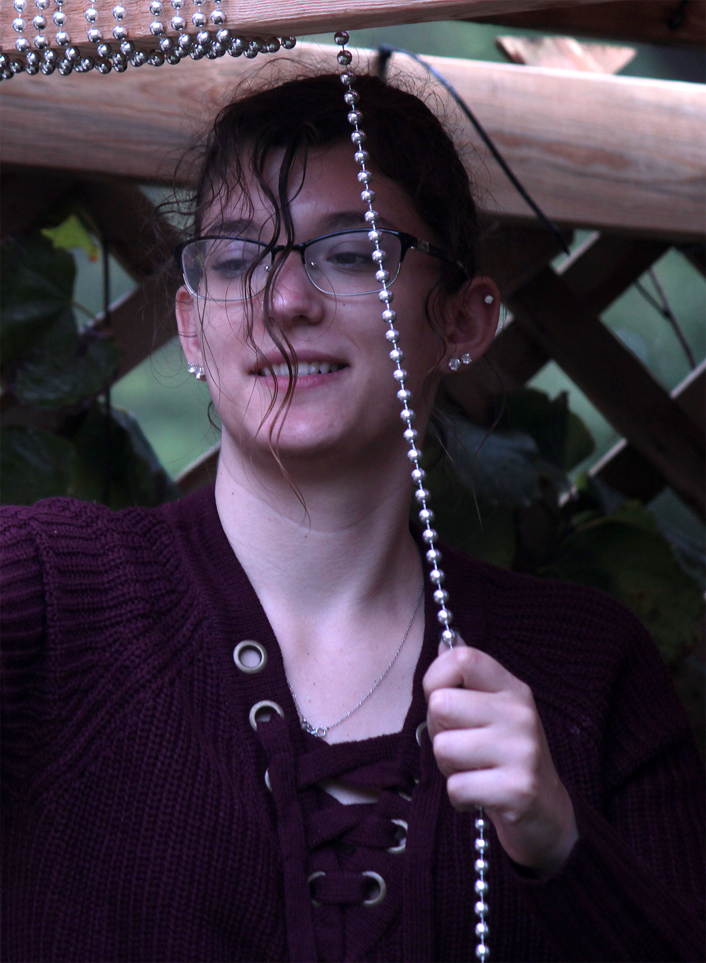 Students and guests decorate the exterior of the sukkah, located in the yard behind Temple Israel, with beads, vines and leafy branches collected from the area.