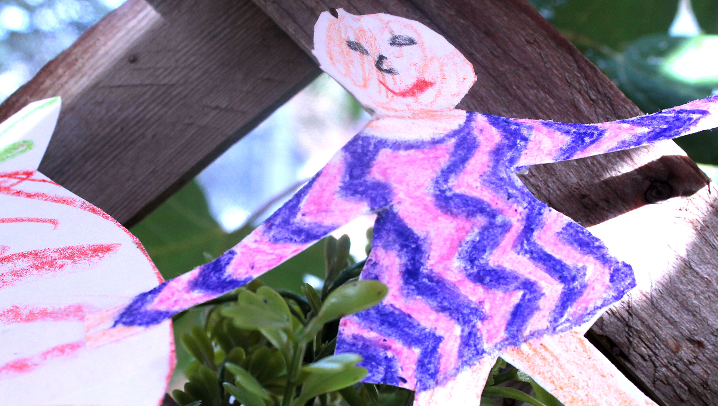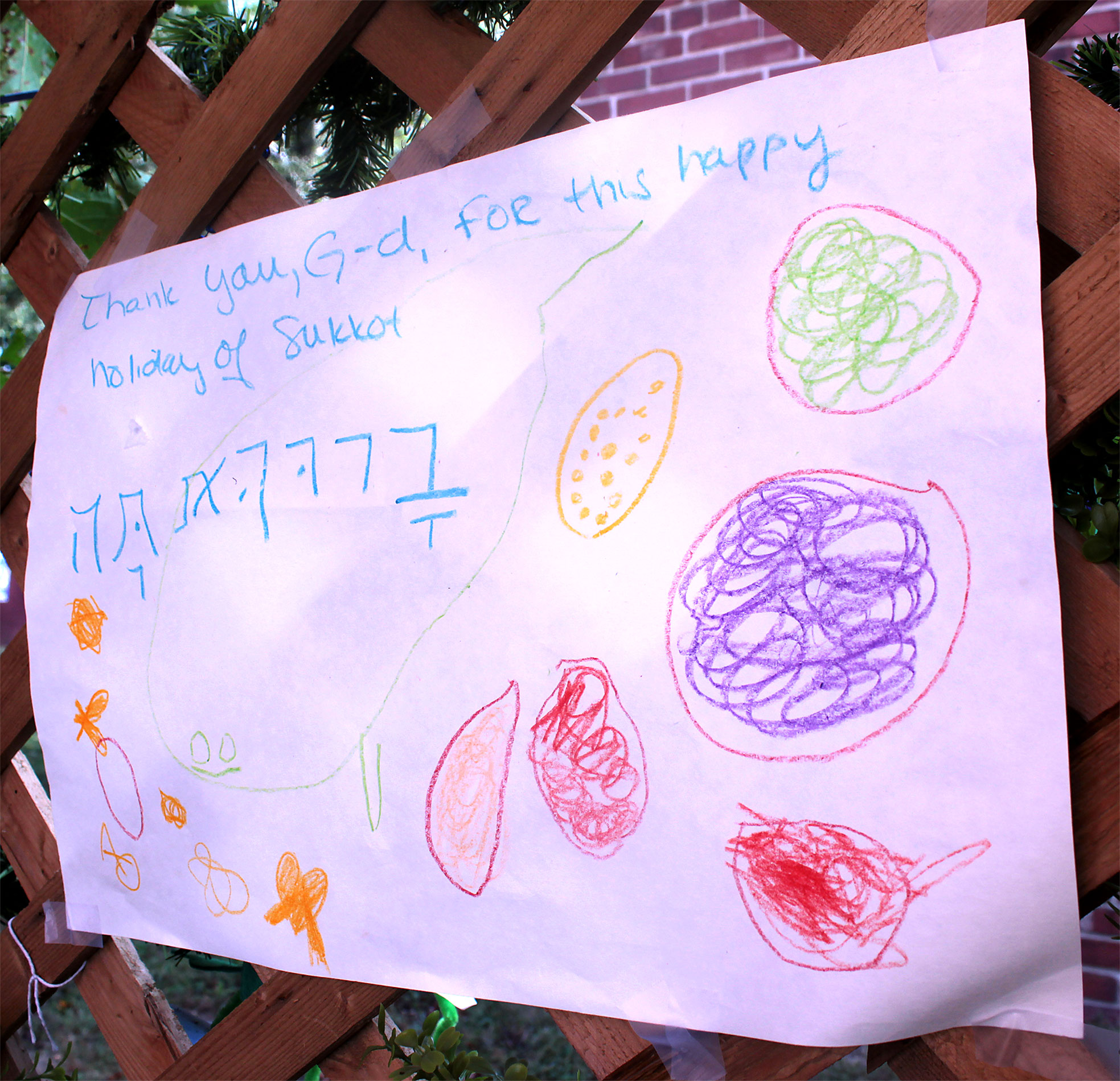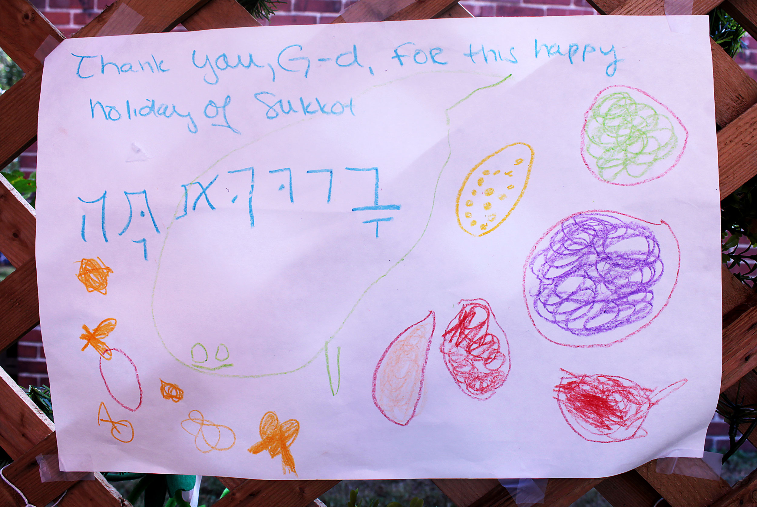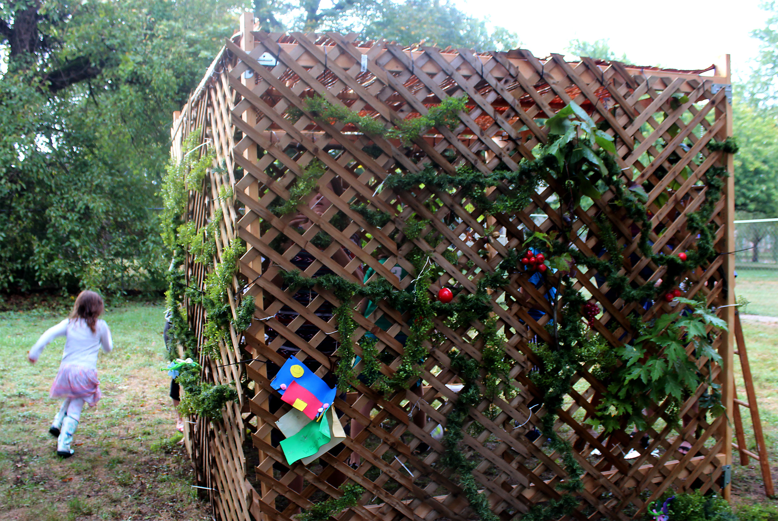 The sukkah’s walls display student artwork.