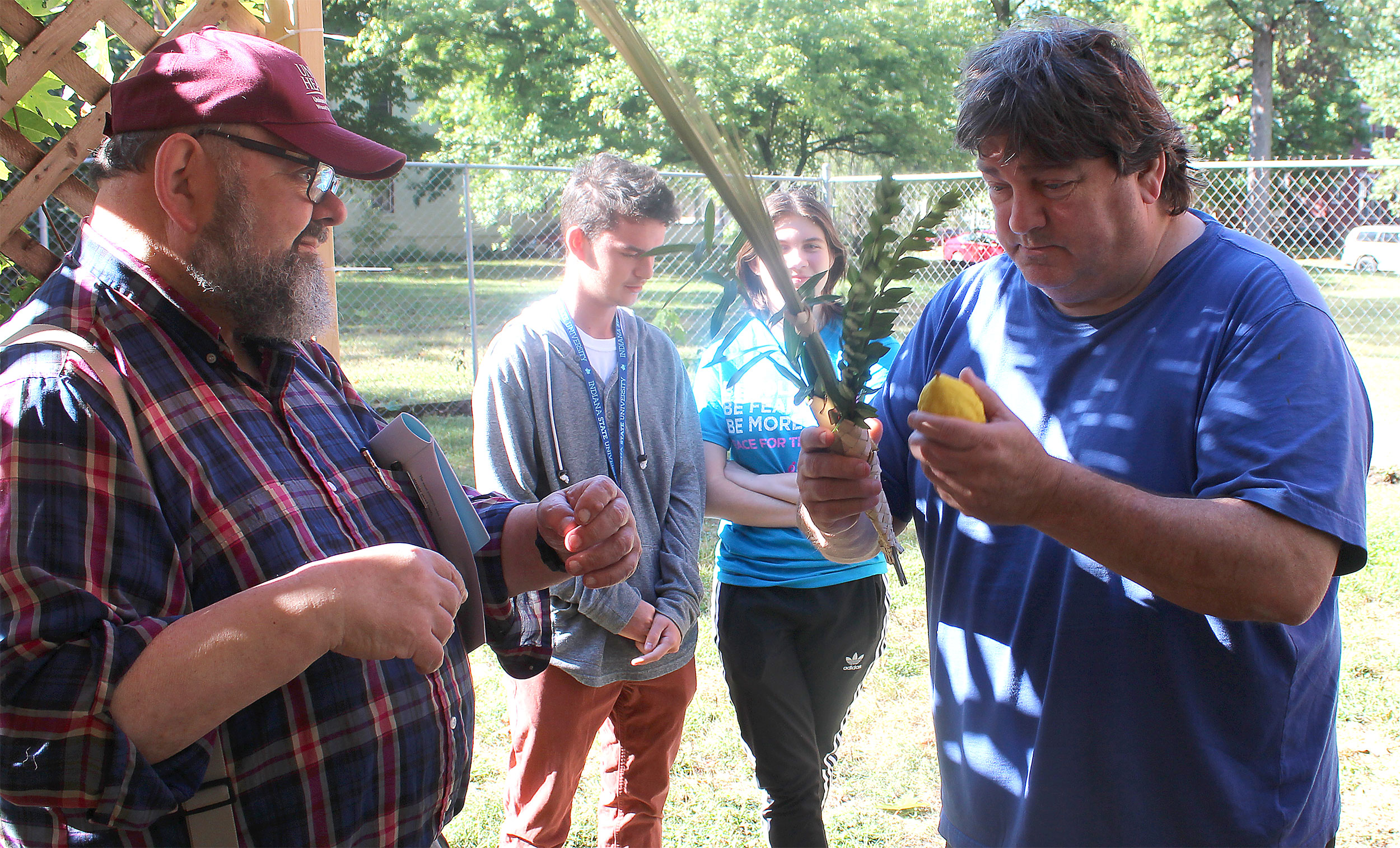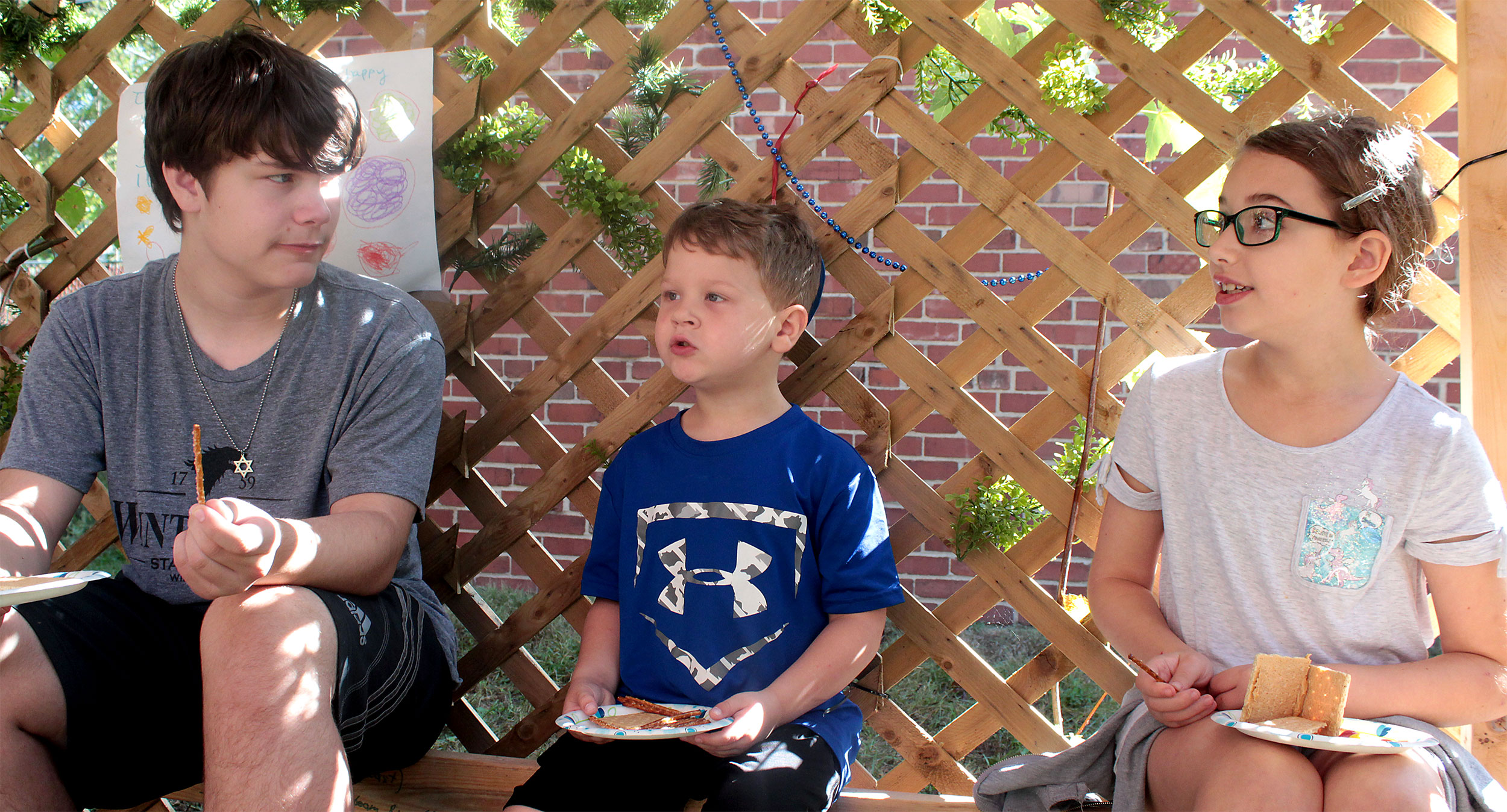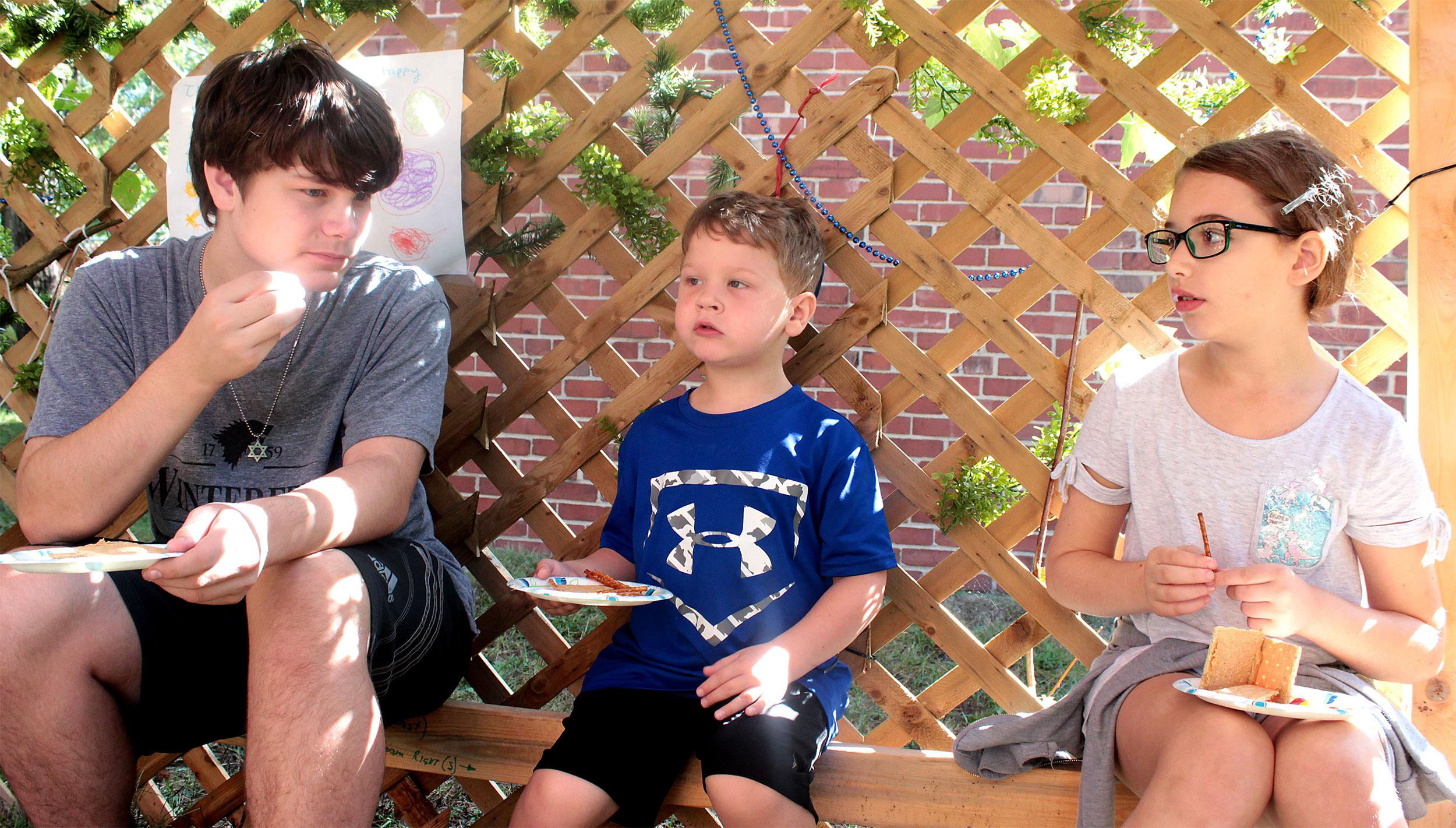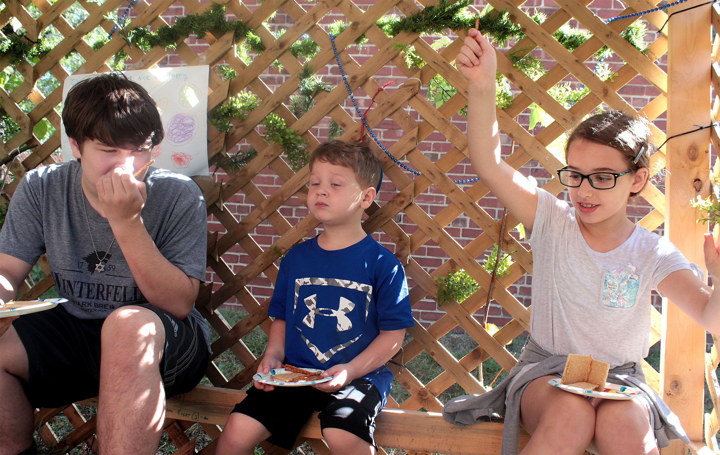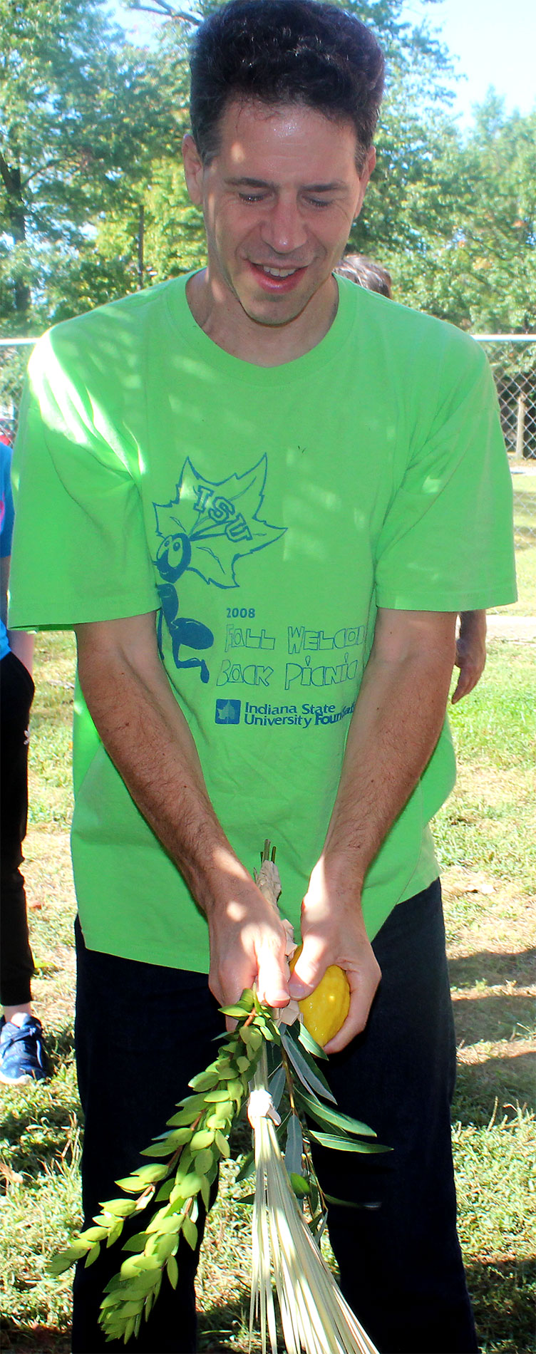 United Hebrew Congregation Terre Haute Sunday school students draped a bare sukkah (raised by volunteers a week earlier) with beads, boughs and drawings last weekend, shook the lulav and etrog and settled into the structure to enjoy holiday snacks.
