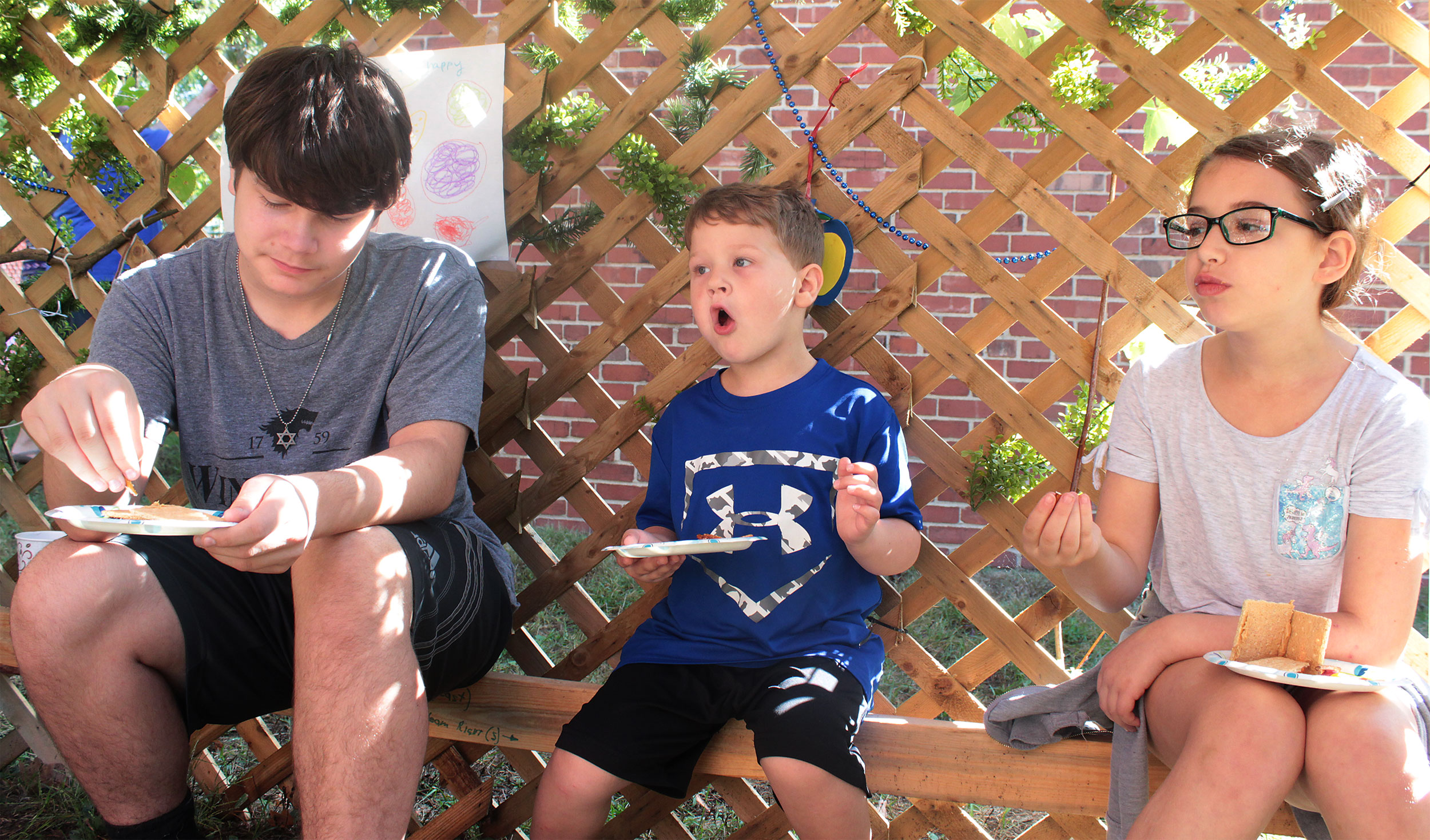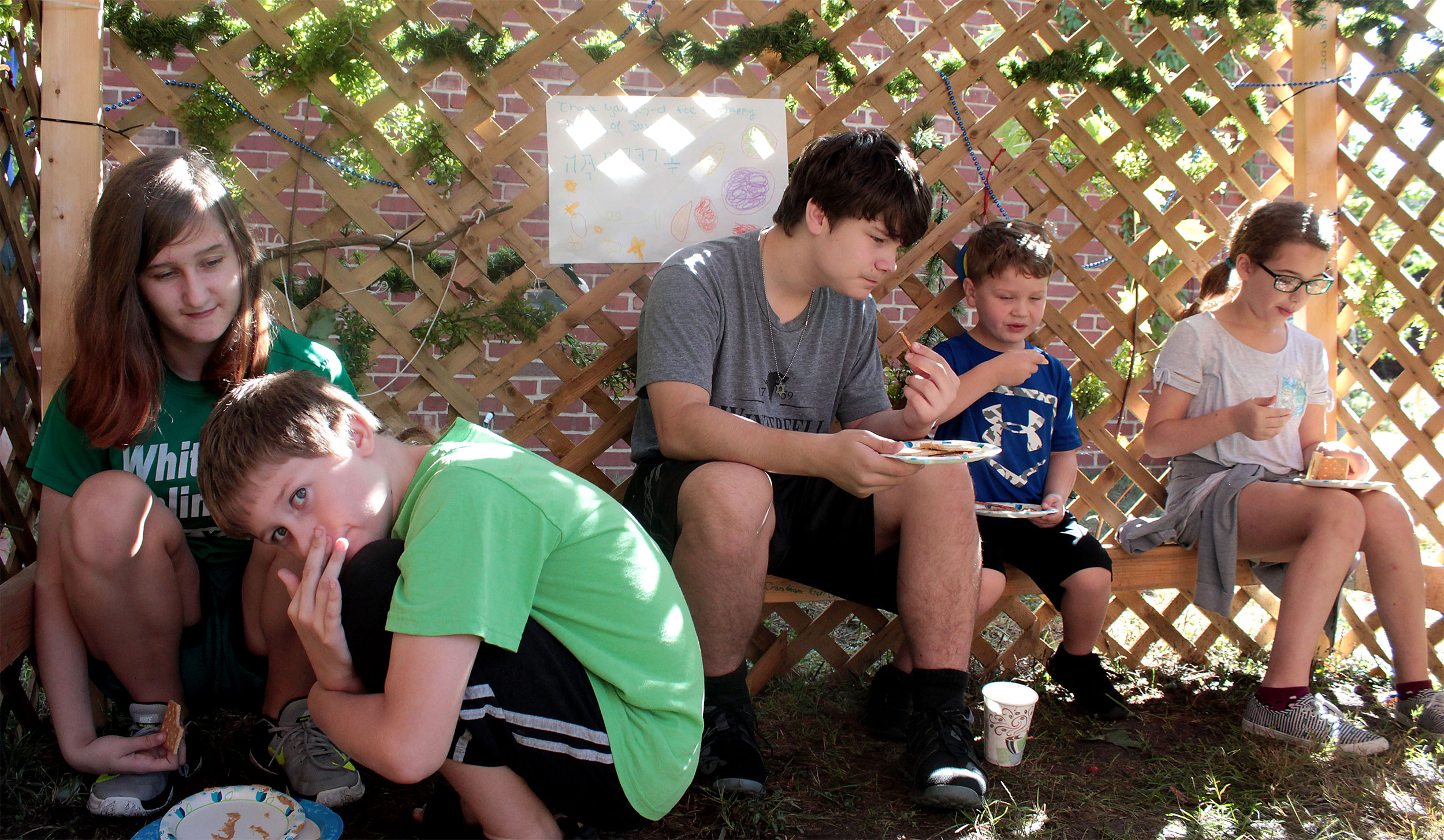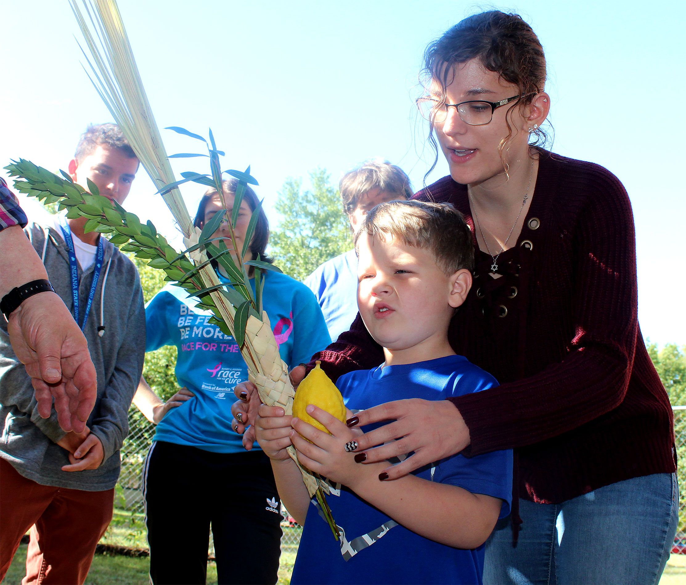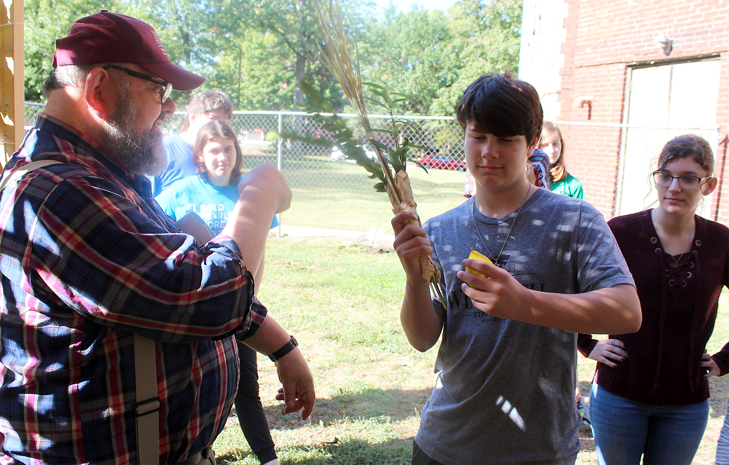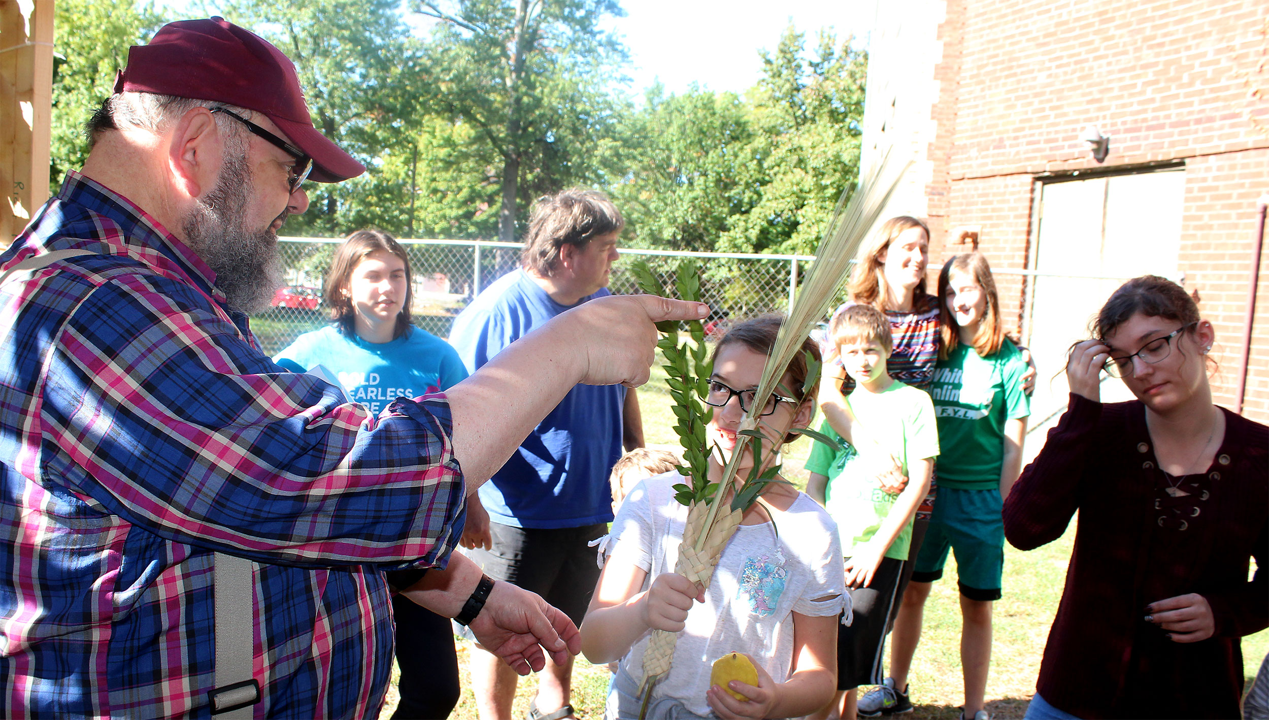 United Hebrew Congregation Terre Haute Sunday school students draped a bare sukkah (raised by volunteers a week earlier) with beads, boughs and drawings last weekend, shook the lulav and etrog and settled into the structure to enjoy holiday snacks.