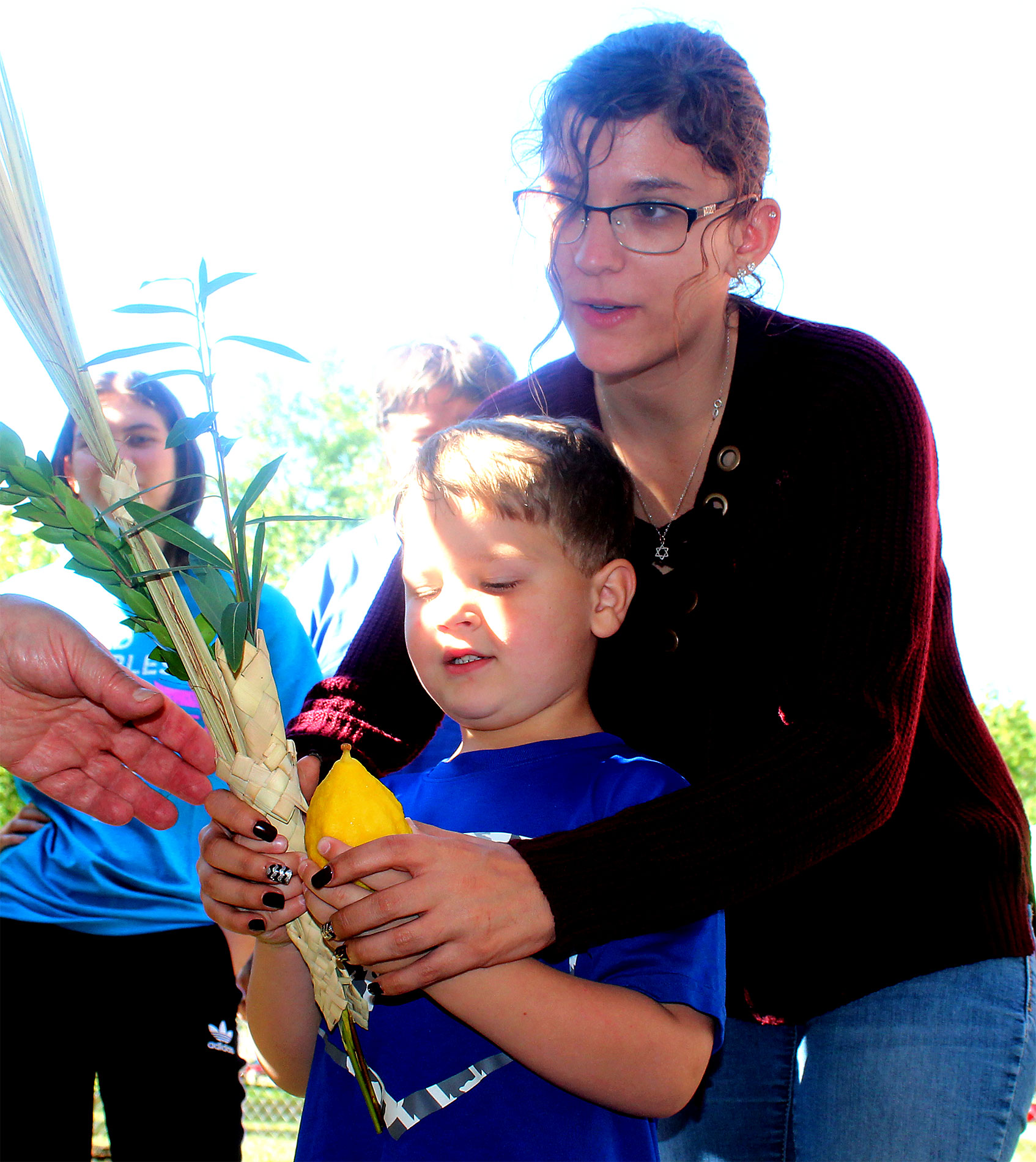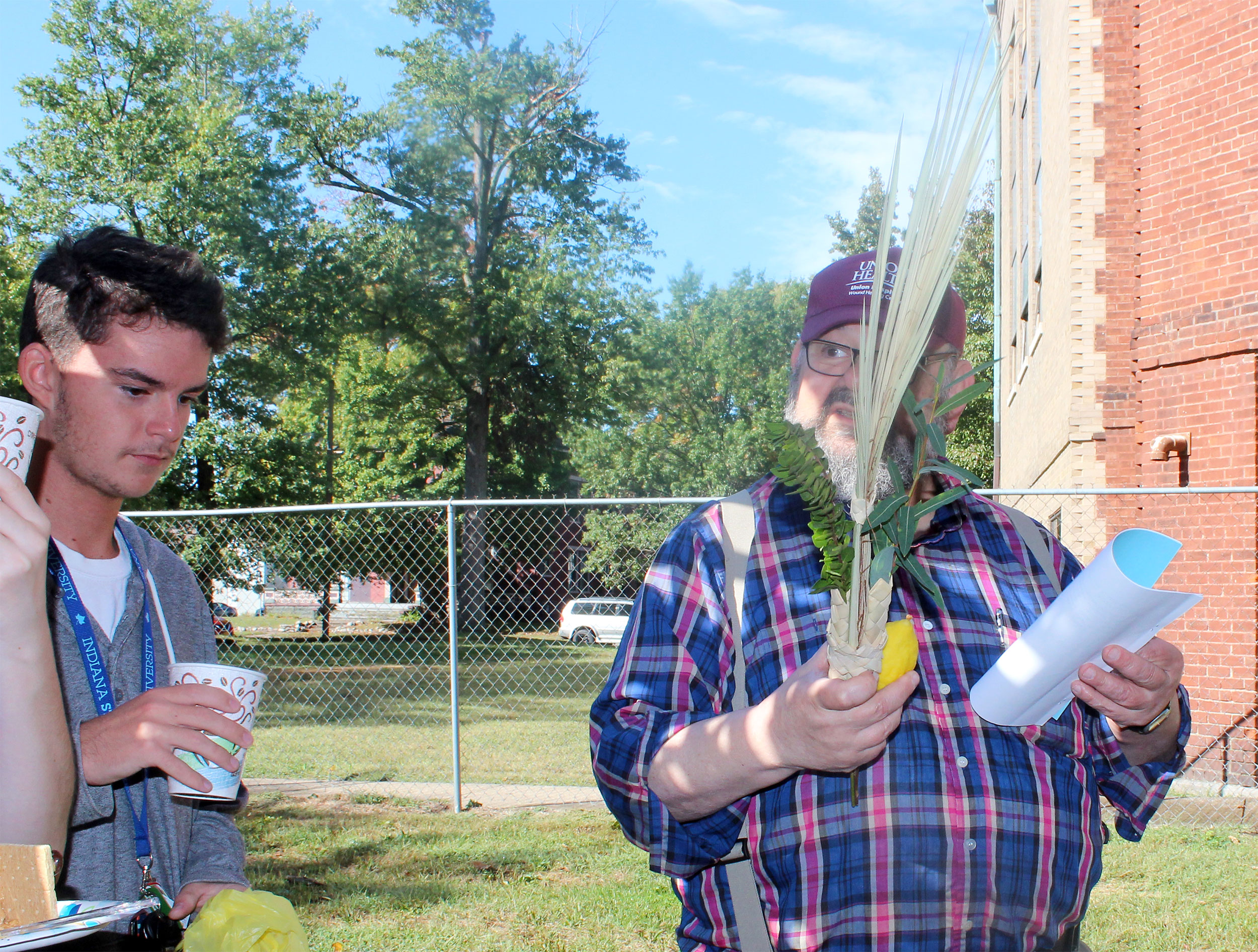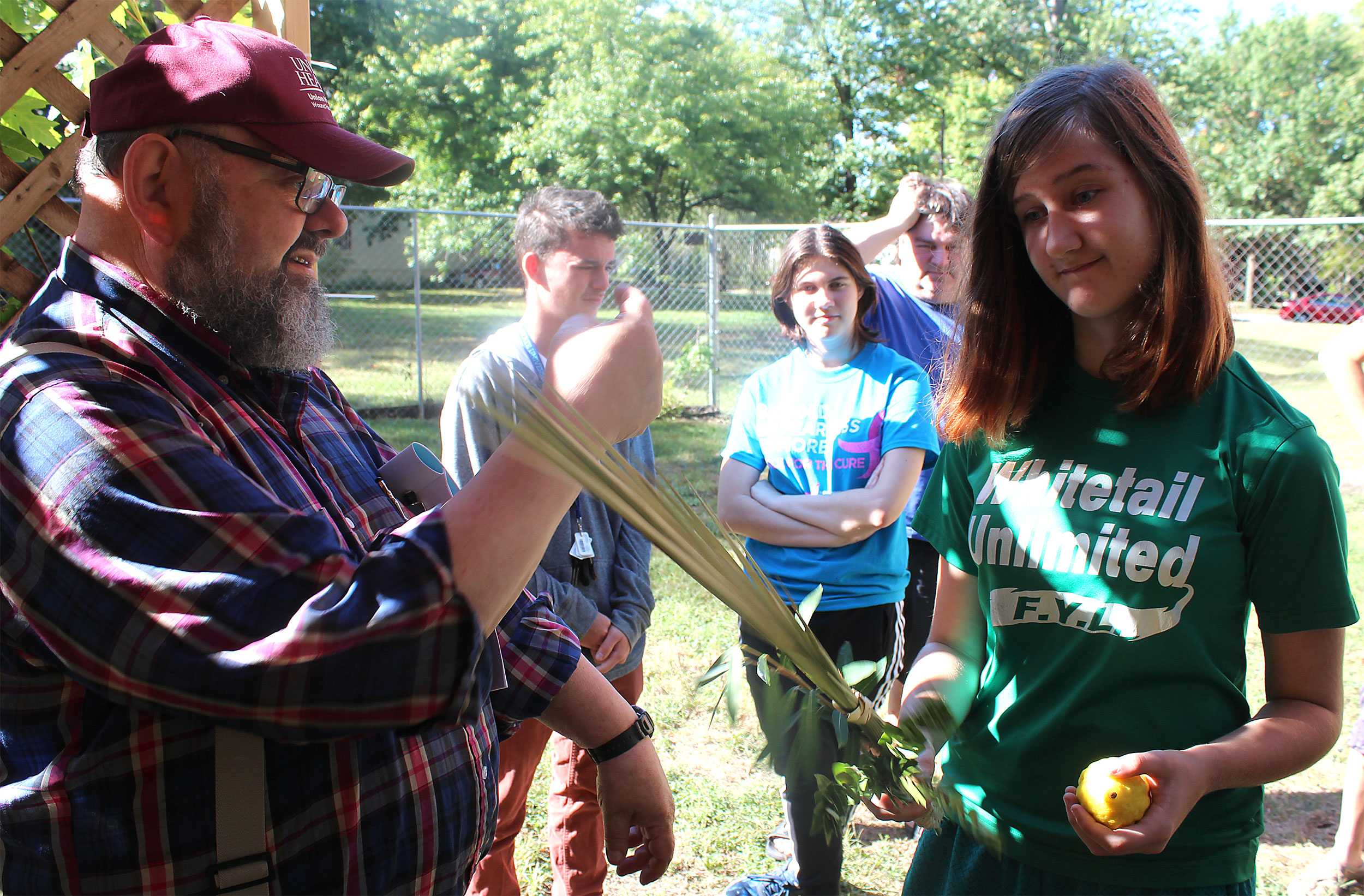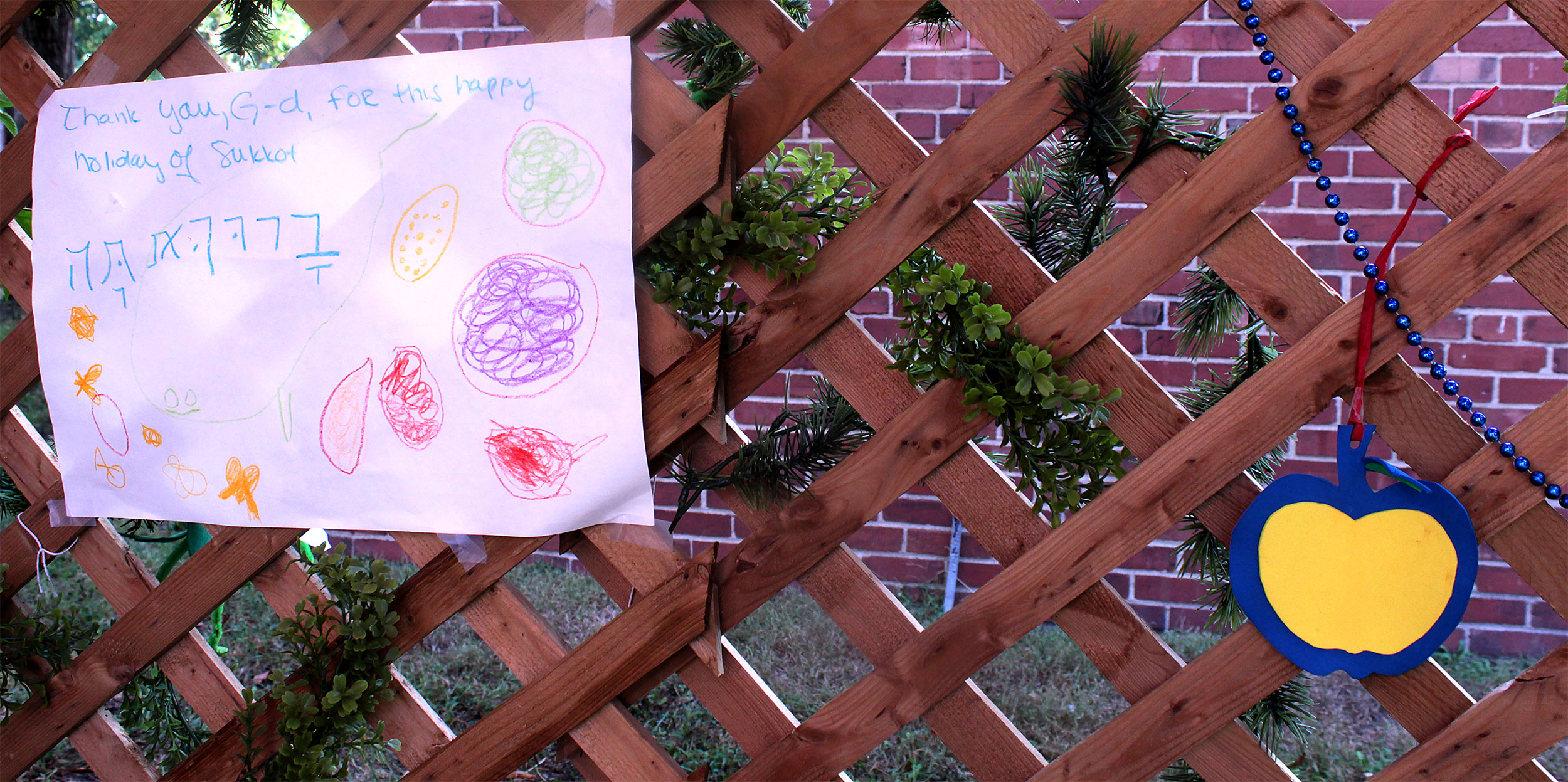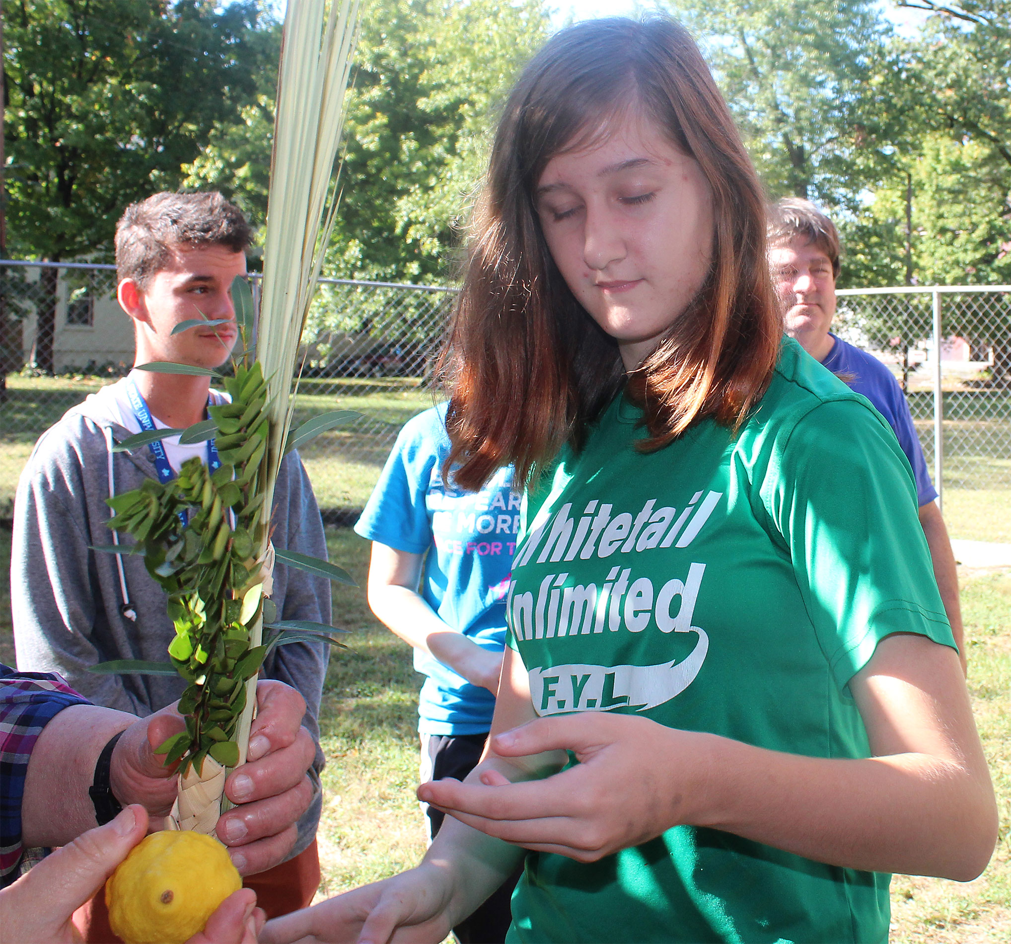 United Hebrew Congregation Terre Haute Sunday school students draped a bare sukkah (raised by volunteers a week earlier) with beads, boughs and drawings last weekend, shook the lulav and etrog and settled into the structure to enjoy holiday snacks.
