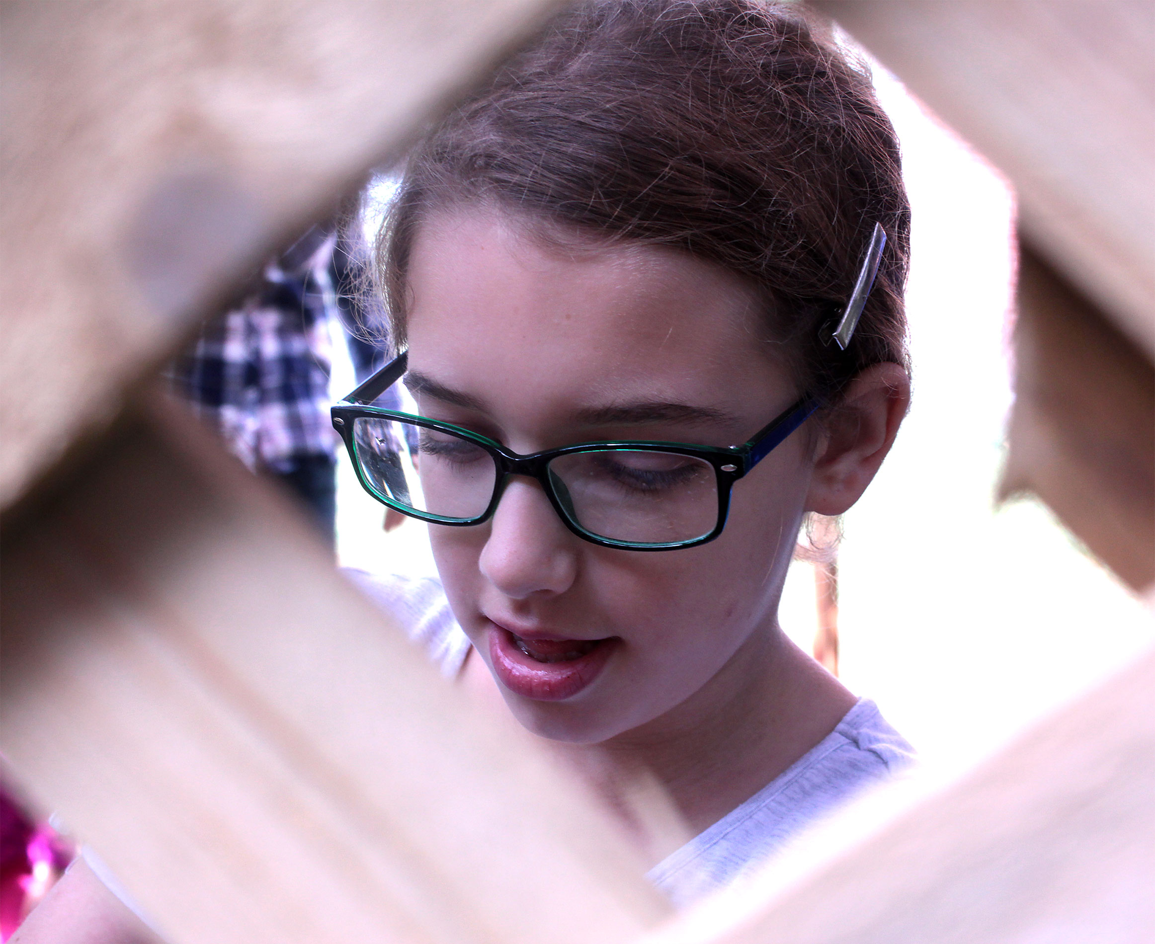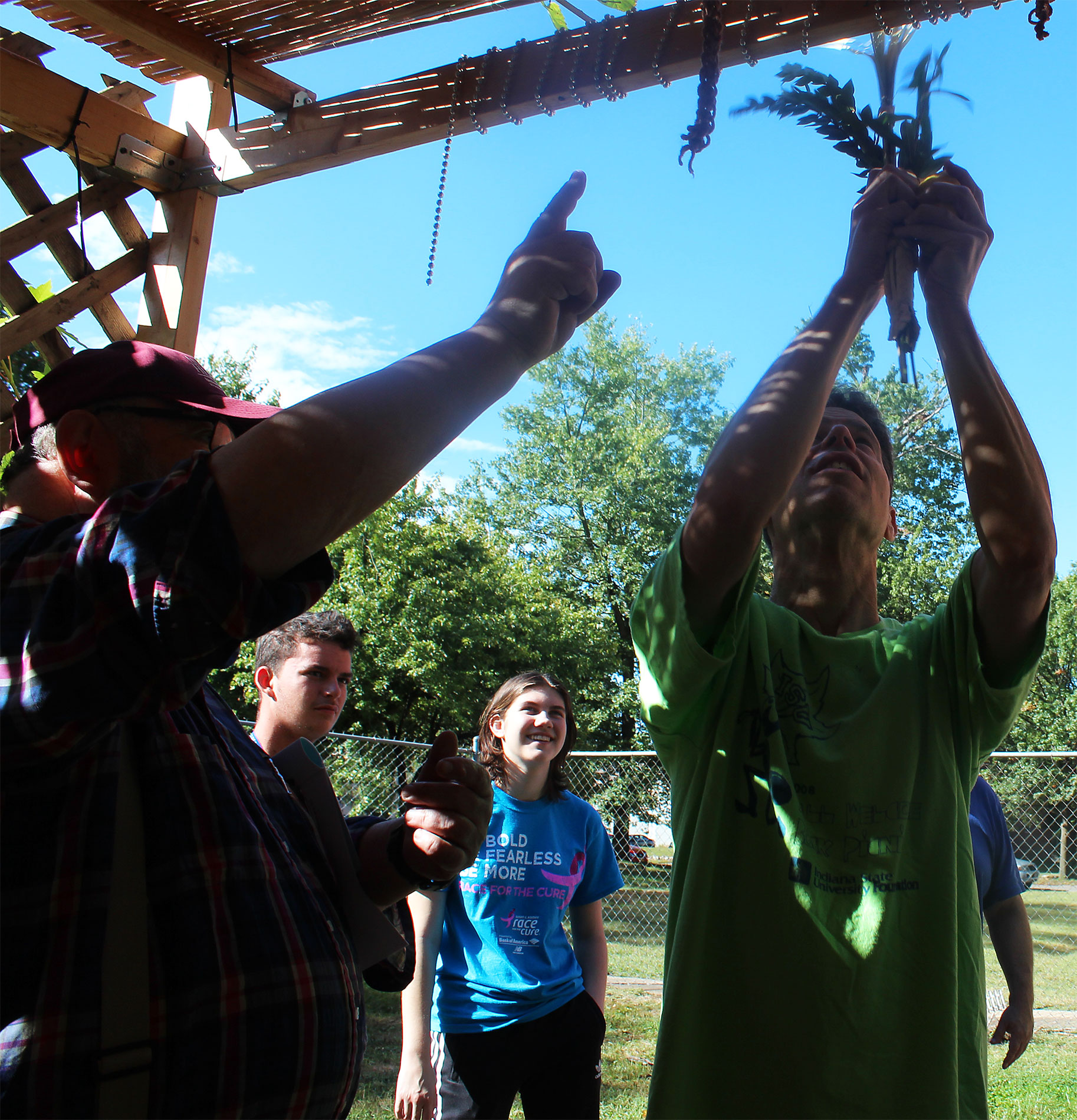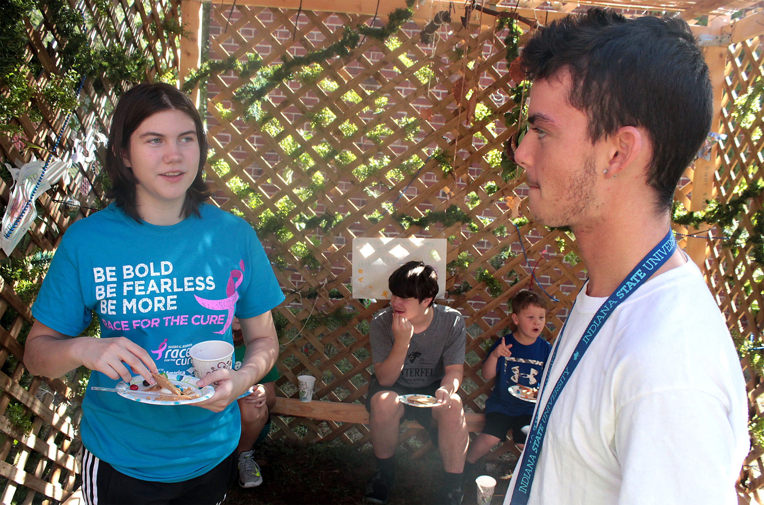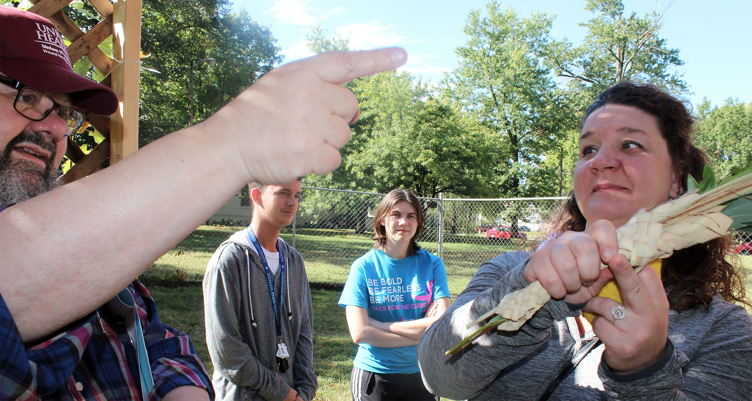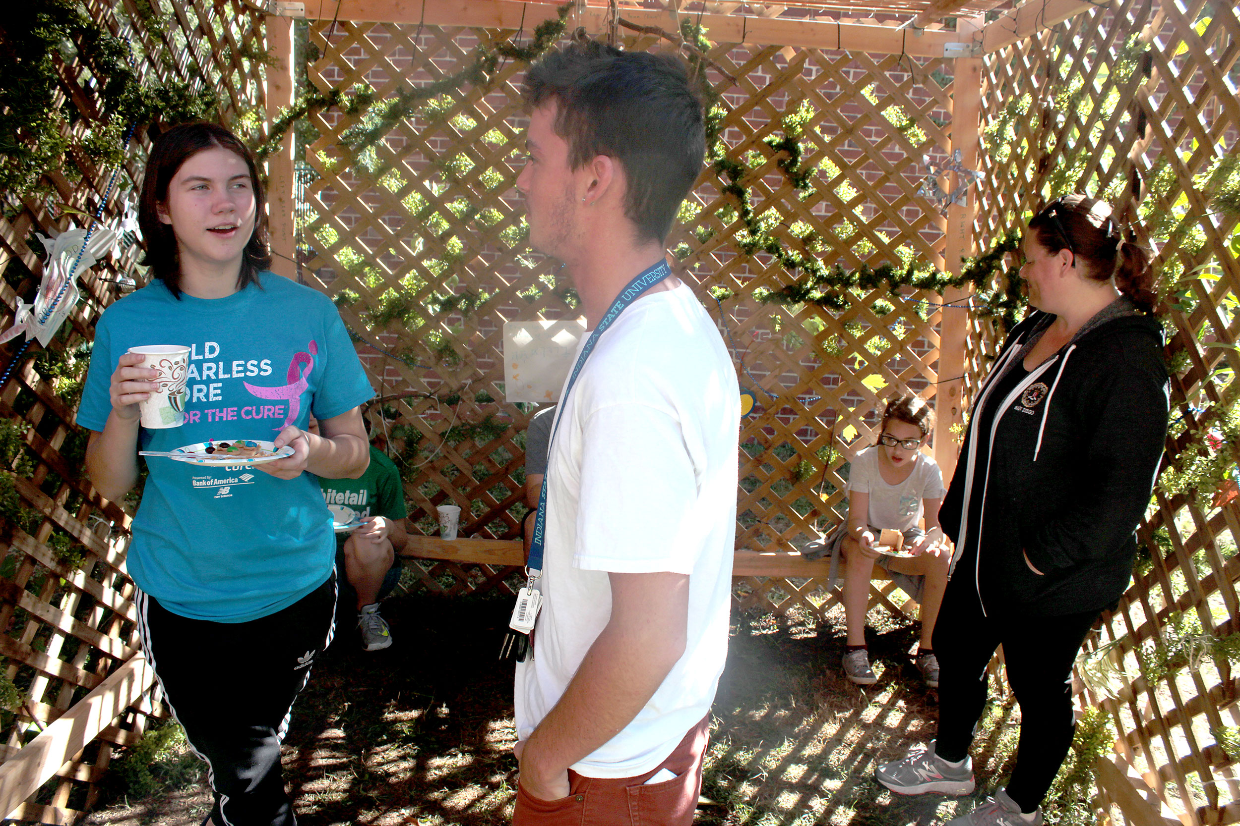 United Hebrew Congregation Terre Haute Sunday school students draped a bare sukkah (raised by volunteers a week earlier) with beads, boughs and drawings last weekend, shook the lulav and etrog and settled into the structure to enjoy holiday snacks.
