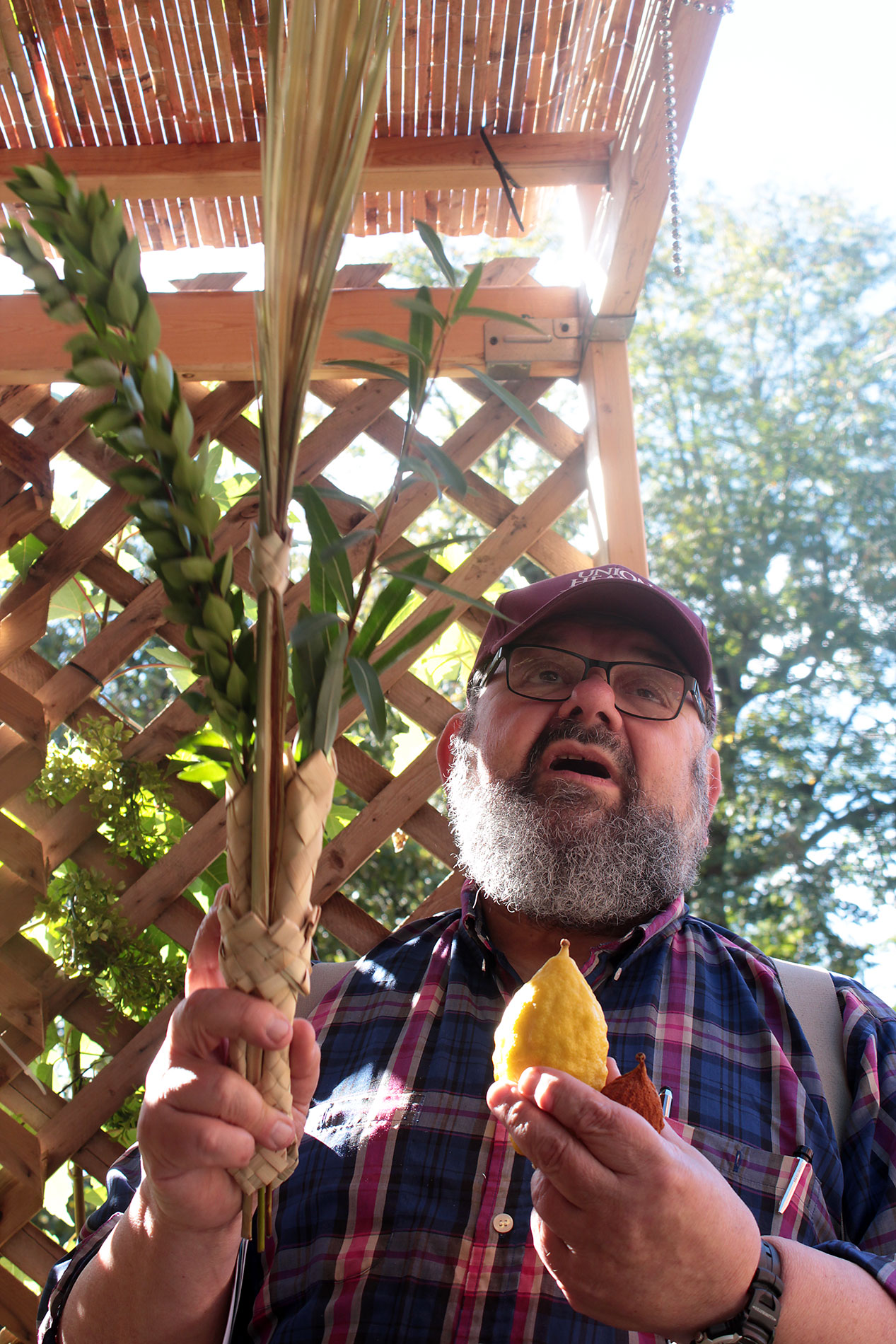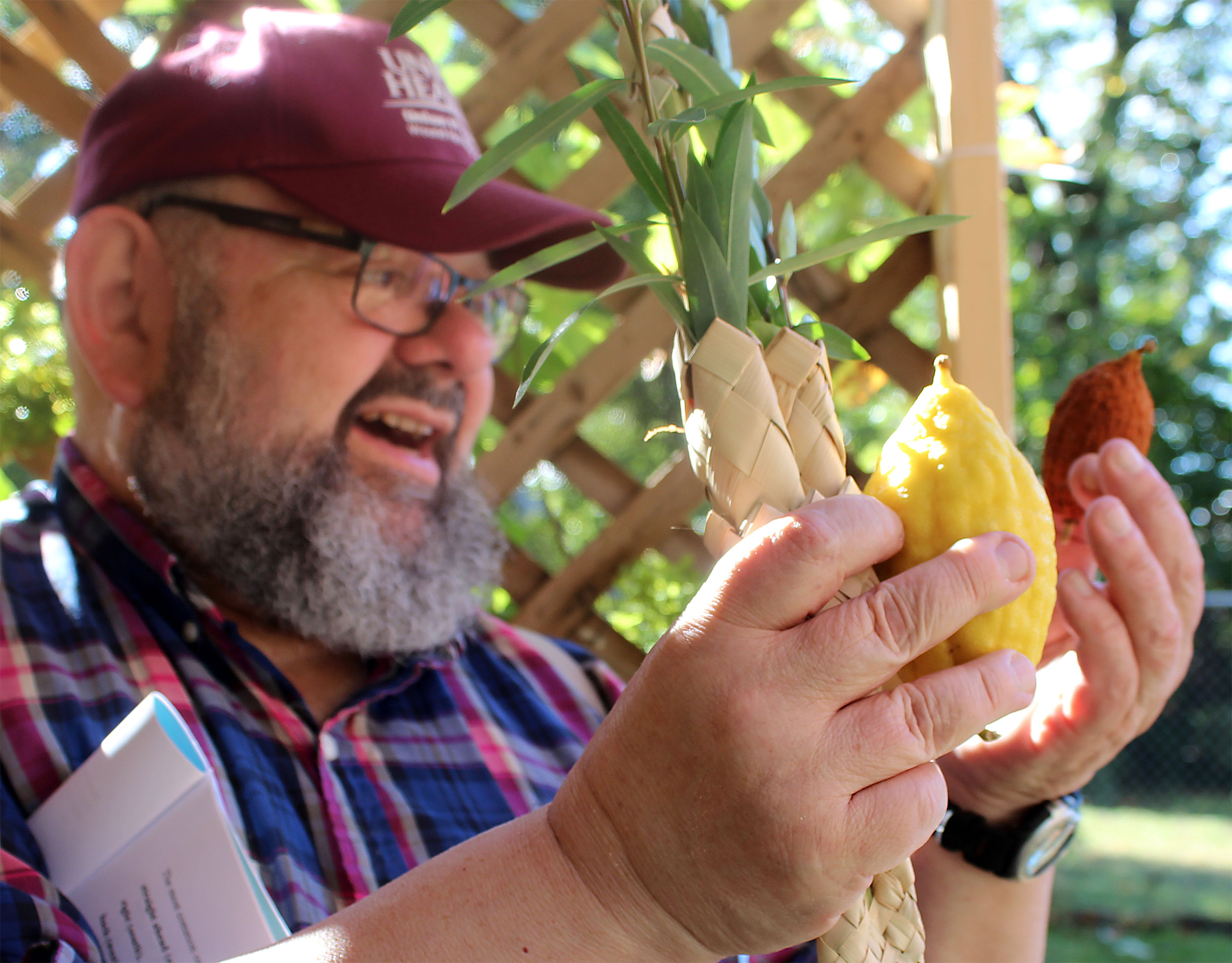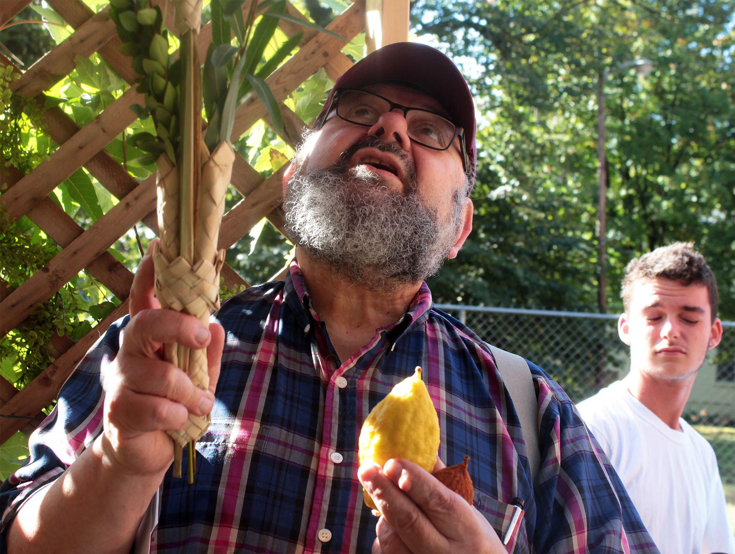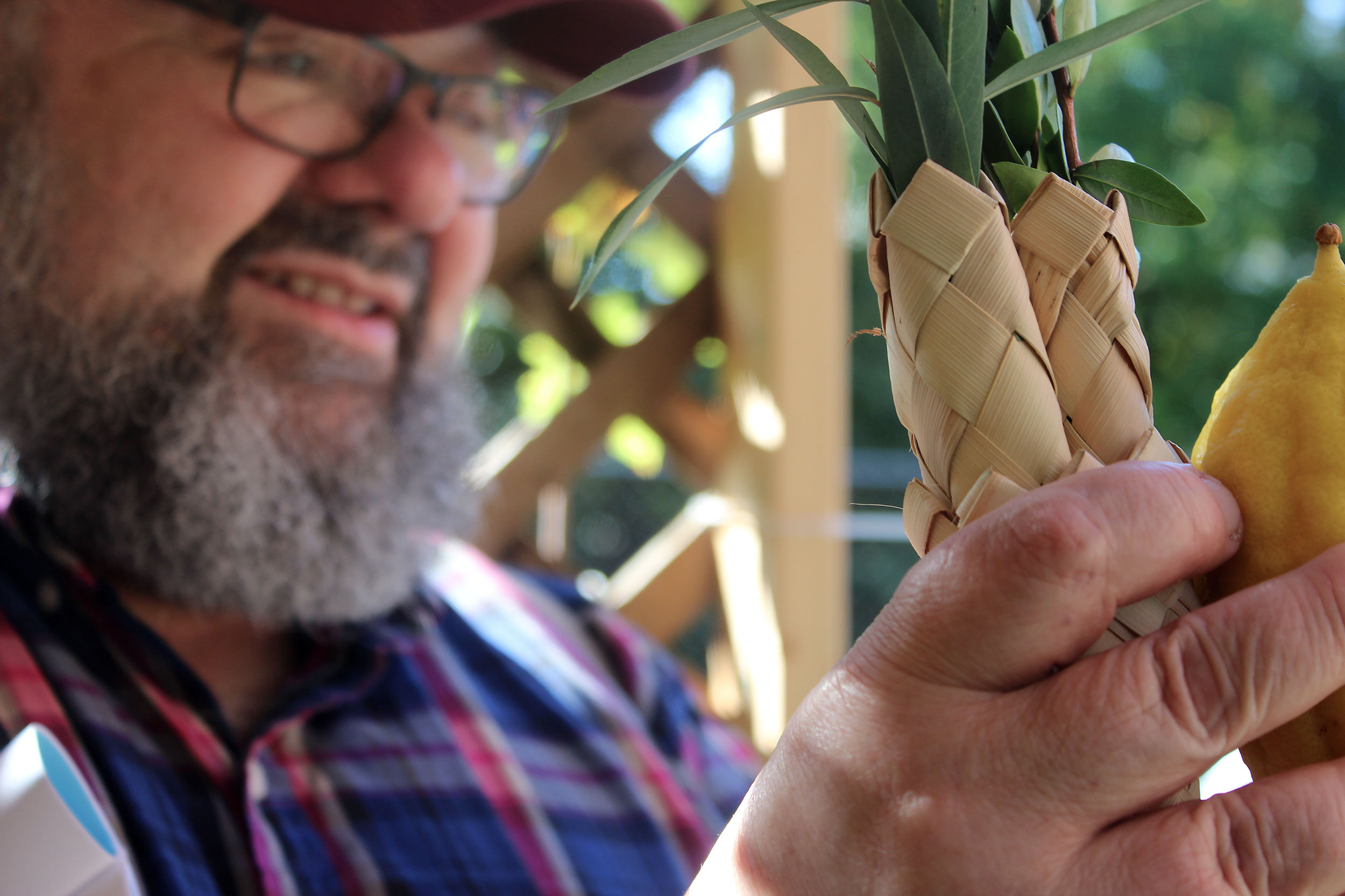 Herschel Chait led the Sukkot service and directed the ritual, as each participant faced east, waving lulav and etrog to west, north, above and below.