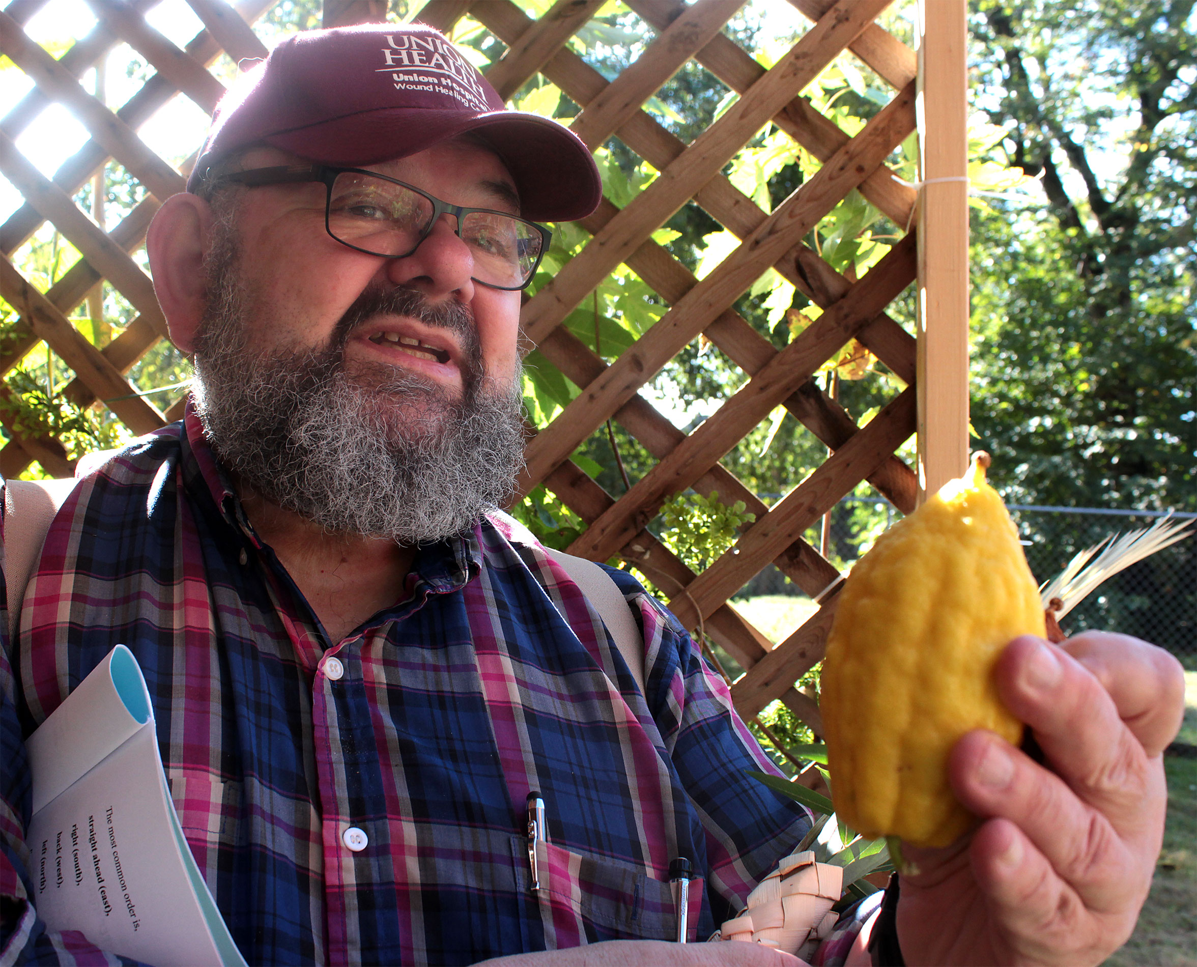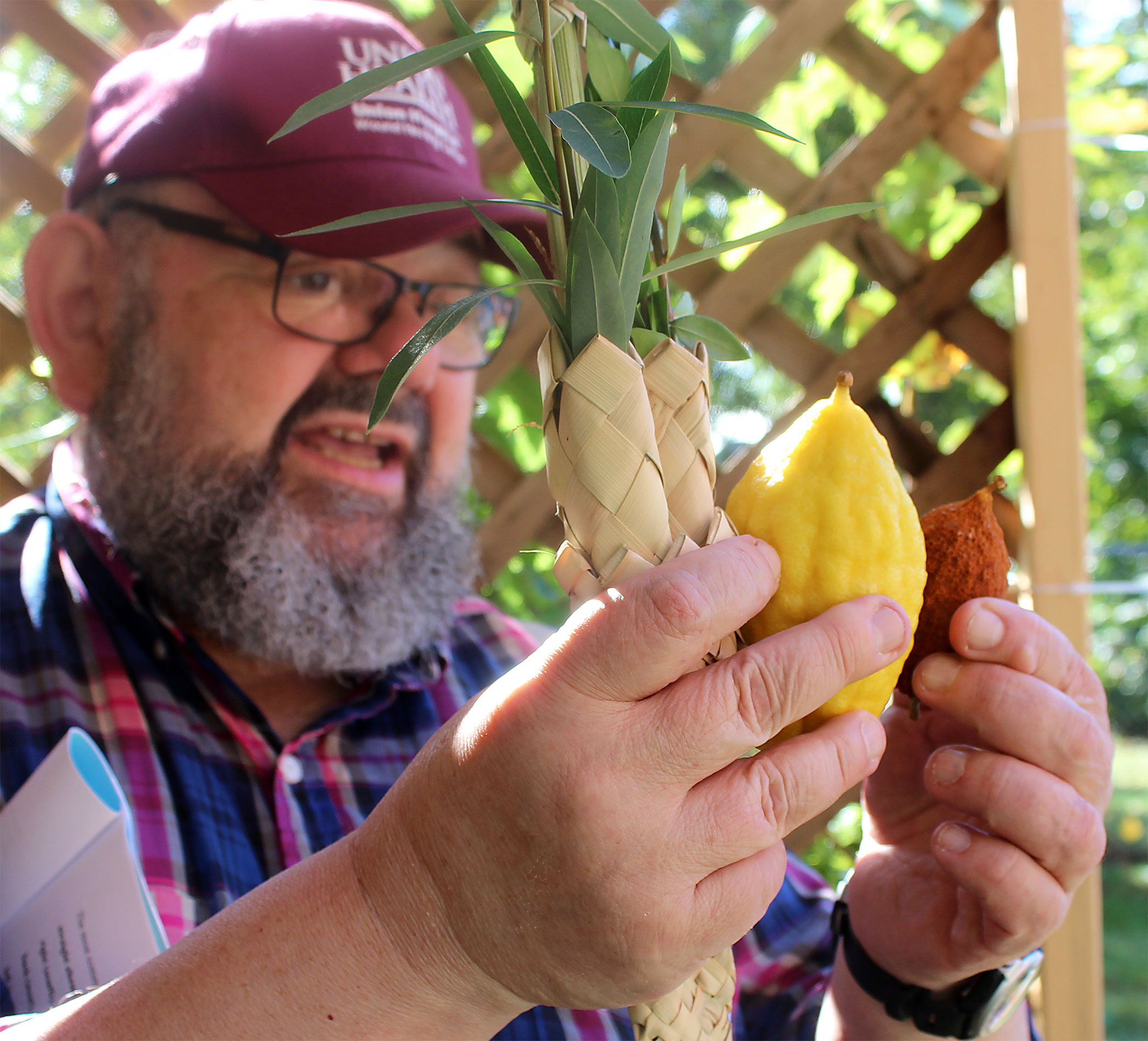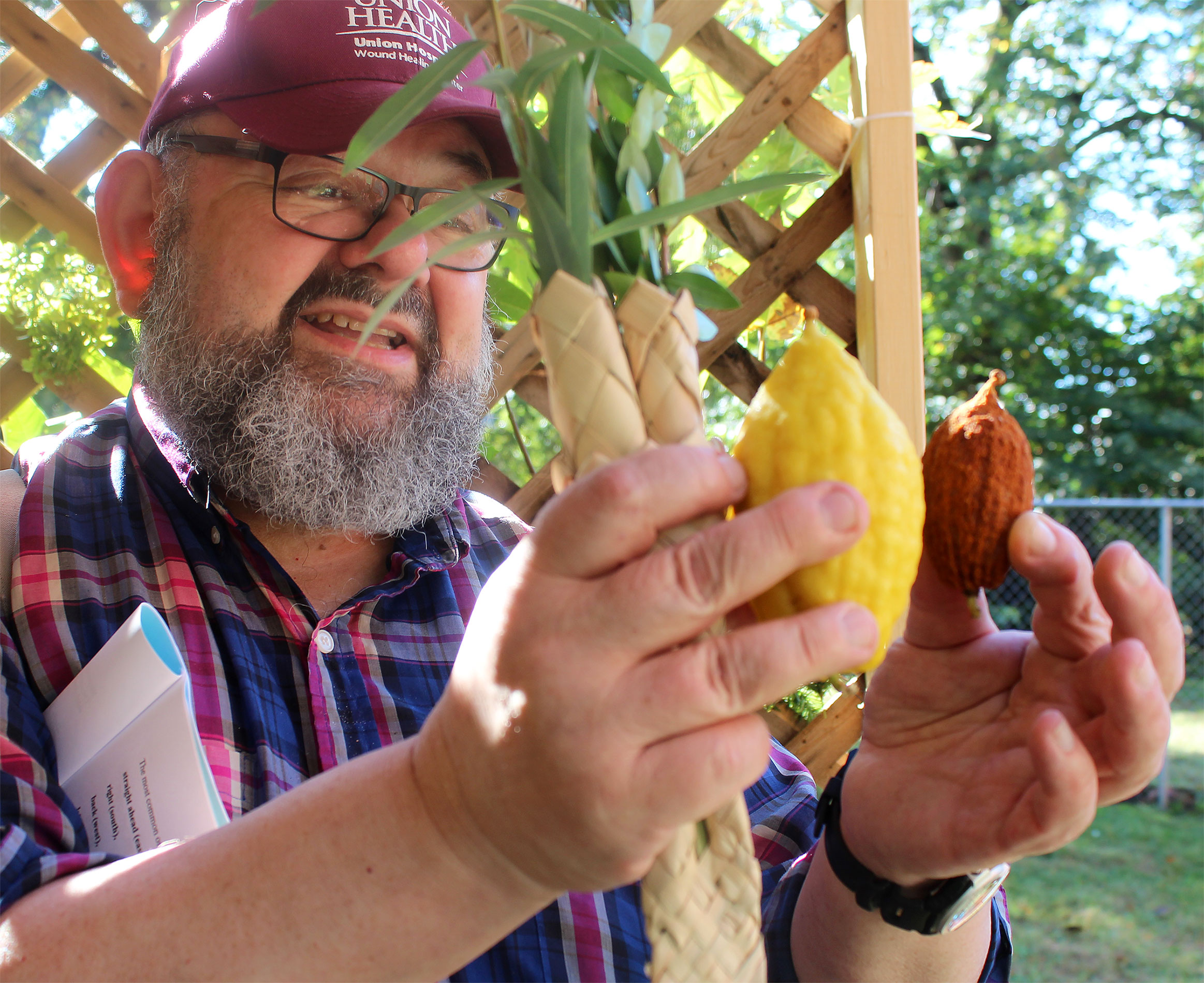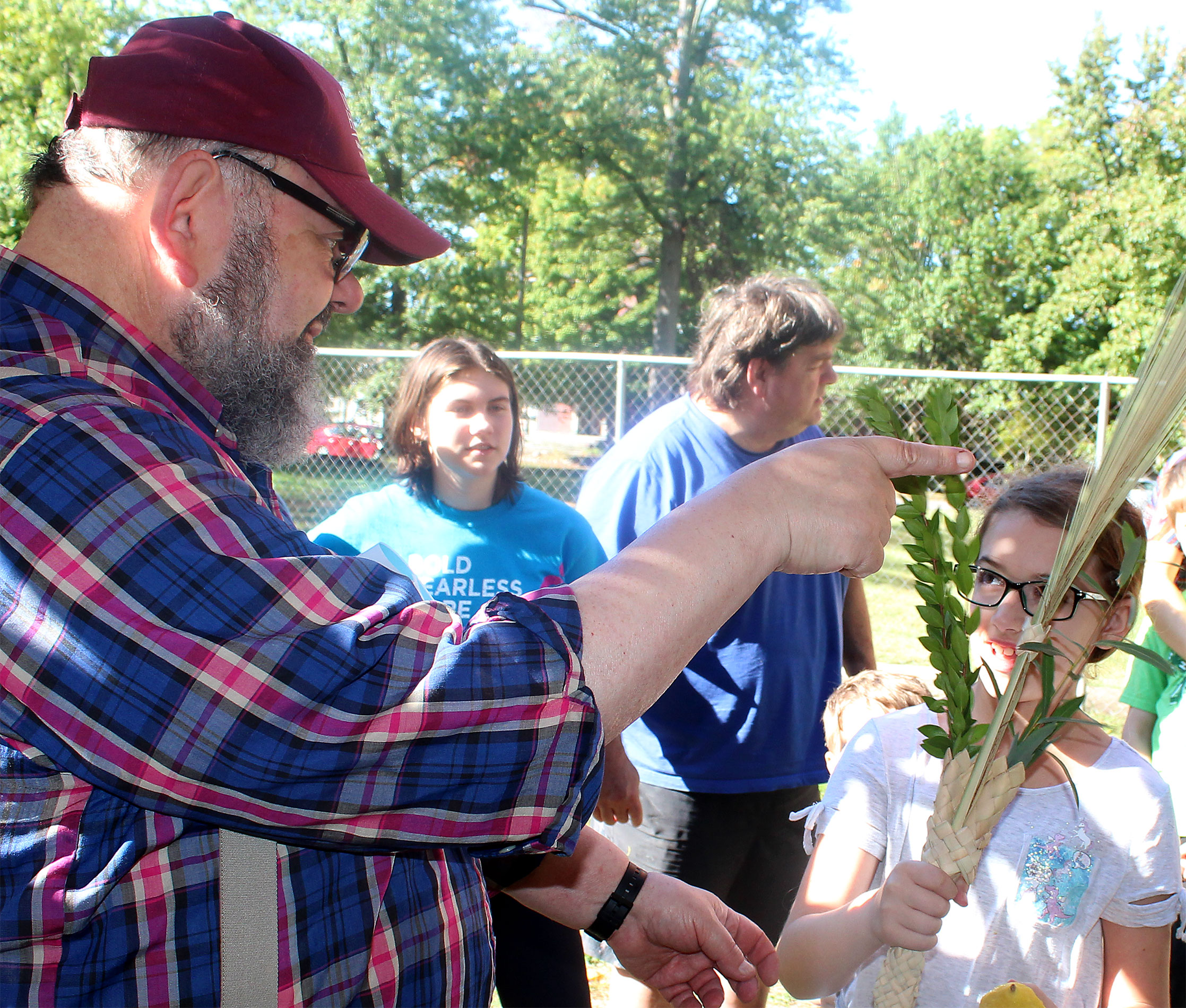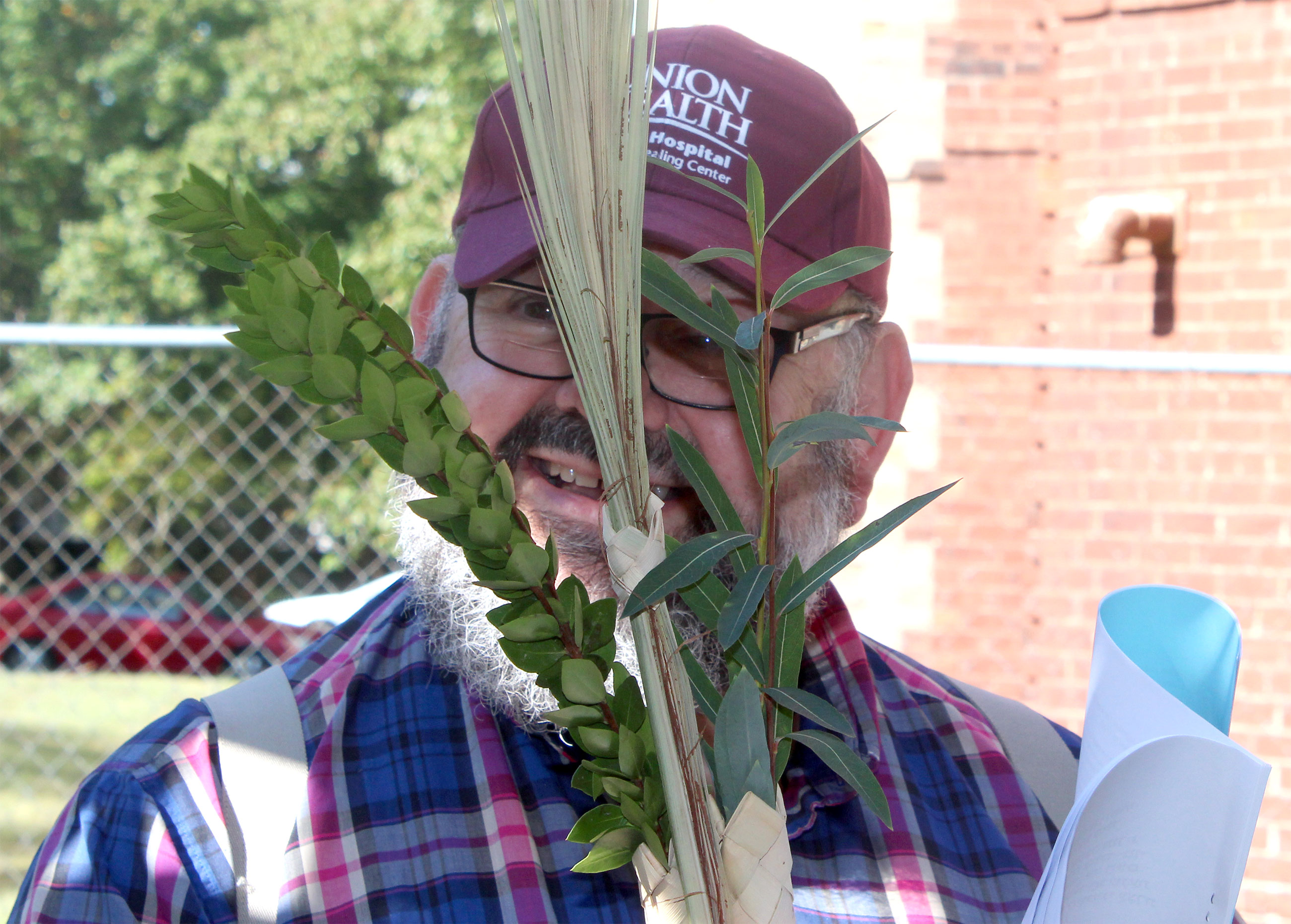 Herschel Chait led the Sukkot service and directed the ritual, as each participant faced east, waving lulav and etrog to west, north, above and below.
