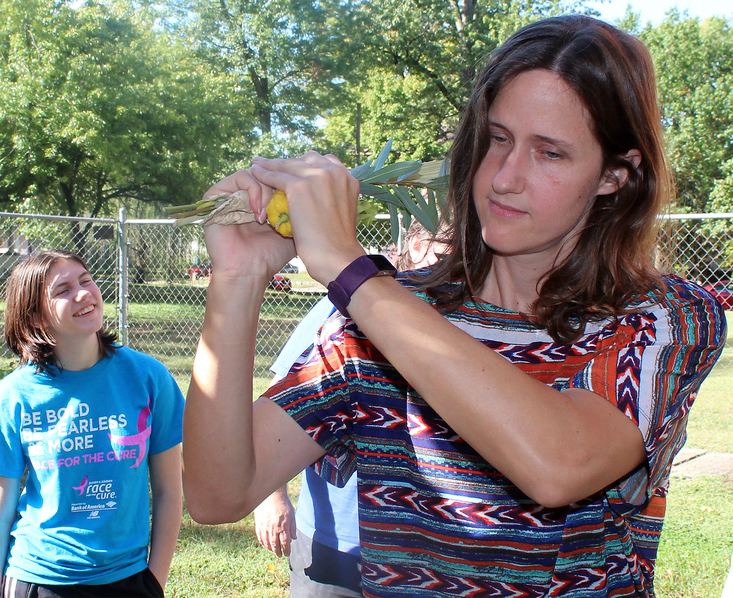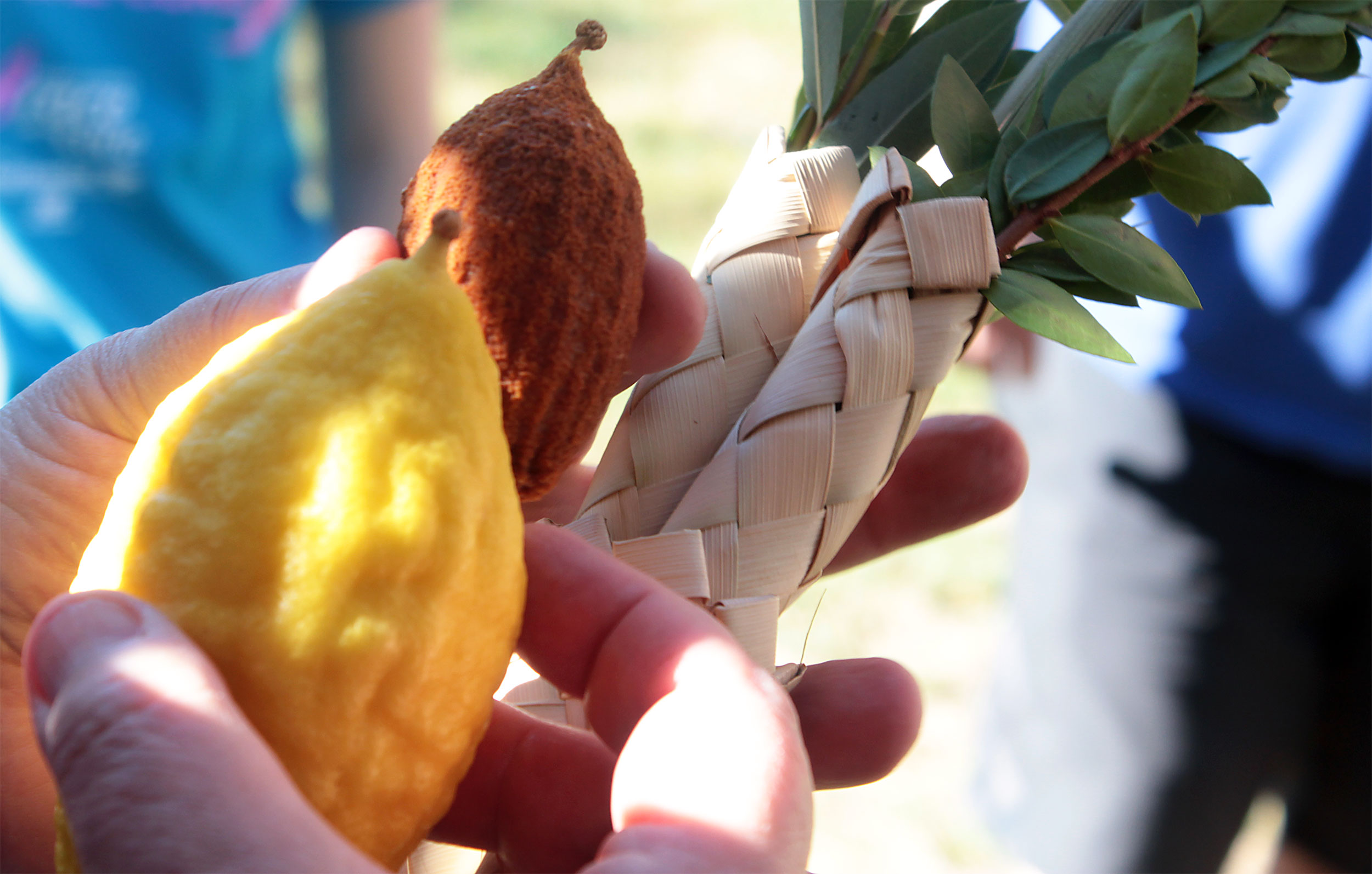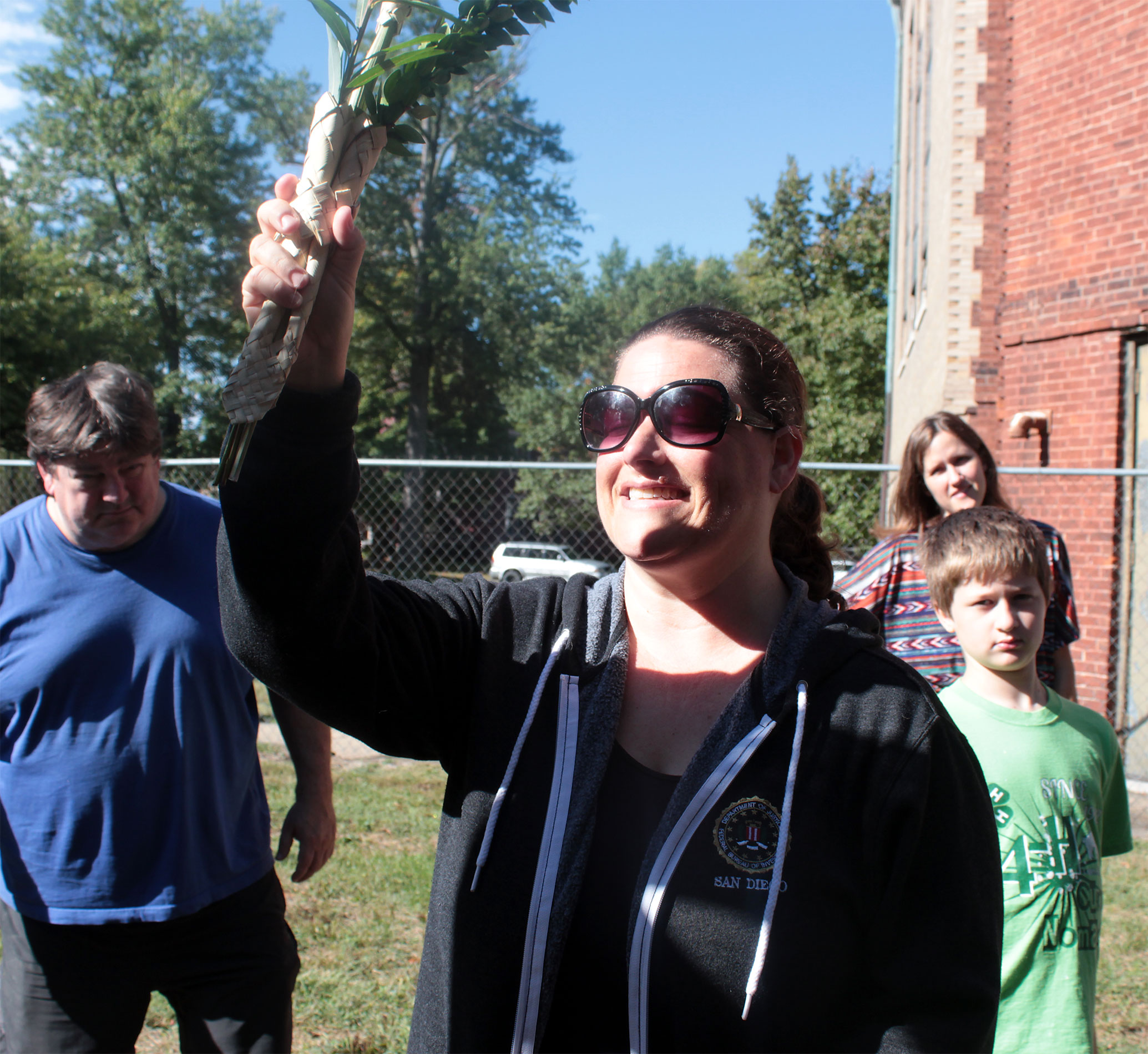 Everyone takes a turn waving lulav and etrog.