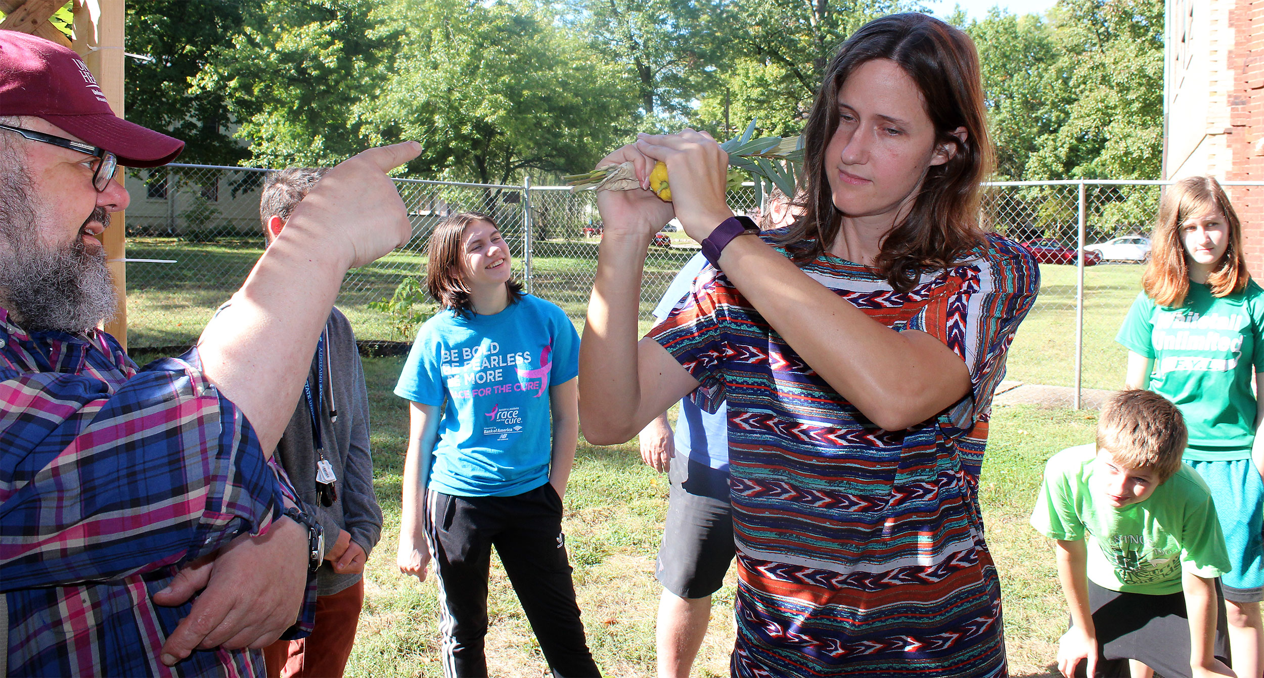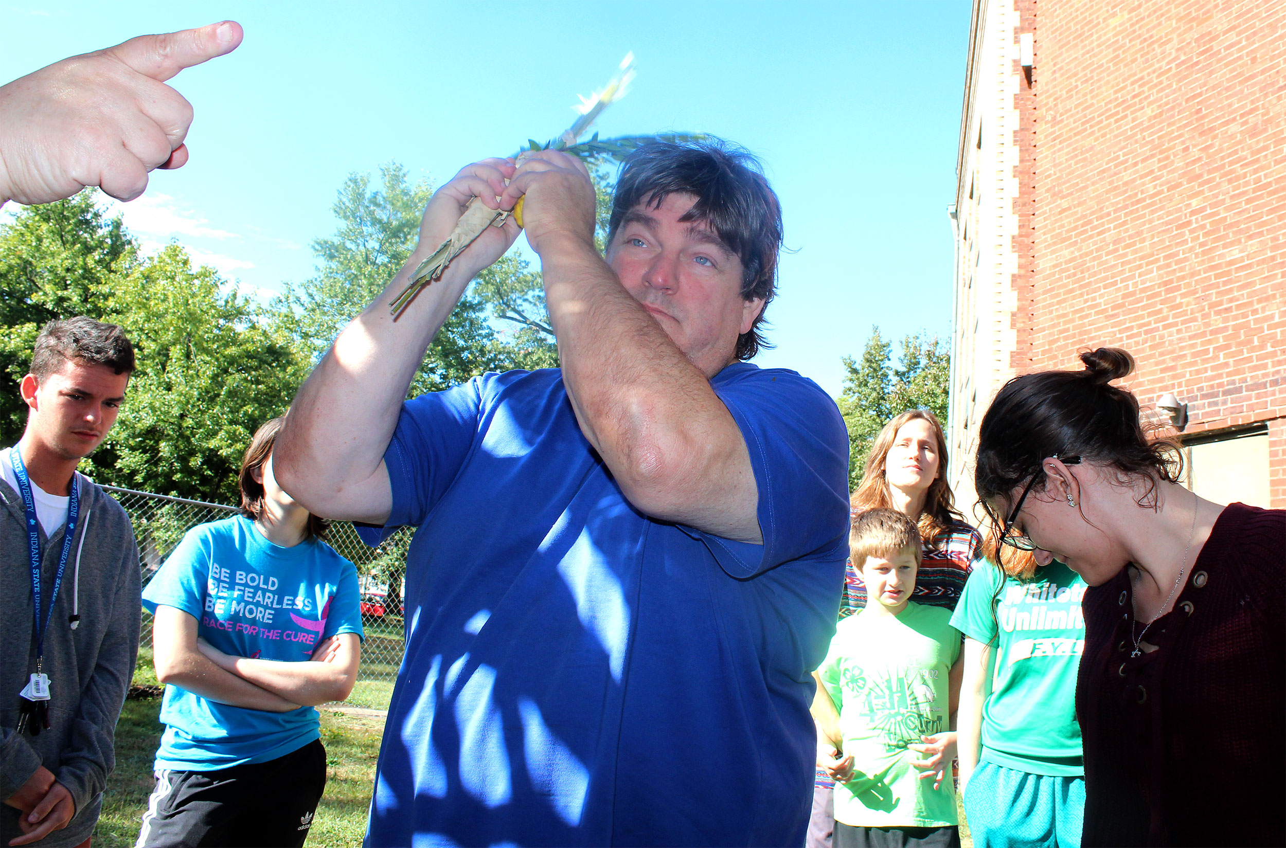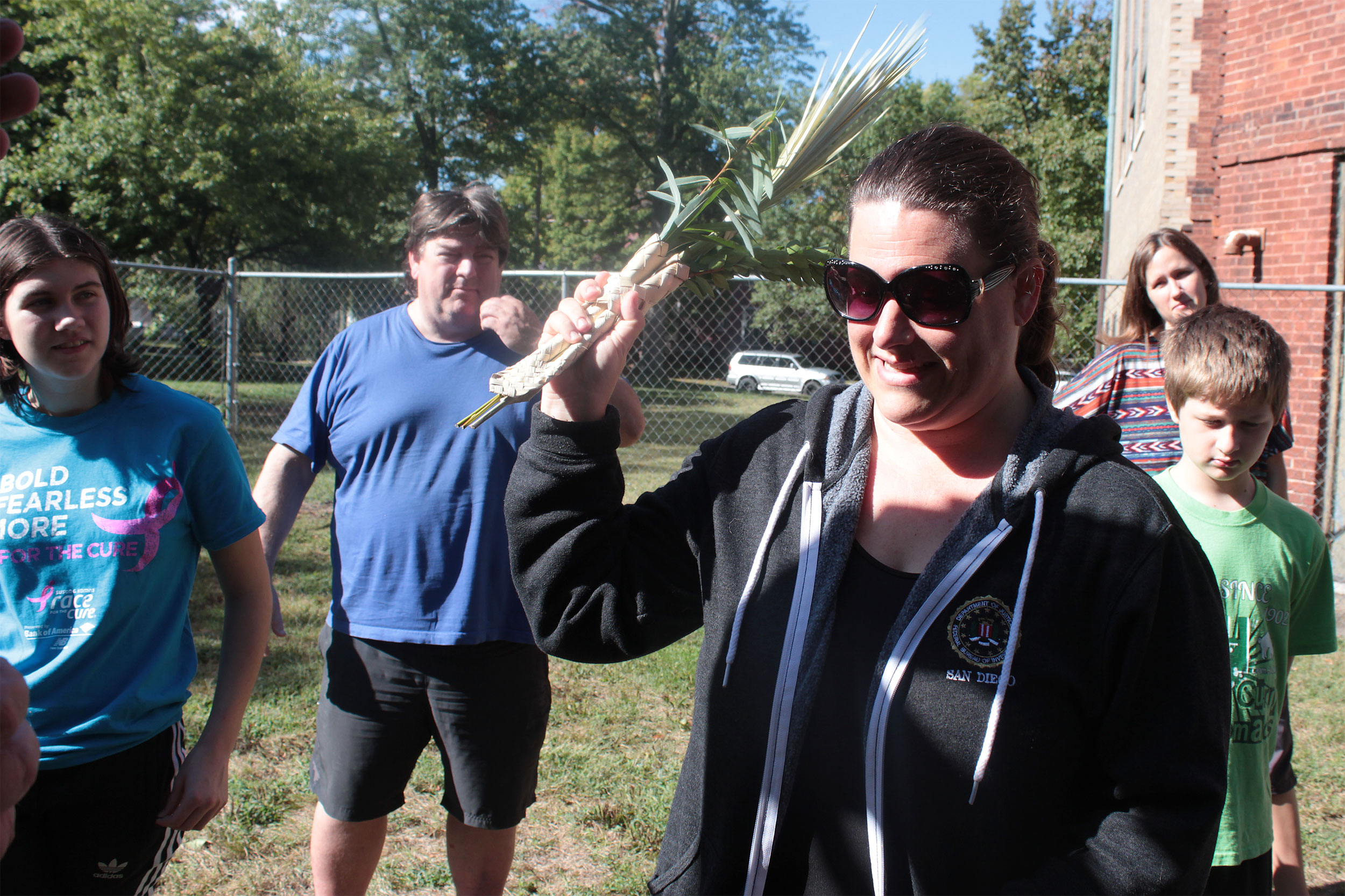 Everyone takes a turn waving lulav and etrog.