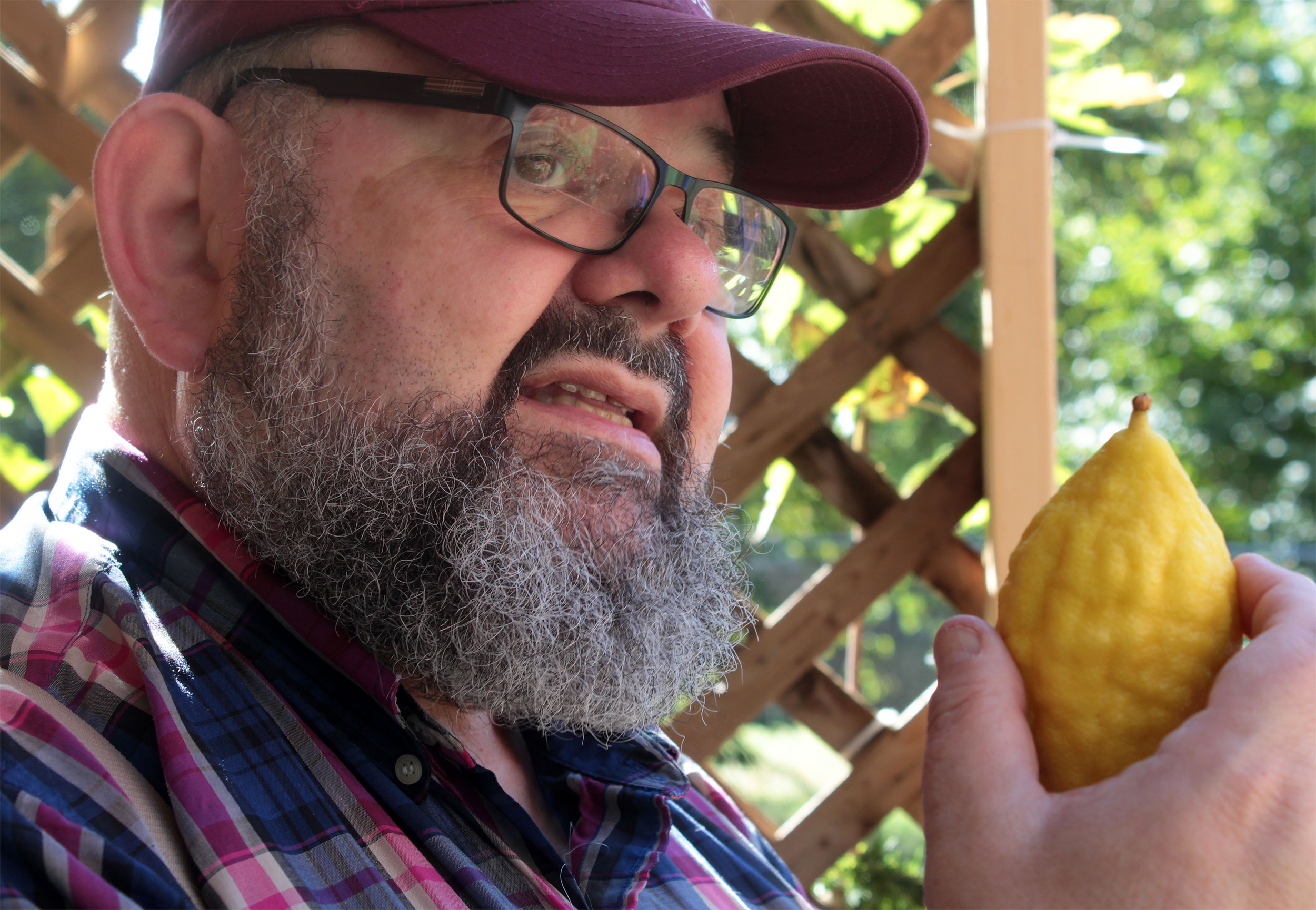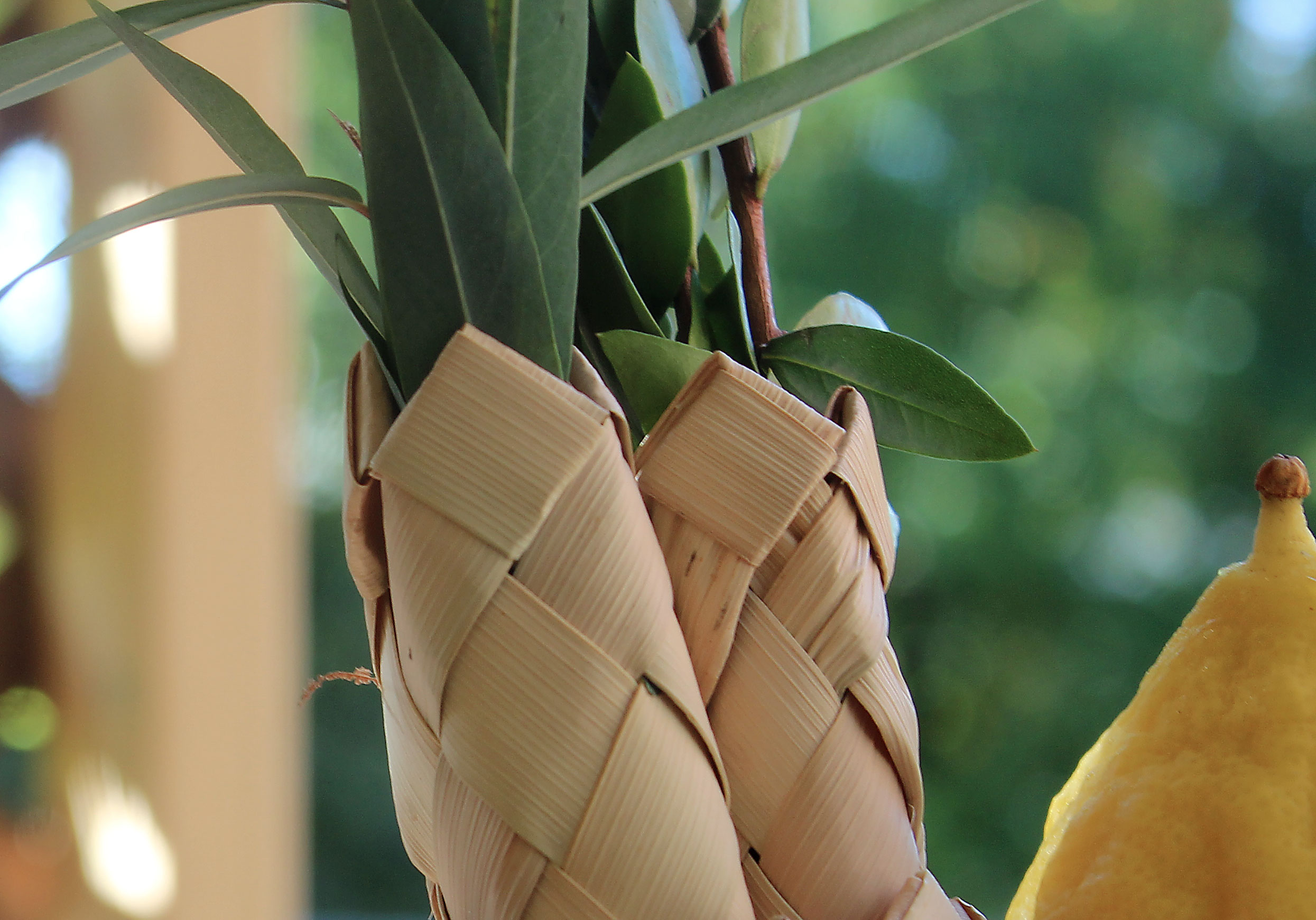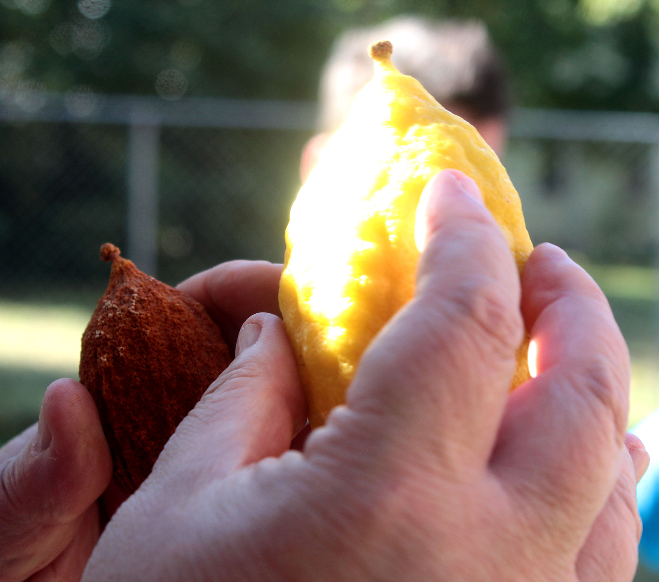 Herschel displays lulav and etrog, beside a now-dried etrog from two years ago.