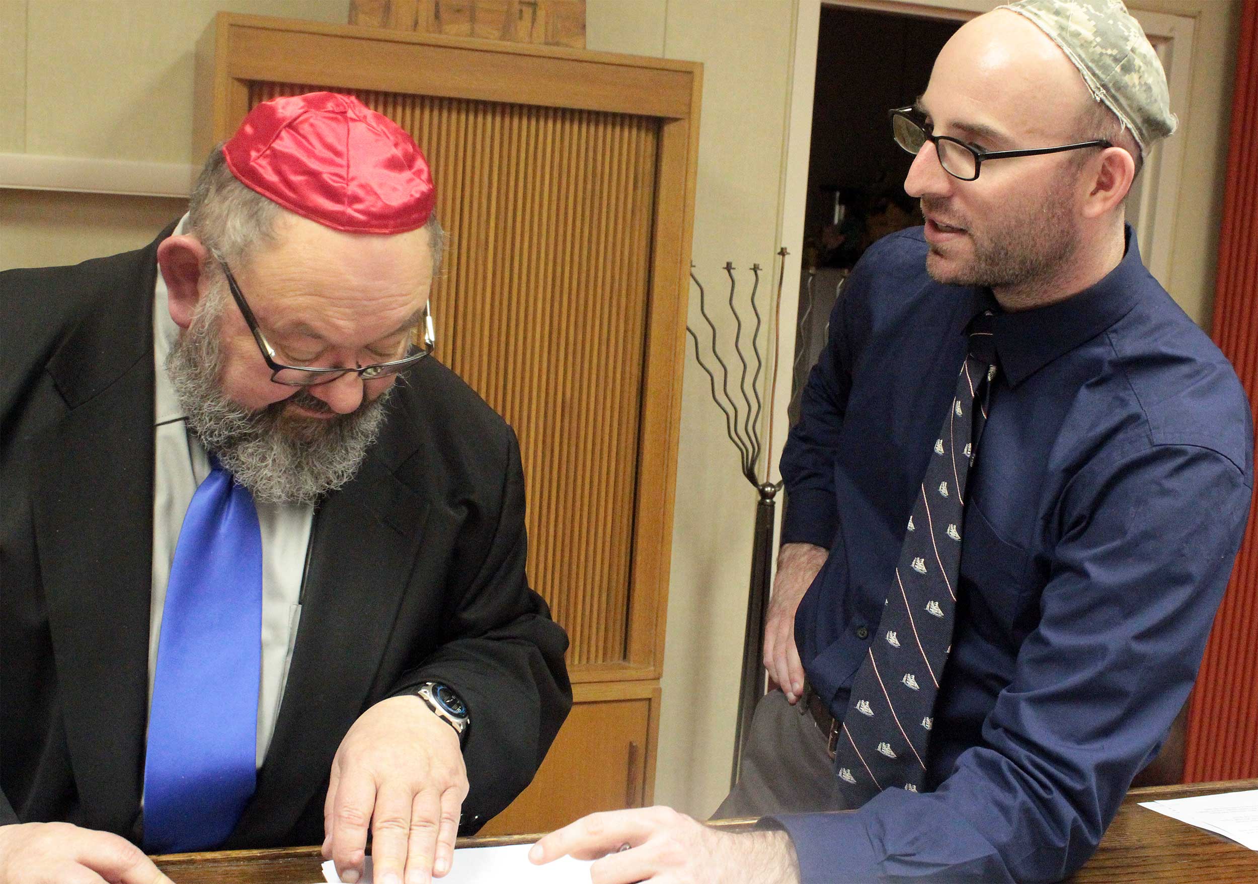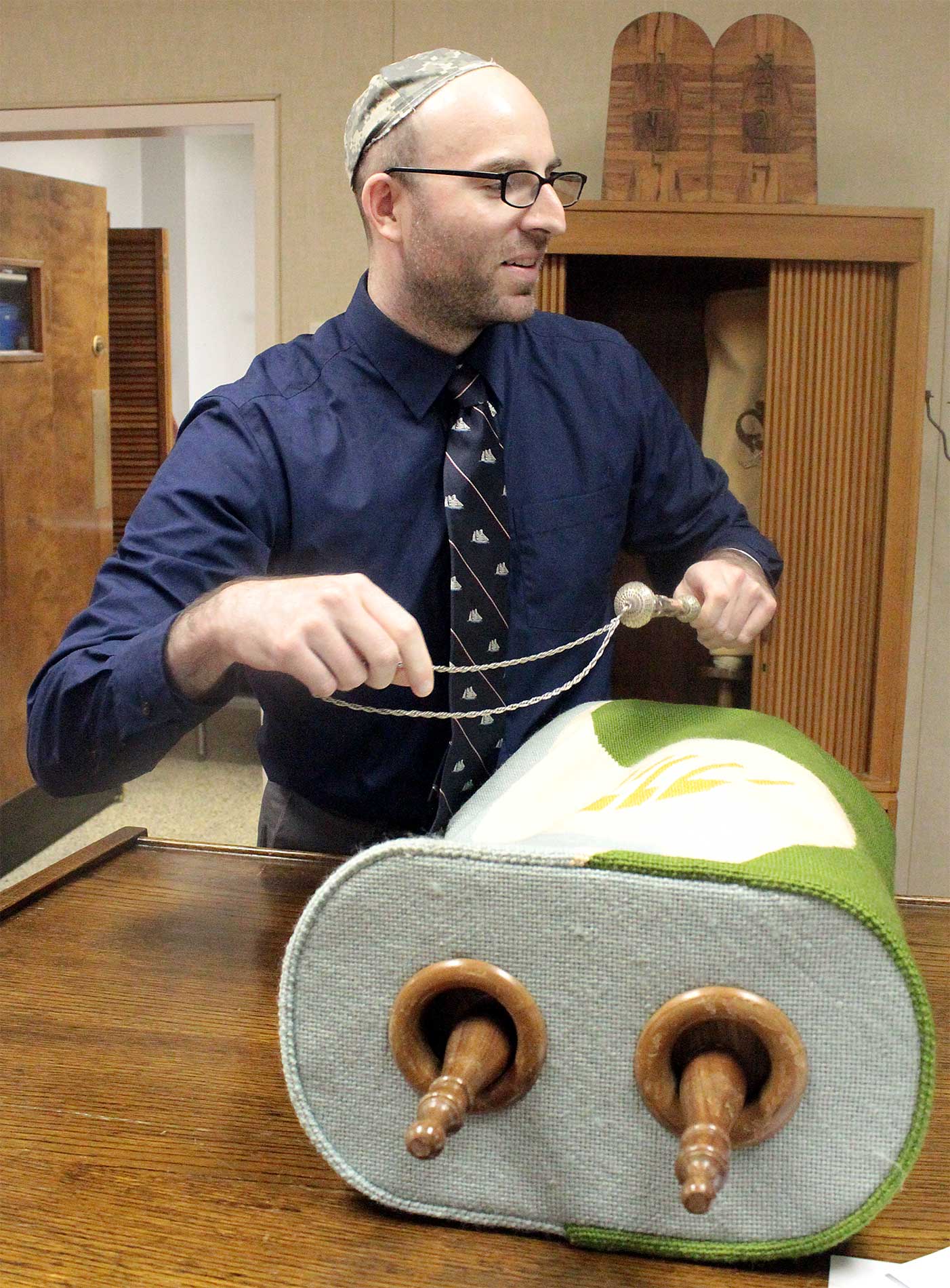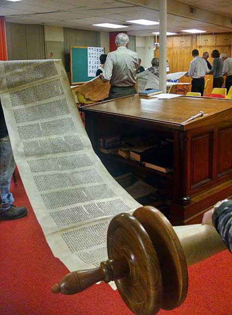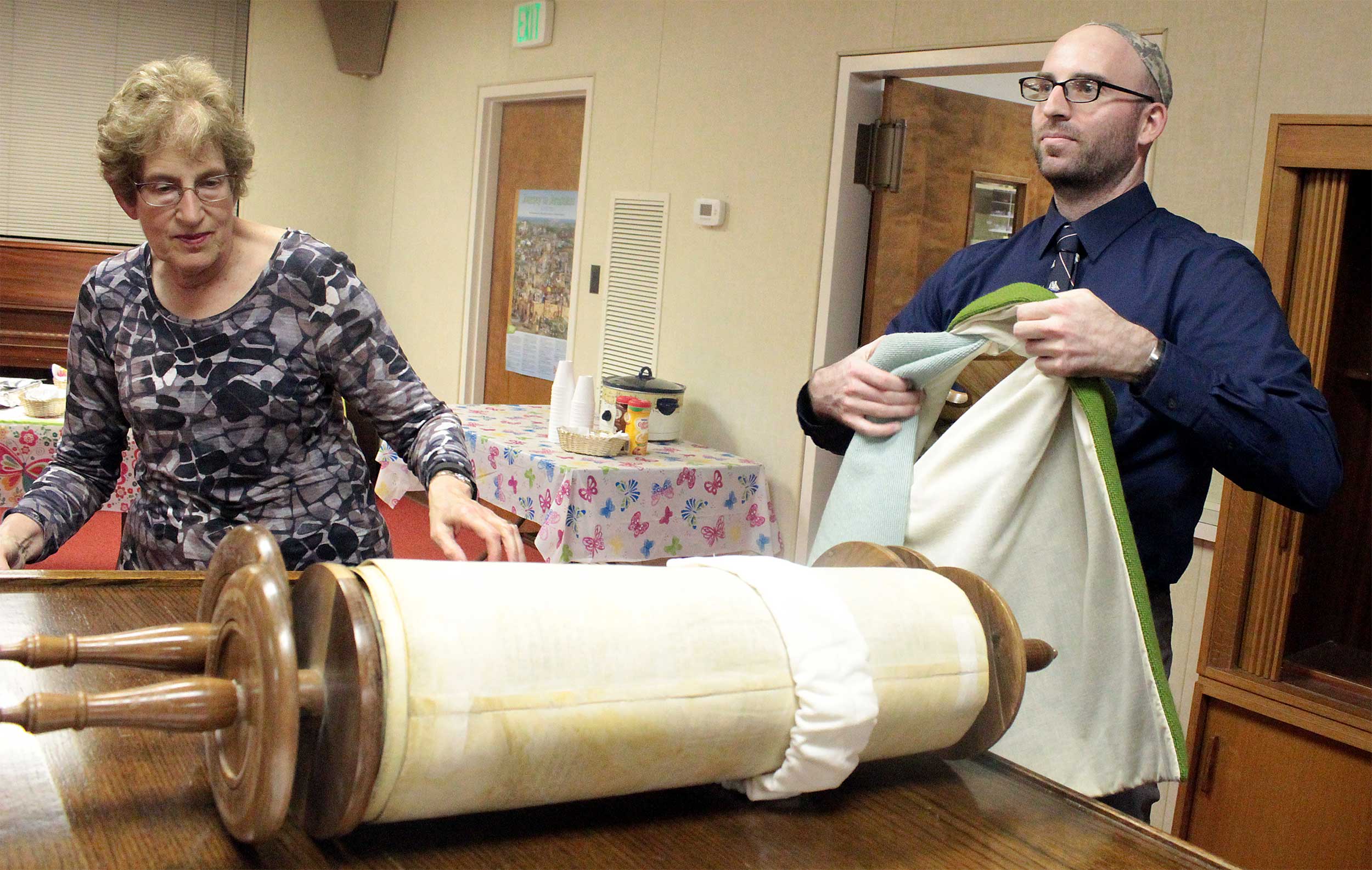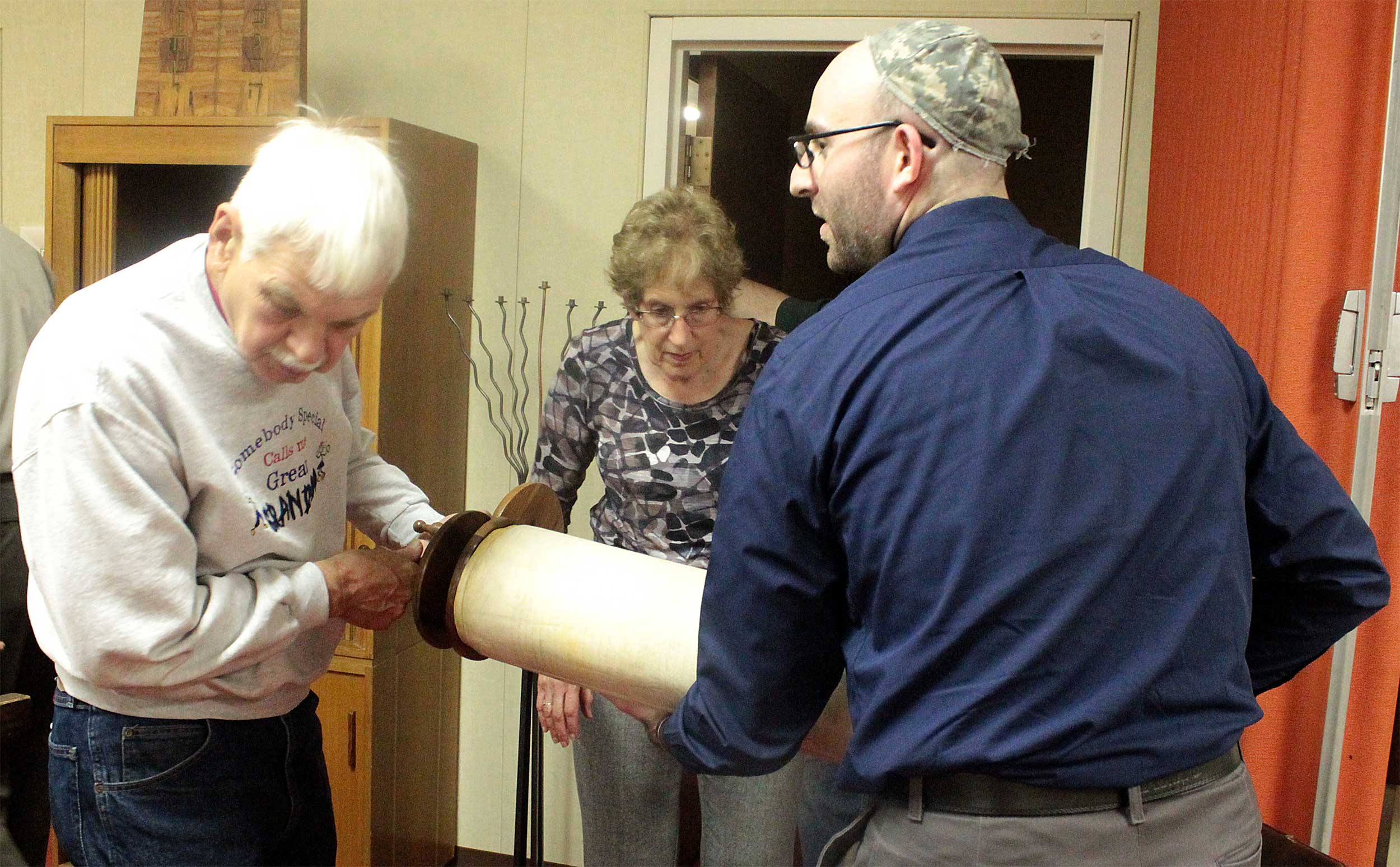 During a previous visit on Nov. 18, Rabbi Aaron prefaced Shabbat services by supervising a belated Simchat Torah celebration, as members unrolled the Torah to mark a new cycle of weekly readings.