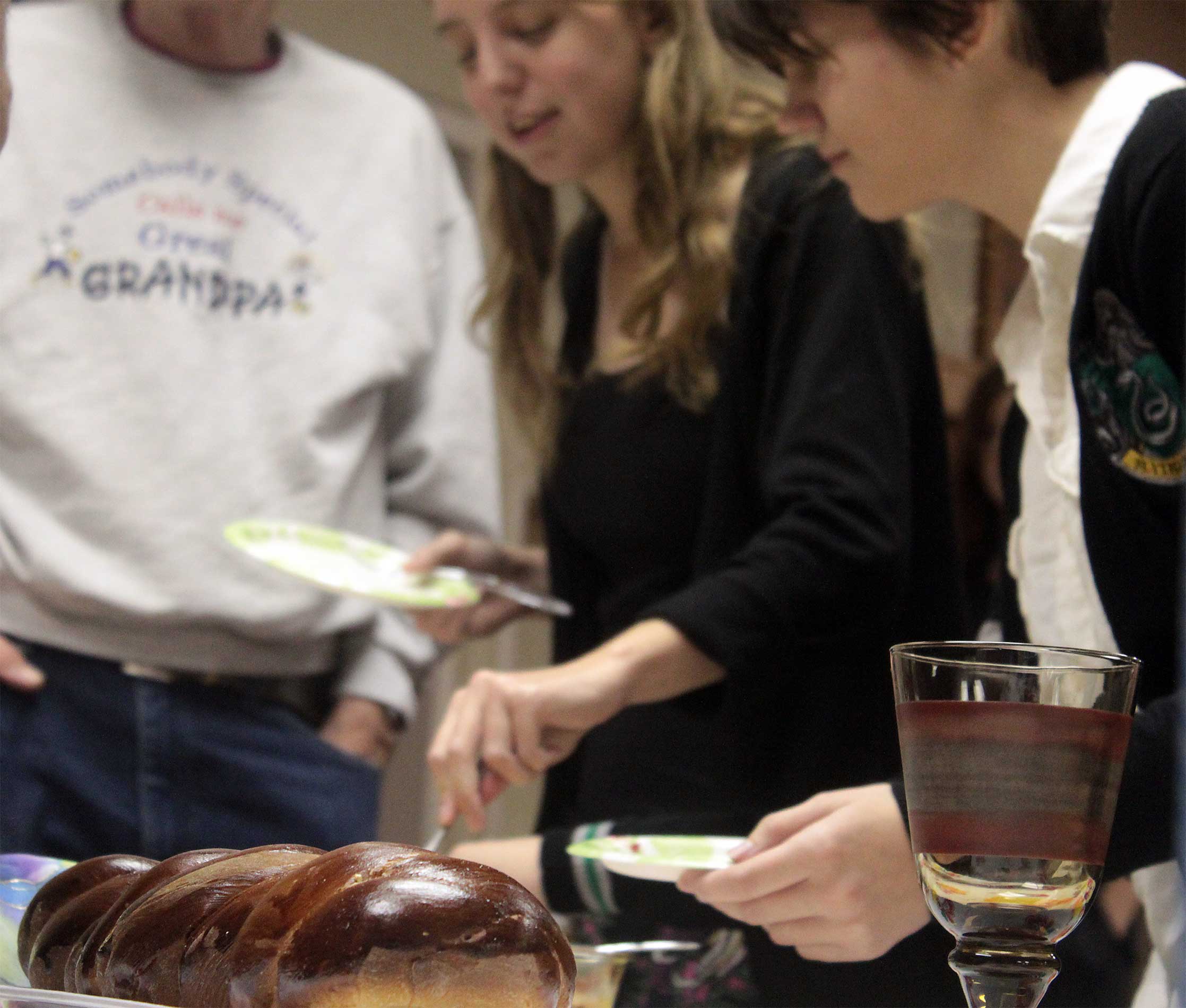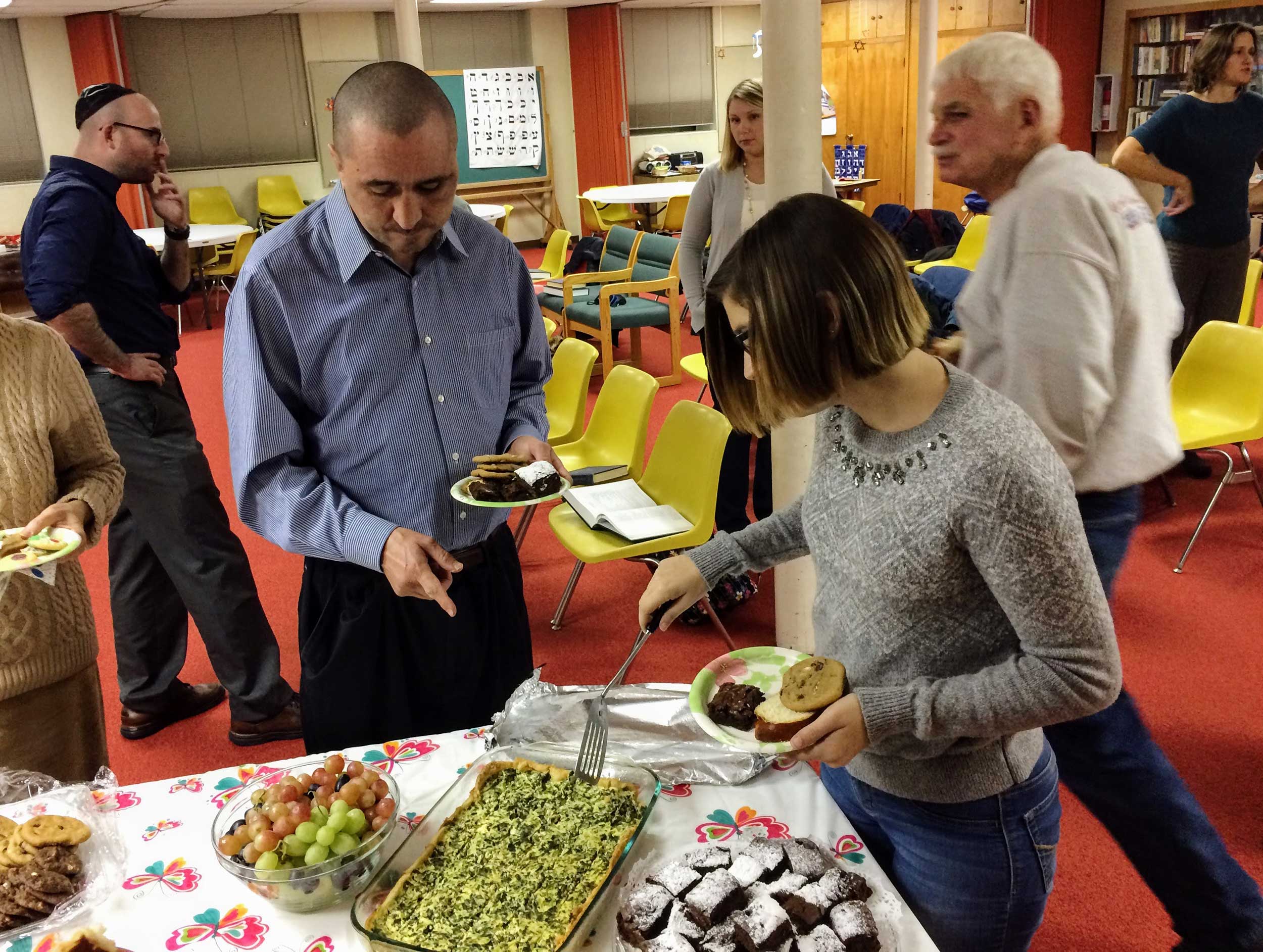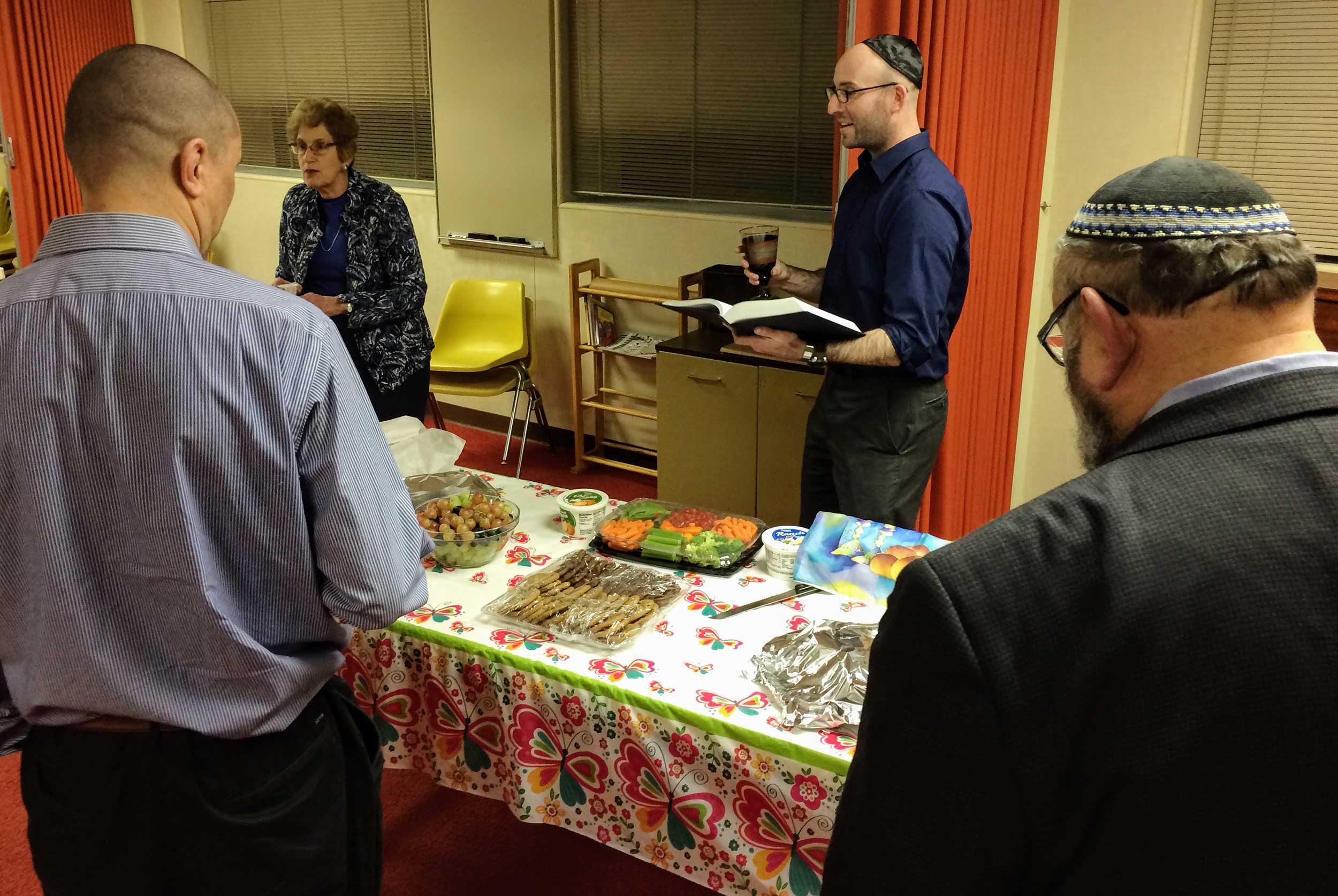 Student Rabbi Aaron Rozovsky led the kiddush and hamotzi following services on Dec. 9, before congregants and guests shared coffee, cake, quiche and good wishes.