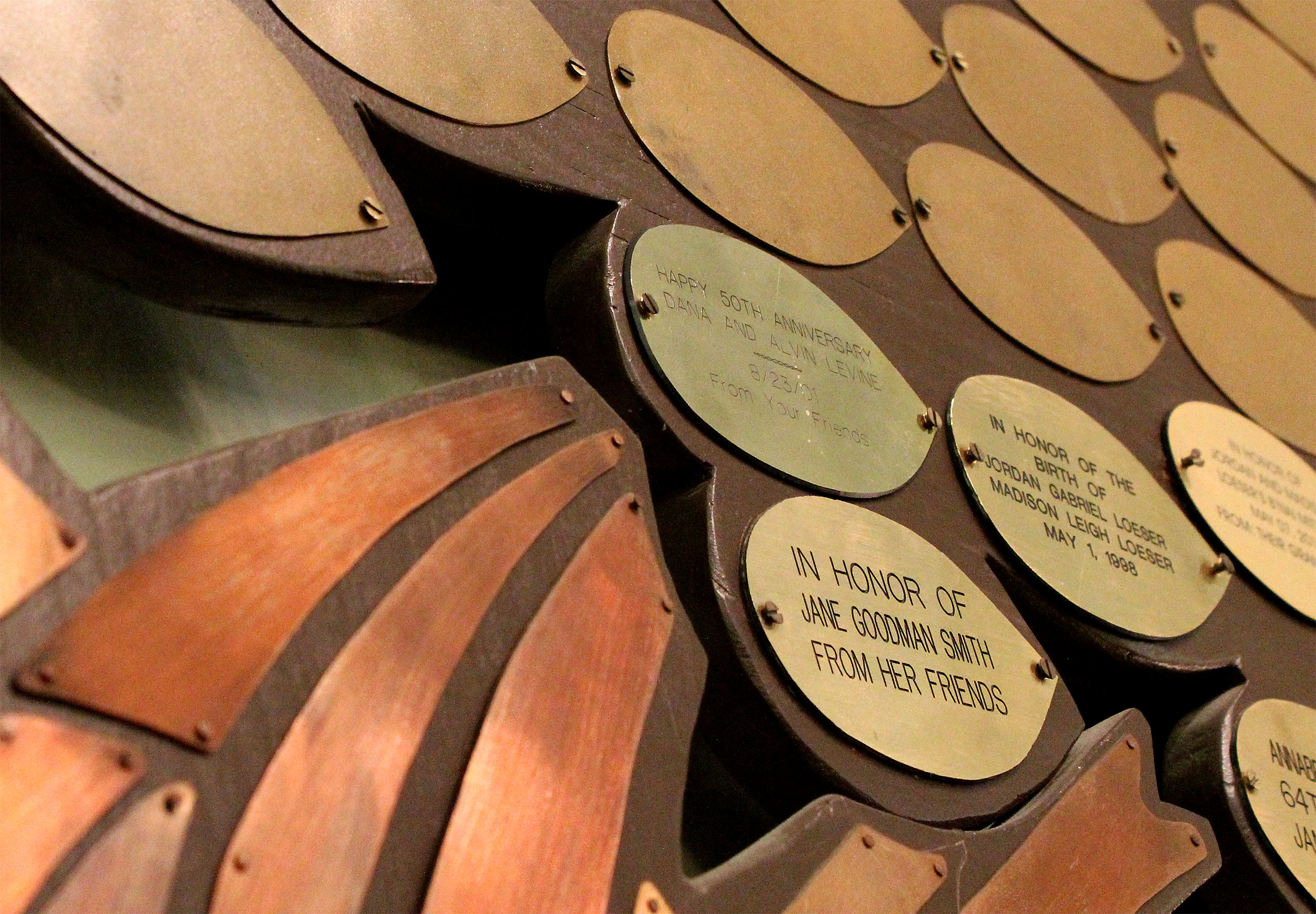 The Tree of Life is located on the back wall of the Temple Israel sanctuary. Congregants pay tribute to memorable events by adding leaves to the tree.