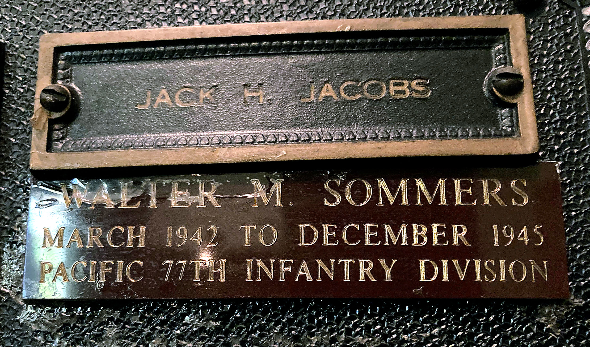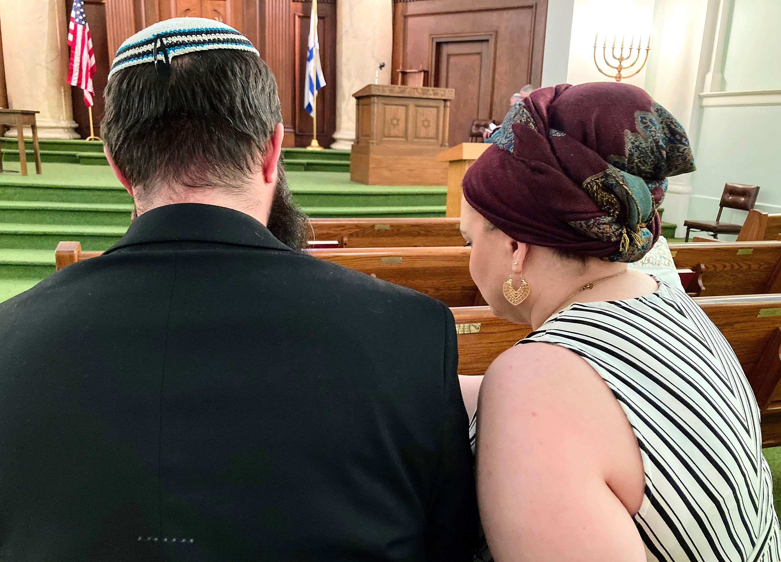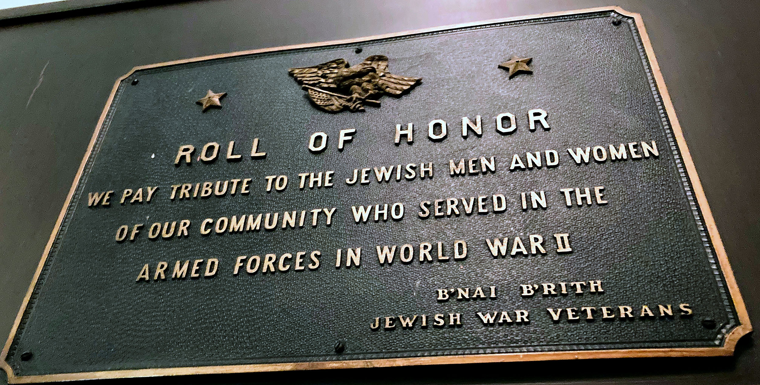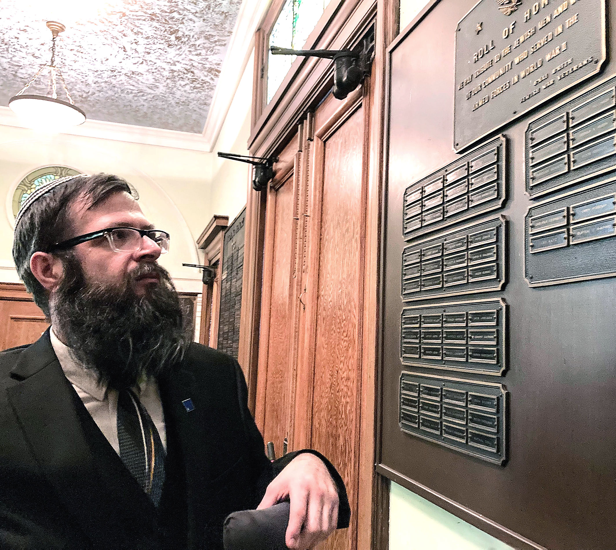 After Justin and Patricia attended Rosh Hashanah services, Justin paused in the entryway outside the sanctuary to review the congregation’s World War II Roll of Honor. Names included the late Walter Sommers and Herbert Kaufman, the only UHC member to fall in battle.