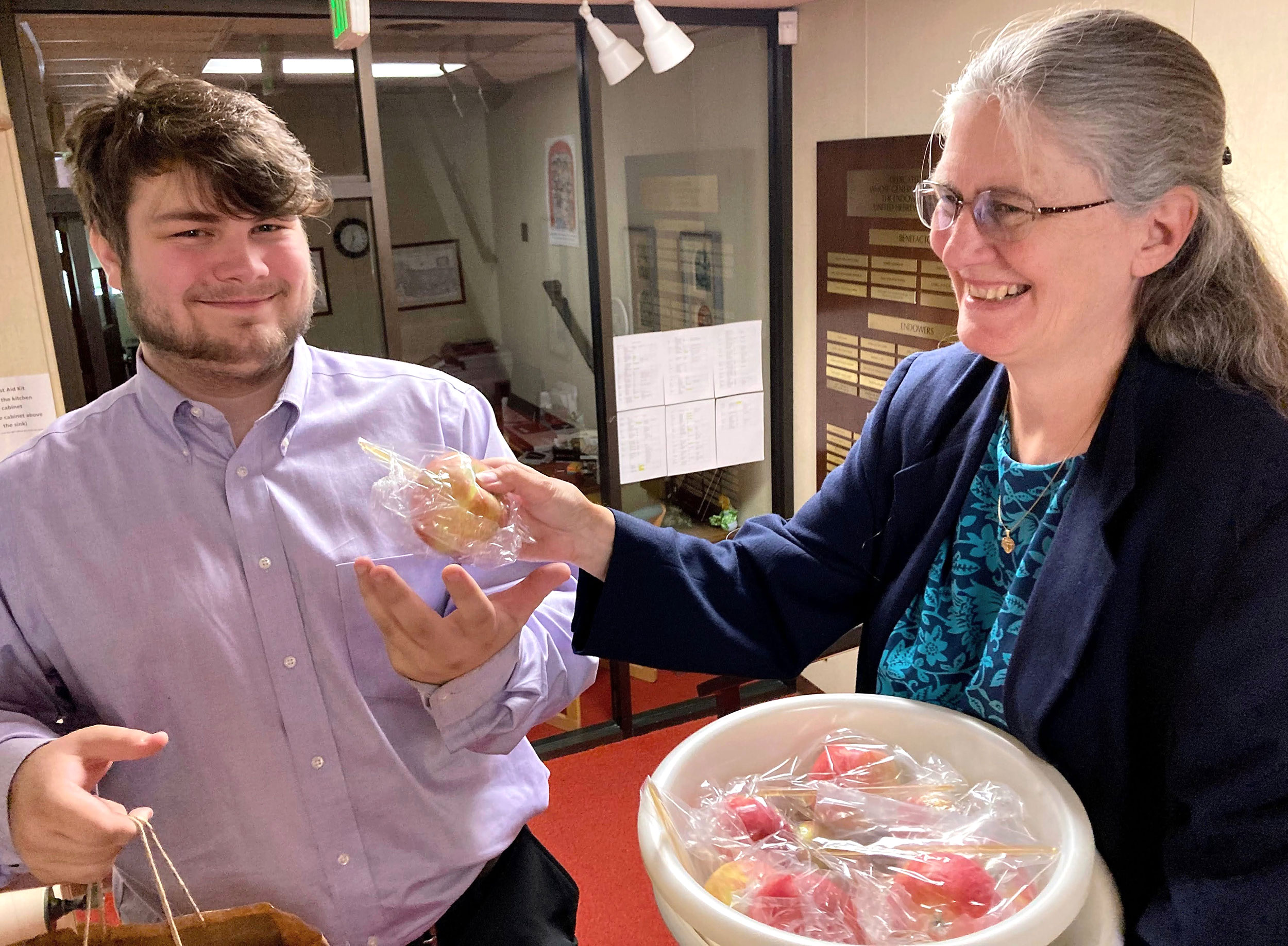 Here, Debra hands an apple to Izaak outside the Vestry Room. Lee, Tim and their son Zane baked vegan snacks for an impromptu oneg on Erev Rosh Hashanah.